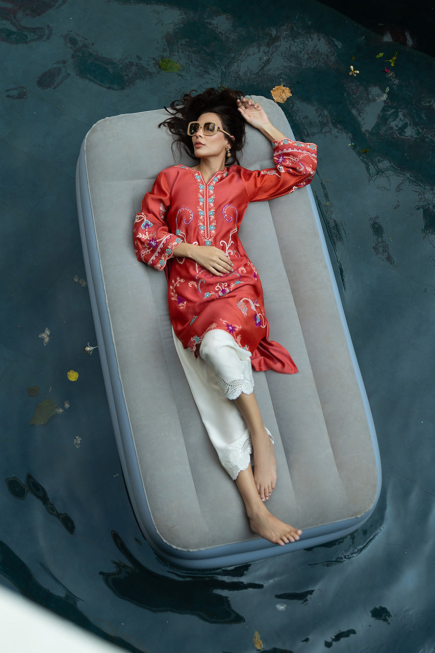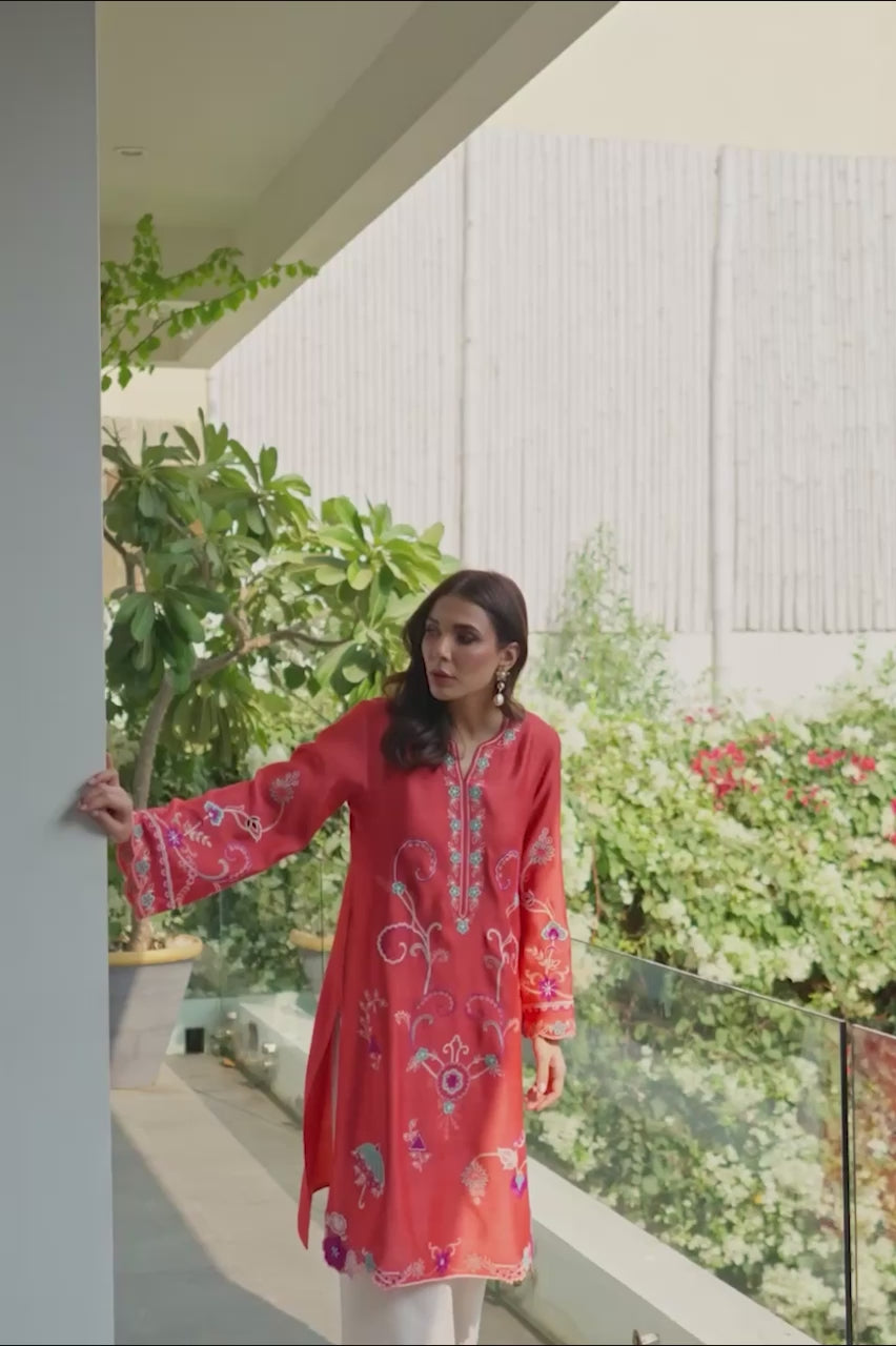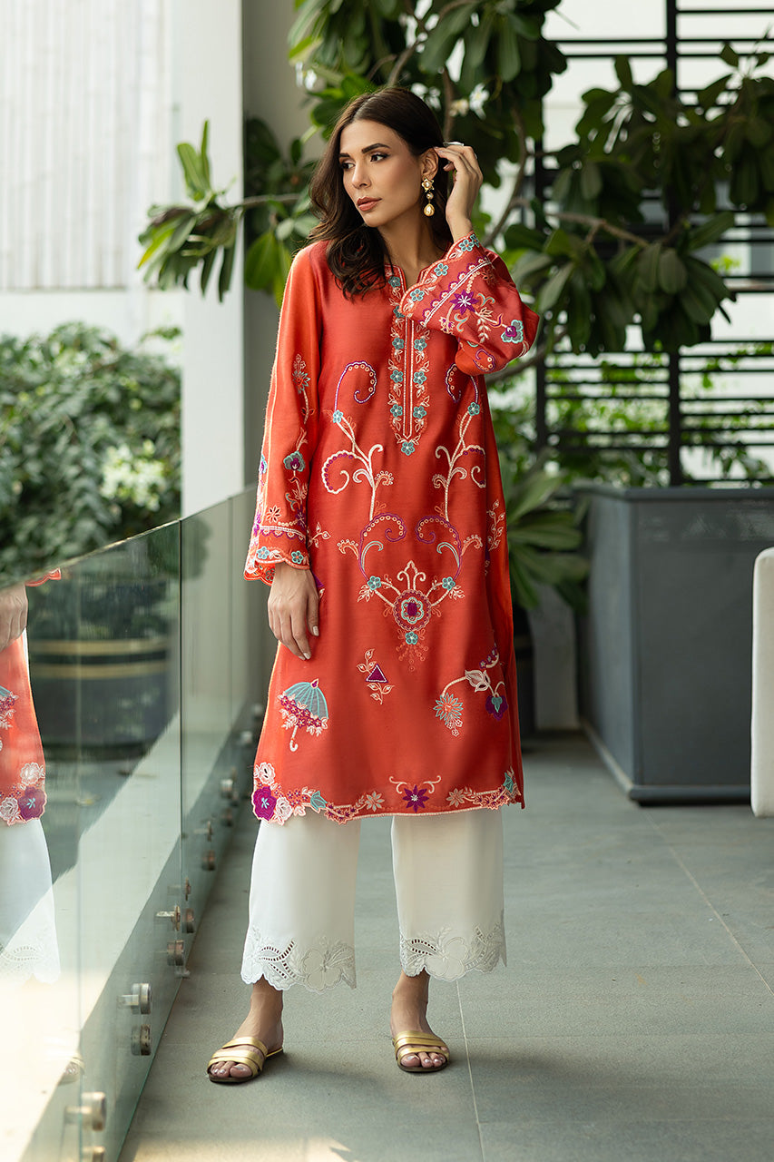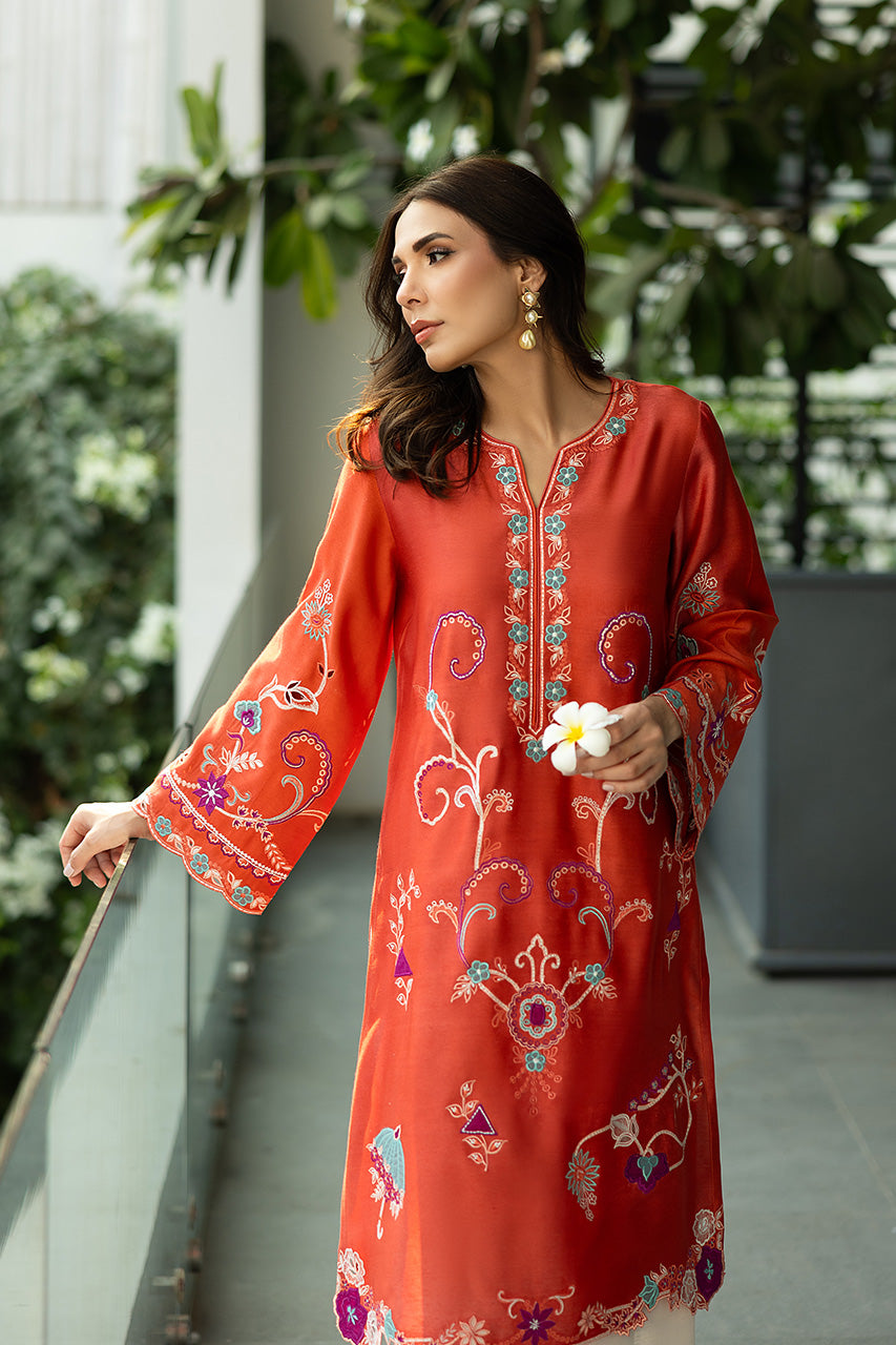 Draped in the warm embrace of rust tones and blooming embroideries, this knee-length khadi silk shirt is a perfect option for a sophisticated yet effortless look. Graced with floral threadwork, flared sleeves, delicately done cutwork details, and scalloped finishing, the shirt possesses a silhouette of allure. Paired with white khadi cotton pants finished with complementing floral cutwork and scalloped finishing, this outfit is an ideal choice for daytime festivities, intimate gatherings, or any occasion where elegance comes first!
