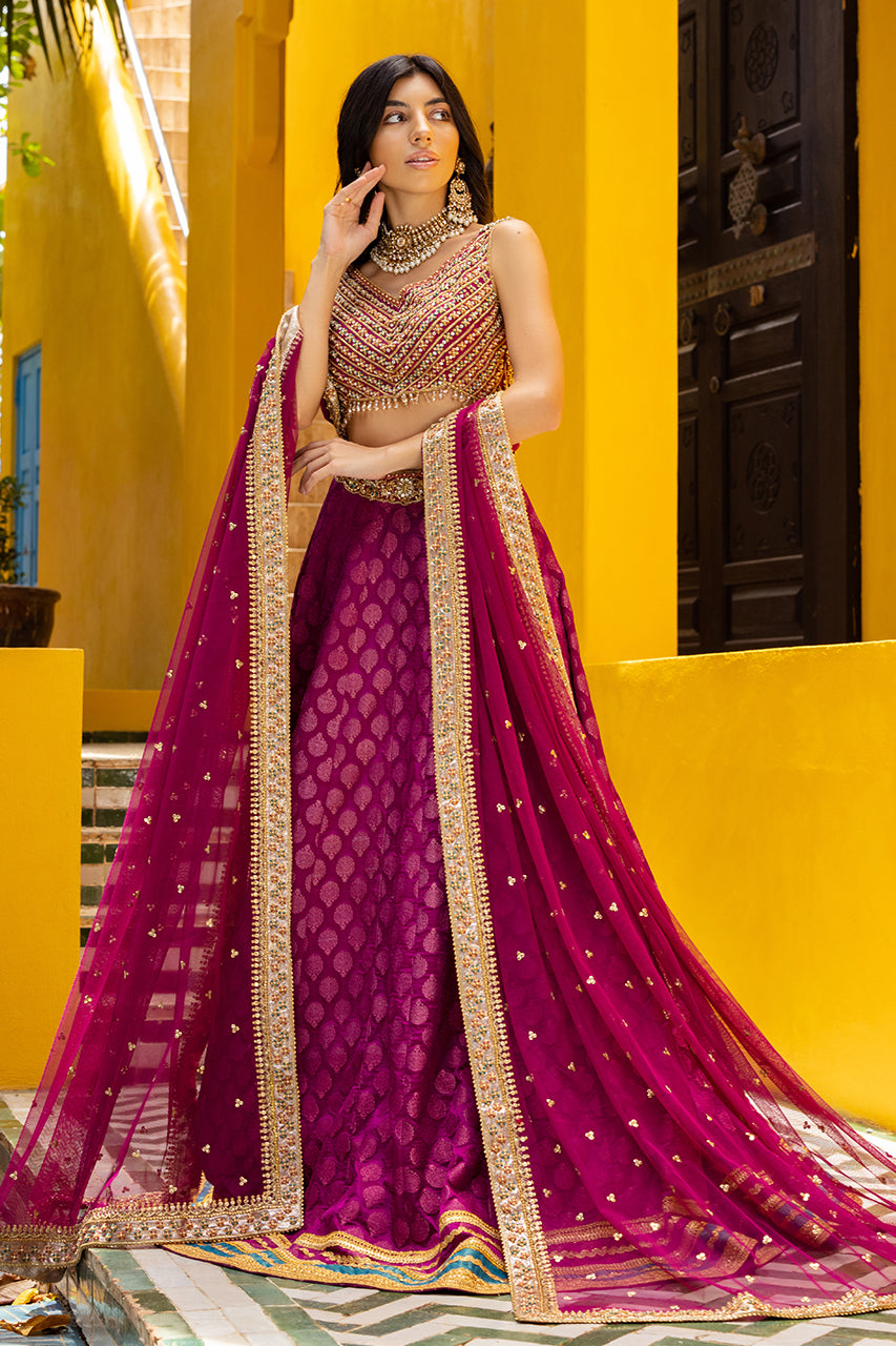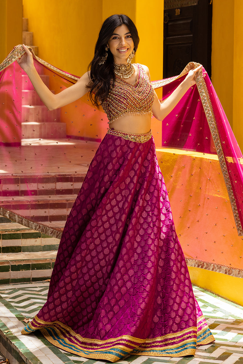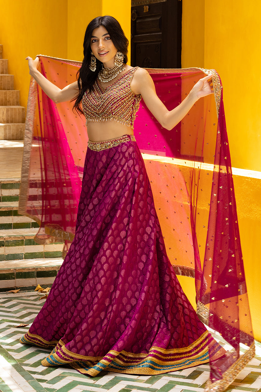 Embrace the allure of the Crimson Charm - Blending magenta raw silk with intricate embroidery, this mehndi silhouette is a masterpiece. The timeless choli features an elegant sleeveless design, while lace on the jamawar lehenga adds refinement. A handcrafted dupatta, adorned with delicate embroidery and sparkling sequins, tells a story of tradition entwined with modernity. Embrace maroon's opulence, letting your charm create a timeless echo.