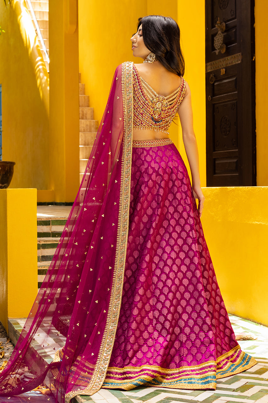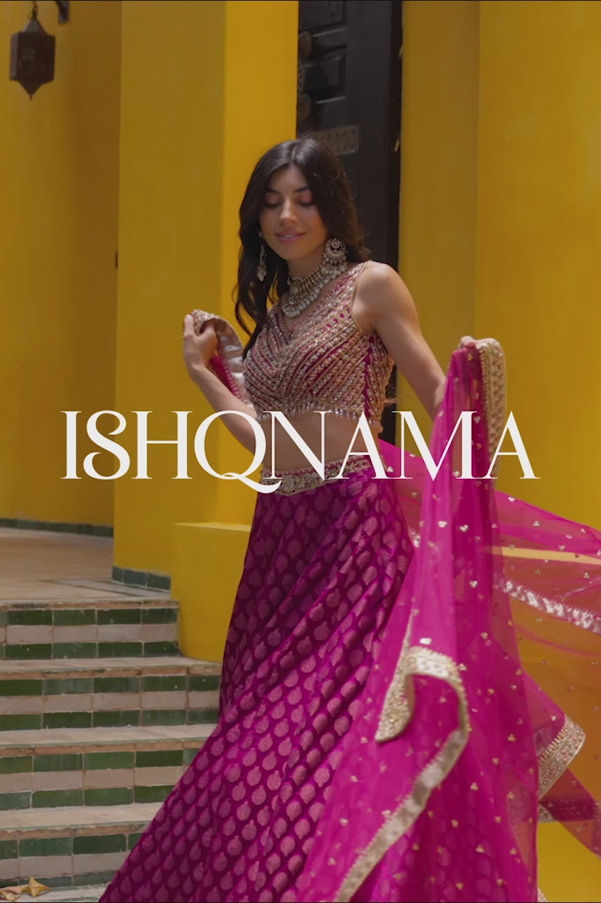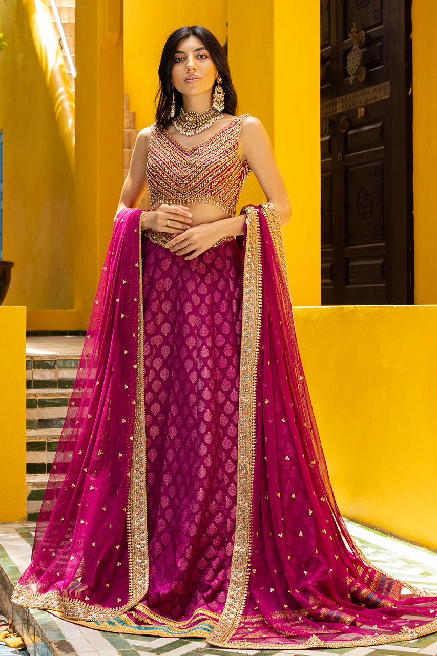 Embrace the allure of the Crimson Charm - Blending magenta raw silk with intricate embroidery, this mehndi silhouette is a masterpiece. The timeless choli features an elegant sleeveless design, while lace on the jamawar lehenga adds refinement. A handcrafted dupatta, adorned with delicate embroidery and sparkling sequins, tells a story of tradition entwined with modernity. Embrace maroon's opulence, letting your charm create a timeless echo.