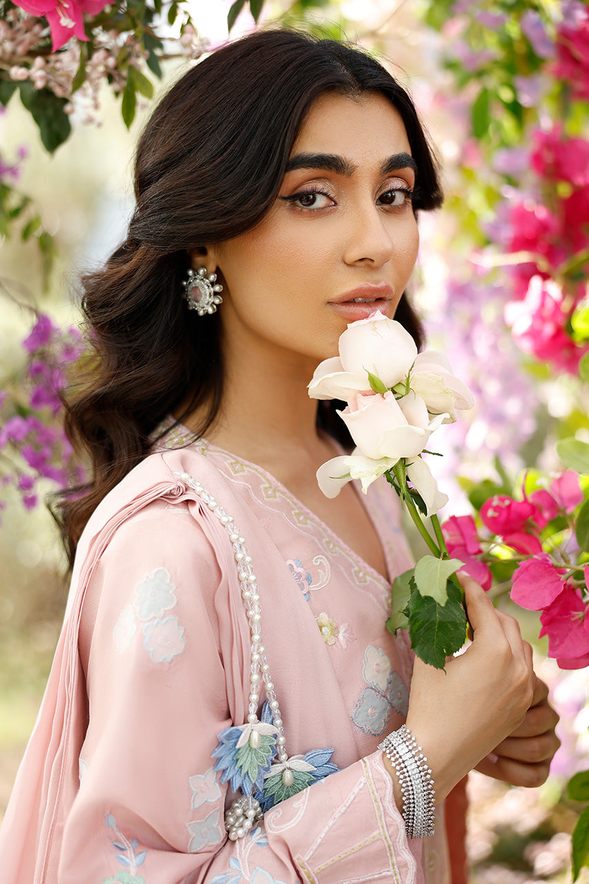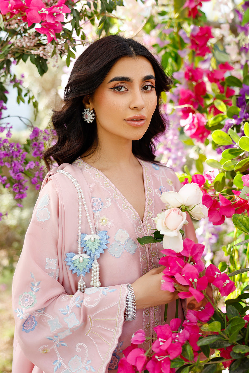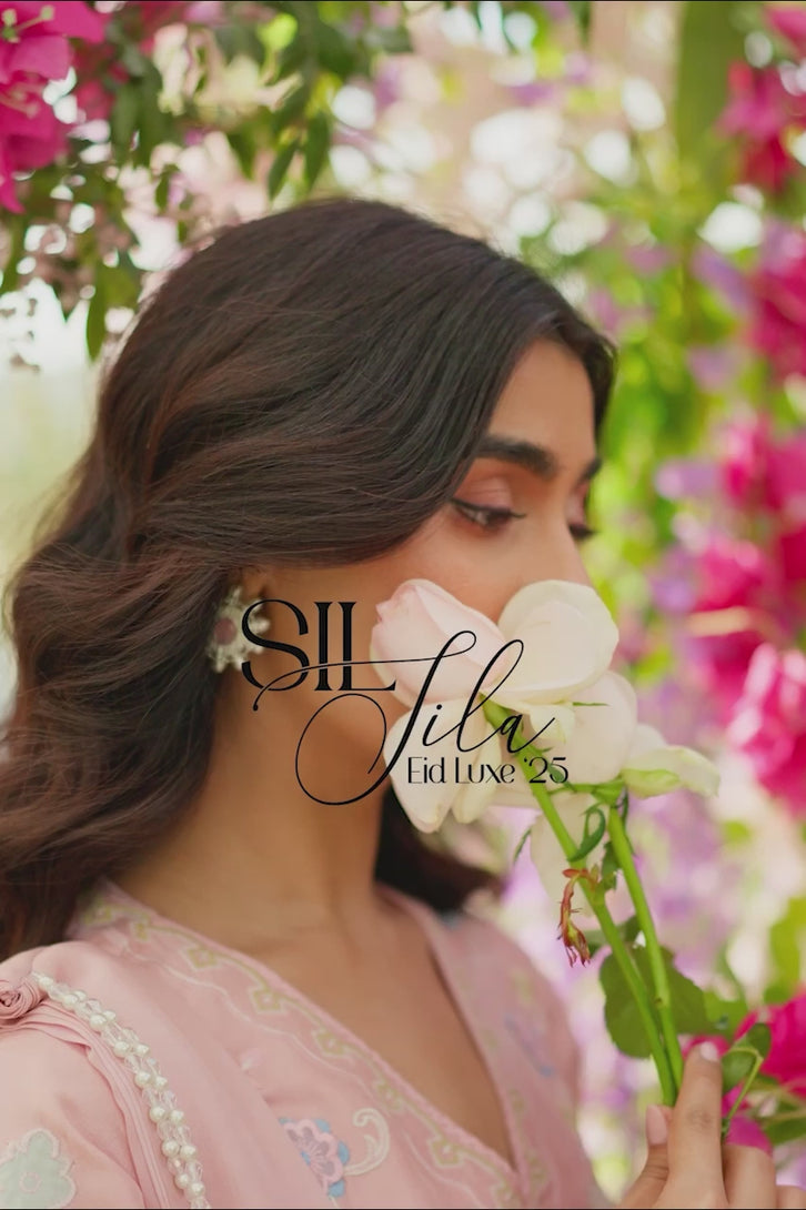 Elevate your style with this must-have ensemble, featuring a ravishing Baby Pink Raw Silk shirt that commands attention. The intricate contrasting applique work and embroidery on the front create a rich, opulent look that exudes luxury and sophistication. The shirt is beautifully paired with raw silk free flowing pants, which provide a flattering and comfortable fit. To complete this breathtaking ensemble, a draped silk dupatta with tassels hanging delicately at the edges adds a touch of drama and whimsy.