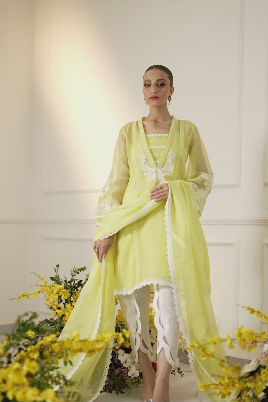 Experience the sunny essence with our enchanting Daffodil. Designed for a delightful day outdoors, this yellow cotton net ensemble combines grace and comfort. The flared shirt features captivating 3D designs, adding whimsy and playfulness. Delicate lace detailing on the slip and intricate cutwork tulip trousers elevate the outfit to effortless chicness. Complete with a cotton net dupatta that invites you to twirl with grace.