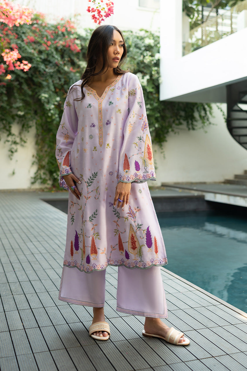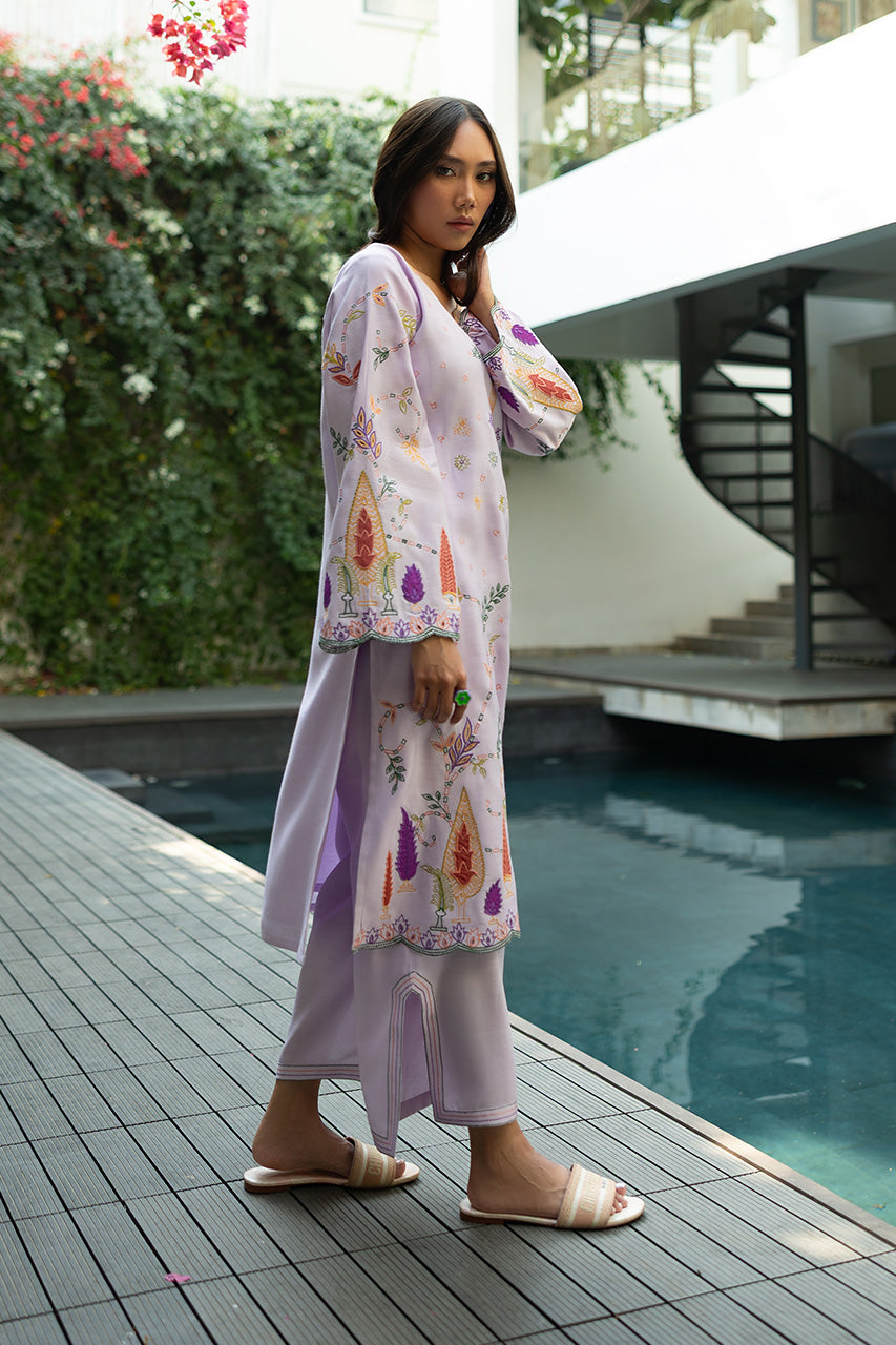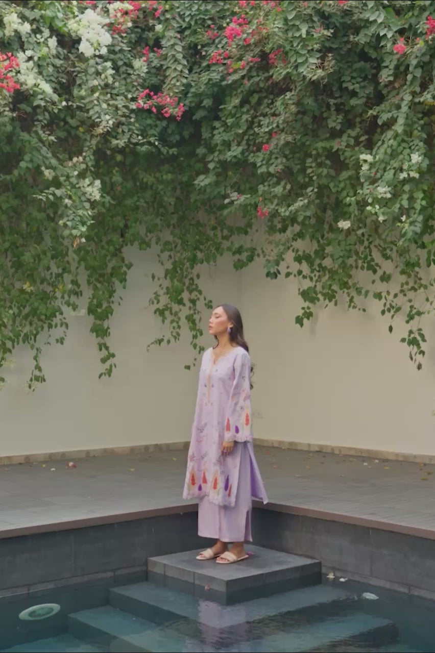 This exquisite lilac knee-length khadi silk shirt with full sleeves is a perfect blend of elegance and intricate craftsmanship. The shirt features a unique combination of floral and geometric patterns, brought to life with delicate thread embroidery and cutwork that add texture and dimension to the design. The scalloped borders on both the sleeves and hemline bring a soft, feminine touch, elevating the overall aesthetic. The unique arrangement of design elements creates a light, luminous effect, making the shirt visually captivating. Paired with matching lilac khadi cotton pants, featuring a refined finishing border at the hem, the ensemble creates a graceful and sophisticated silhouette. The soft lilac shade, combined with the intricate embroidery and cutwork, makes this outfit perfect for special occasions, exuding both contemporary charm and timeless beauty.