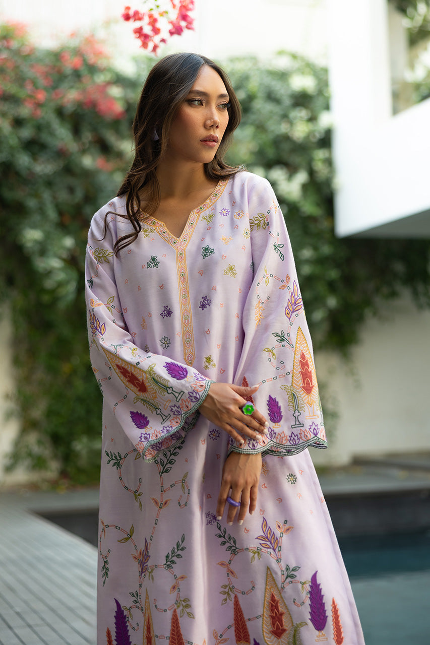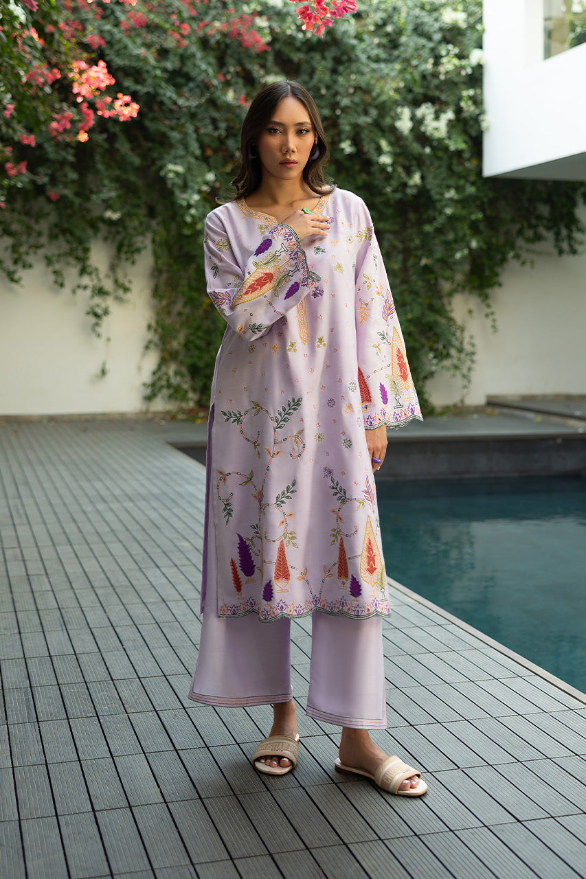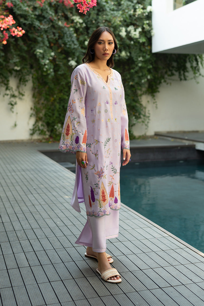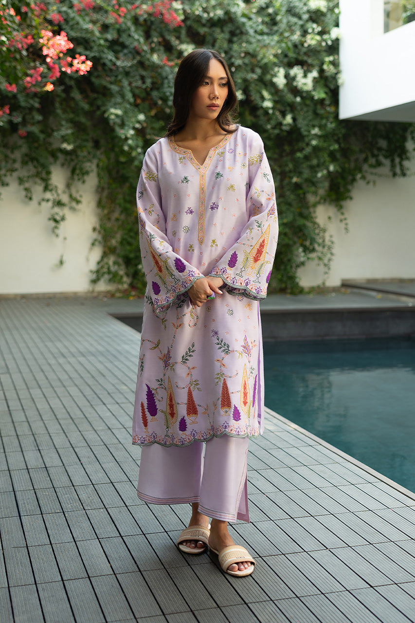 This exquisite lilac knee-length khadi silk shirt with full sleeves is a perfect blend of elegance and intricate craftsmanship. The shirt features a unique combination of floral and geometric patterns, brought to life with delicate thread embroidery and cutwork that add texture and dimension to the design. The scalloped borders on both the sleeves and hemline bring a soft, feminine touch, elevating the overall aesthetic. The unique arrangement of design elements creates a light, luminous effect, making the shirt visually captivating. Paired with matching lilac khadi cotton pants, featuring a refined finishing border at the hem, the ensemble creates a graceful and sophisticated silhouette. The soft lilac shade, combined with the intricate embroidery and cutwork, makes this outfit perfect for special occasions, exuding both contemporary charm and timeless beauty.