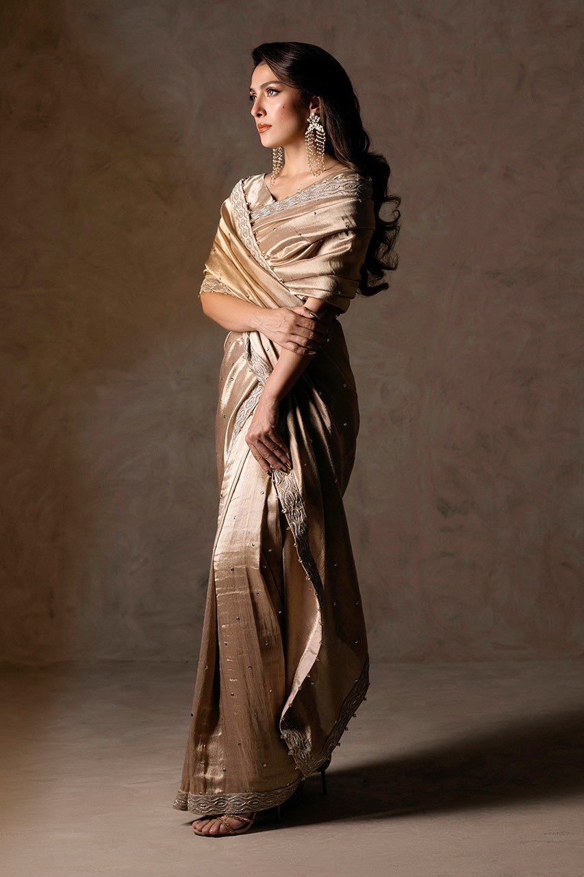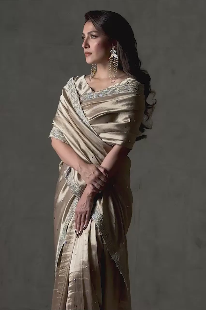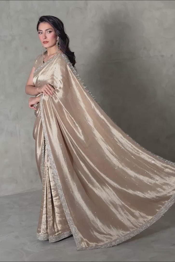A stunning light gold Masuri saree, known for its grace and sophistication. Made from premium Masuri fabric, it features a delicate finishing border, elegant pearl hangings, and intricate sequence work, which enhances its glamour and sparkle for special occasions. The saree is paired with a simple, chic plain Masuri gold blouse with cap sleeves, striking a balance between ornate and understated.