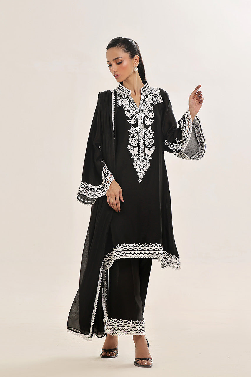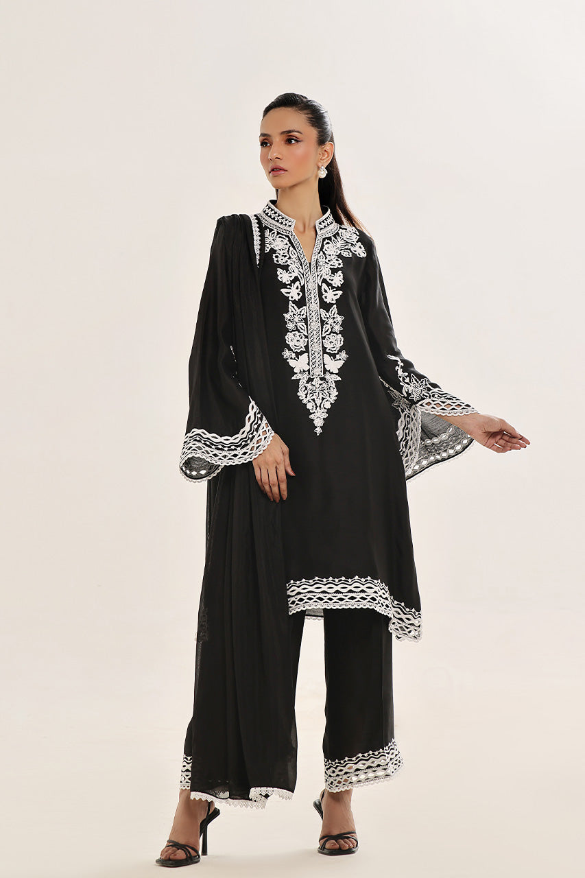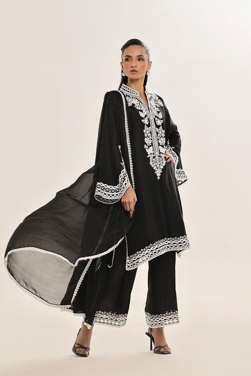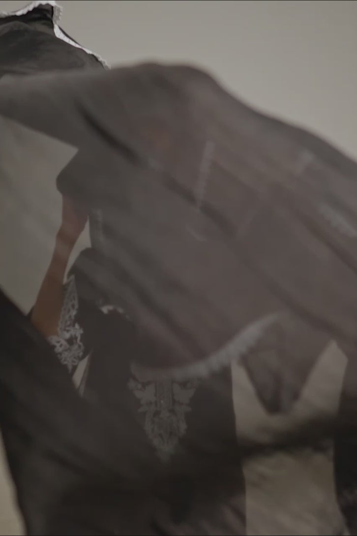 Glorify your festive look with this black Masoori Silk knee-length shirt, encrusted with lavish embroideries over the neckline, sleeves and bottom. Featuring slit-open sleeves for an added glamorous touch. Paired with a delicate embroidered izaar, it creates an ethereal silhouette for your ceremonies.
