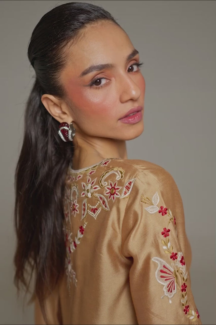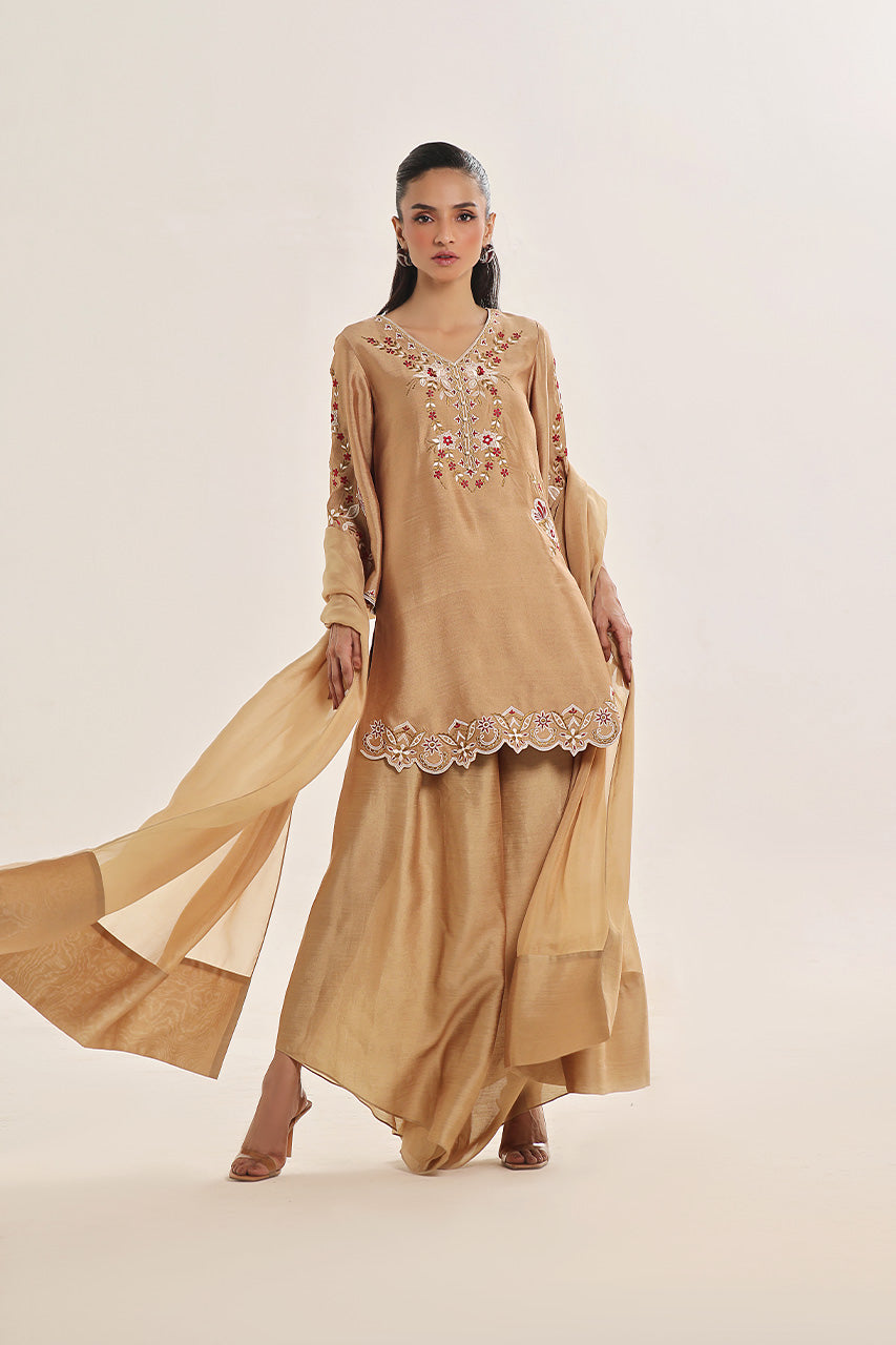 Shine bright with this copper Masoori Silk shirt, heavily embroidery all over the shirt, sleeves and back. Paired with matching izaar pants and a...