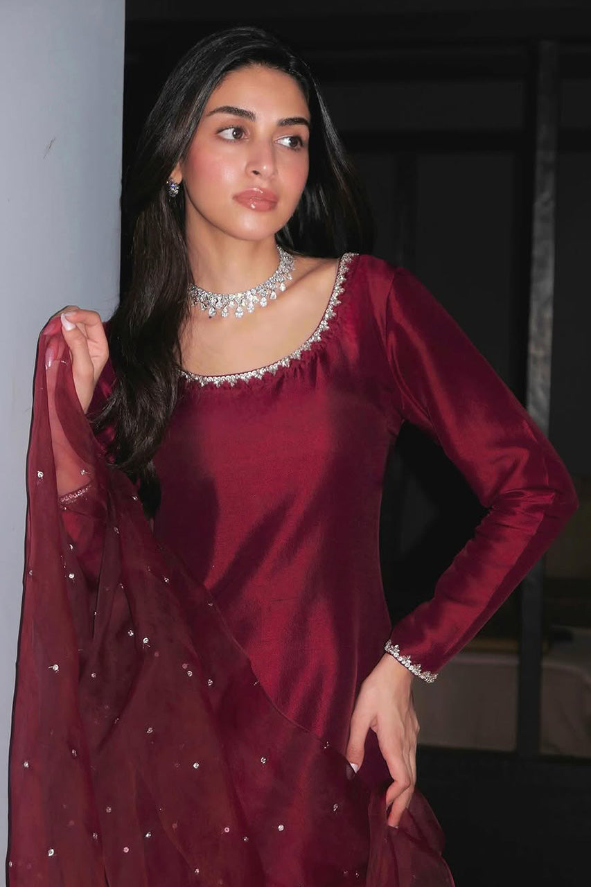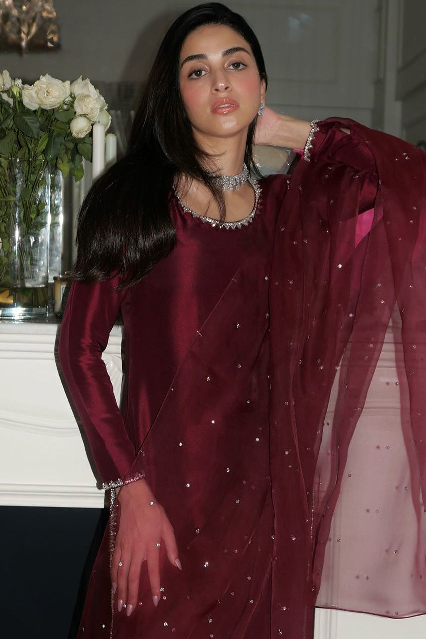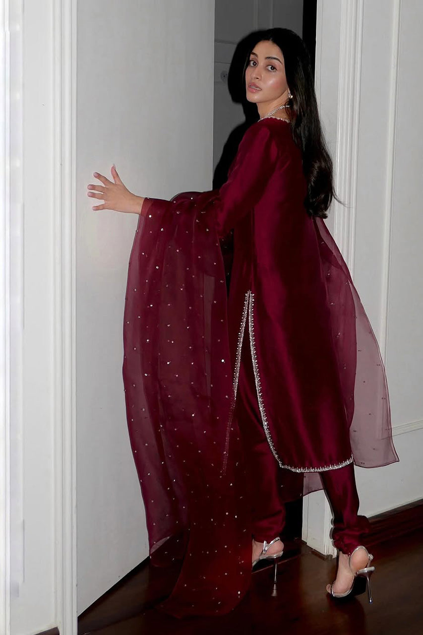 Elevate your elegance with this deep maroon ensemble featuring a pure raw silk shirt adorned with delicate finishing along the borders and neckline. Paired with a matching pure raw silk churidar for a timeless silhouette, and completed with a sheer organza dupatta embellished with subtle sequin detailing for just the right touch of shimmer. Perfect for intimate soirées or festive gatherings.
