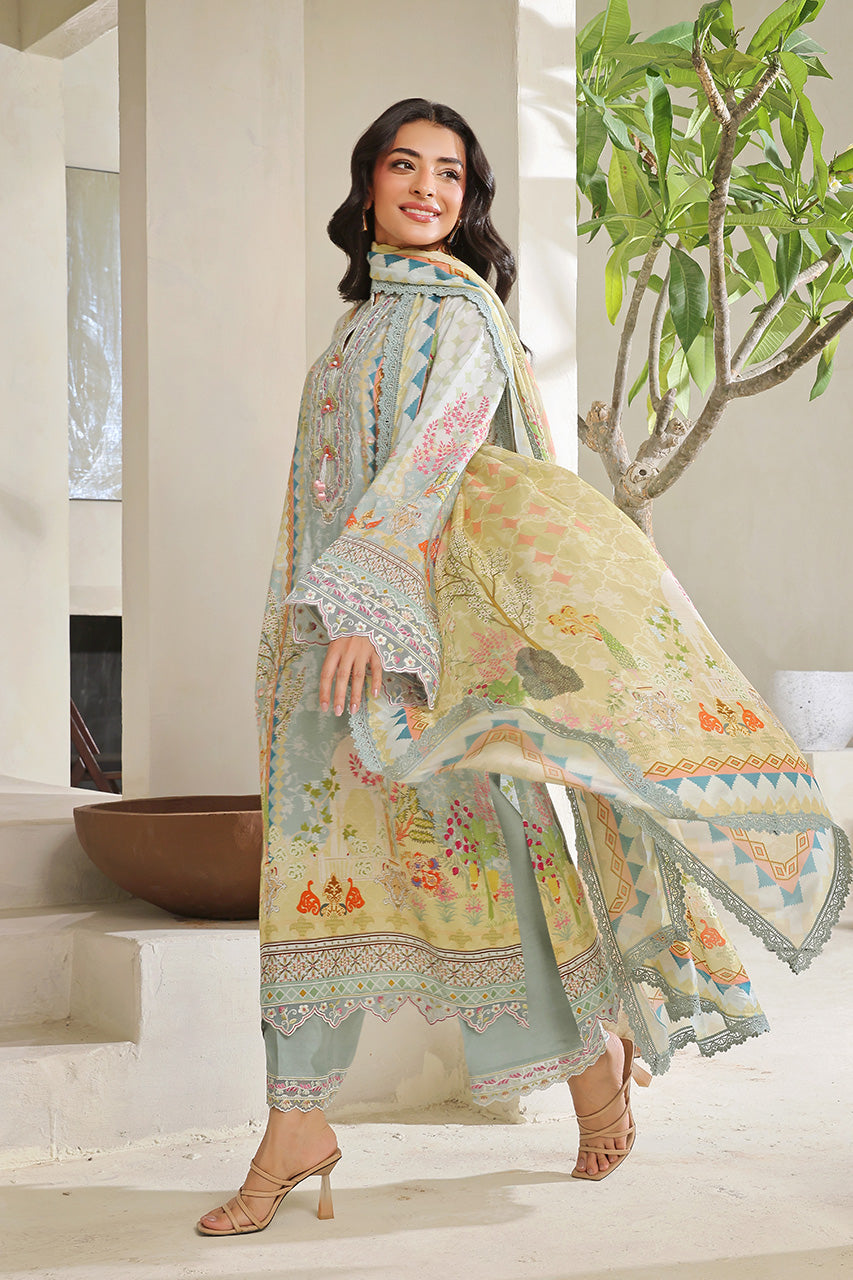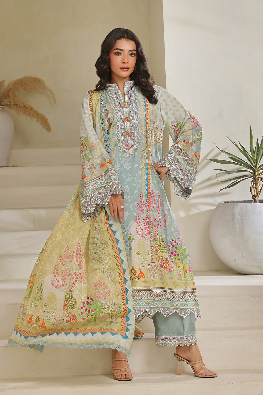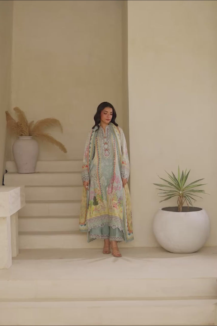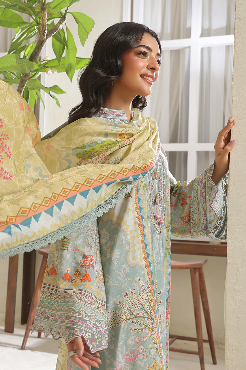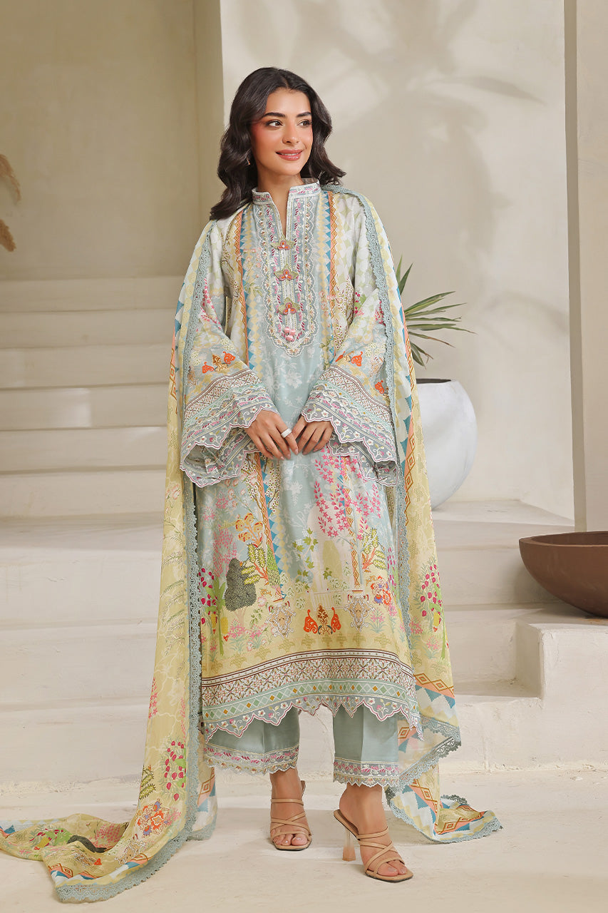 Exude serene charm in this graceful three-piece ensemble, featuring a long light blue kora digital shirt adorned with delicate appliqué thread work on the neckline and sleeves. The shirt is beautifully complemented by intricate digital prints that flow seamlessly across the fabric and onto the matching dupatta. The light blue kora digital dupatta features a soft contrast of colors and is finished with lace work all over, adding dimension and elegance. Paired with khaddi cotton izaar pants, intricately embroidered to enhance the look, this outfit is perfect for sophisticated daytime occasions or festive gatherings with a subtle, refined flair.
