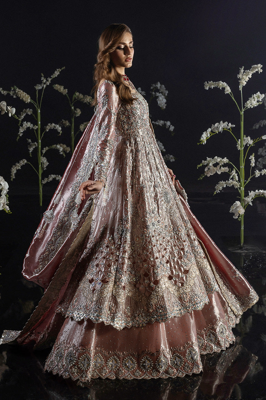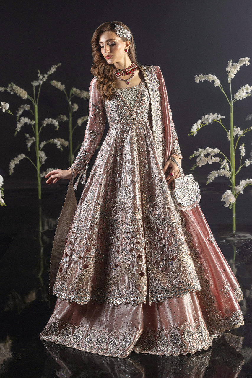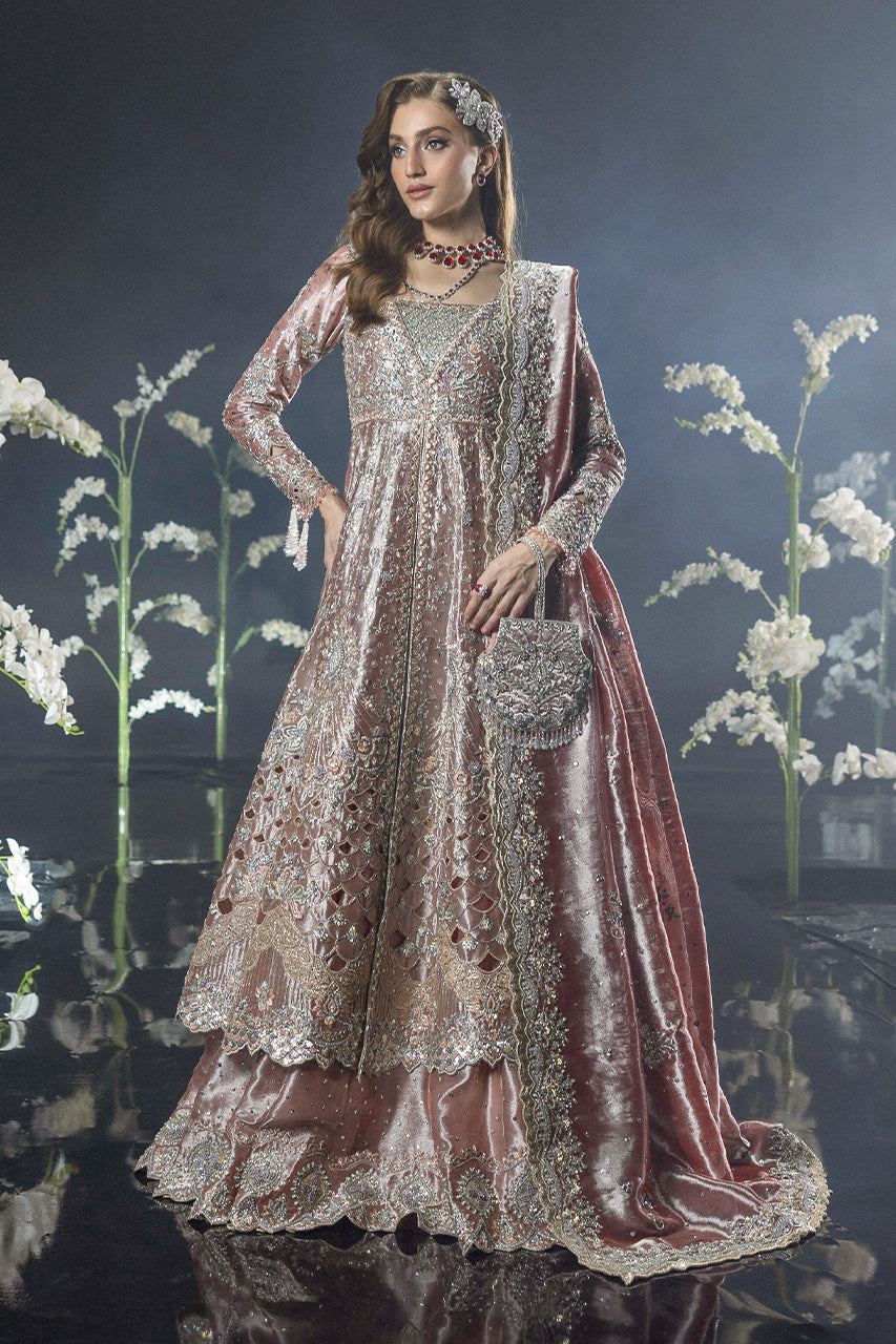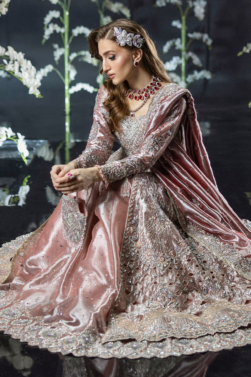 An opulent pink Lama masterpiece, this heavily embroidered long front-open gown is designed to embody grandeur and sophistication. The gown is adorned with a lavish embroidered border and intricate cutwork along the hemline, creating a statement of refined craftsmanship. Full-length embroidered sleeves are gracefully finished with delicate tassels, while the back neckline features exquisite cutwork with tassels cascading for a touch of dramatic elegance. Paired with a matching pink Lama lehnga, embellished with a radiant sequin border that enhances its regal appeal, the ensemble is completed with a luxurious lame dupatta. The dupatta showcases richly embroidered borders and glistening sequin work, adding layers of shimmer and depth. Together, the silhouette strikes the perfect balance of modern allure and traditional artistry, making it a timeless choice for grand occasions. Comes with a matching pouch.Â