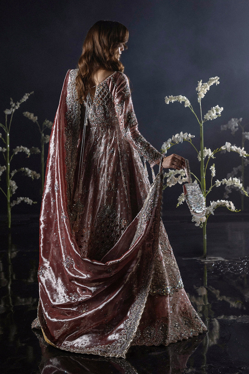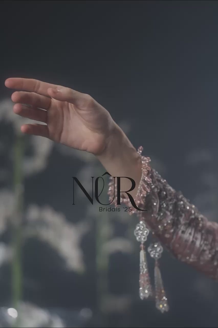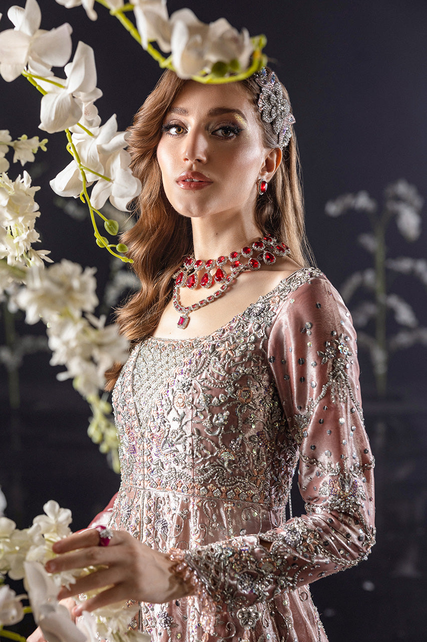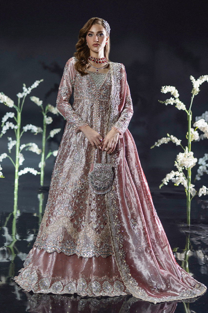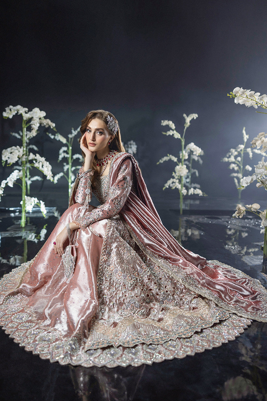 An opulent pink Lama masterpiece, this heavily embroidered long front-open gown is designed to embody grandeur and sophistication. The gown is adorned with a lavish embroidered border and intricate cutwork along the hemline, creating a statement of refined craftsmanship. Full-length embroidered sleeves are gracefully finished with delicate tassels, while the back neckline features exquisite cutwork with tassels cascading for a touch of dramatic elegance. Paired with a matching pink Lama lehnga, embellished with a radiant sequin border that enhances its regal appeal, the ensemble is completed with a luxurious lame dupatta. The dupatta showcases richly embroidered borders and glistening sequin work, adding layers of shimmer and depth. Together, the silhouette strikes the perfect balance of modern allure and traditional artistry, making it a timeless choice for grand occasions. Comes with a matching pouch.Â