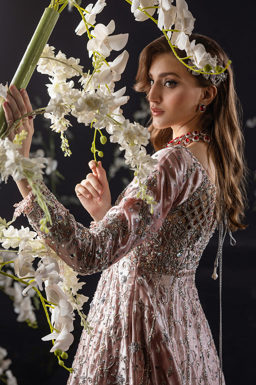 An opulent pink Lama masterpiece, this heavily embroidered long front-open gown is designed to embody grandeur and sophistication. The gown is adorned with...