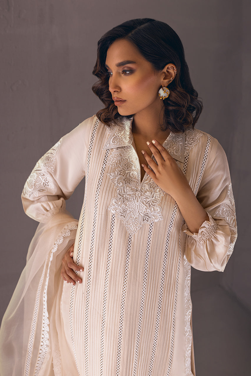 Erin holds a poetic charm essayed on a dreamy white hue, a raw silk shirt enhanced with subtle details paired with refined izaar pants, and a marvelous organza dupatta finished with laces designed exceptionally for your intimate events.