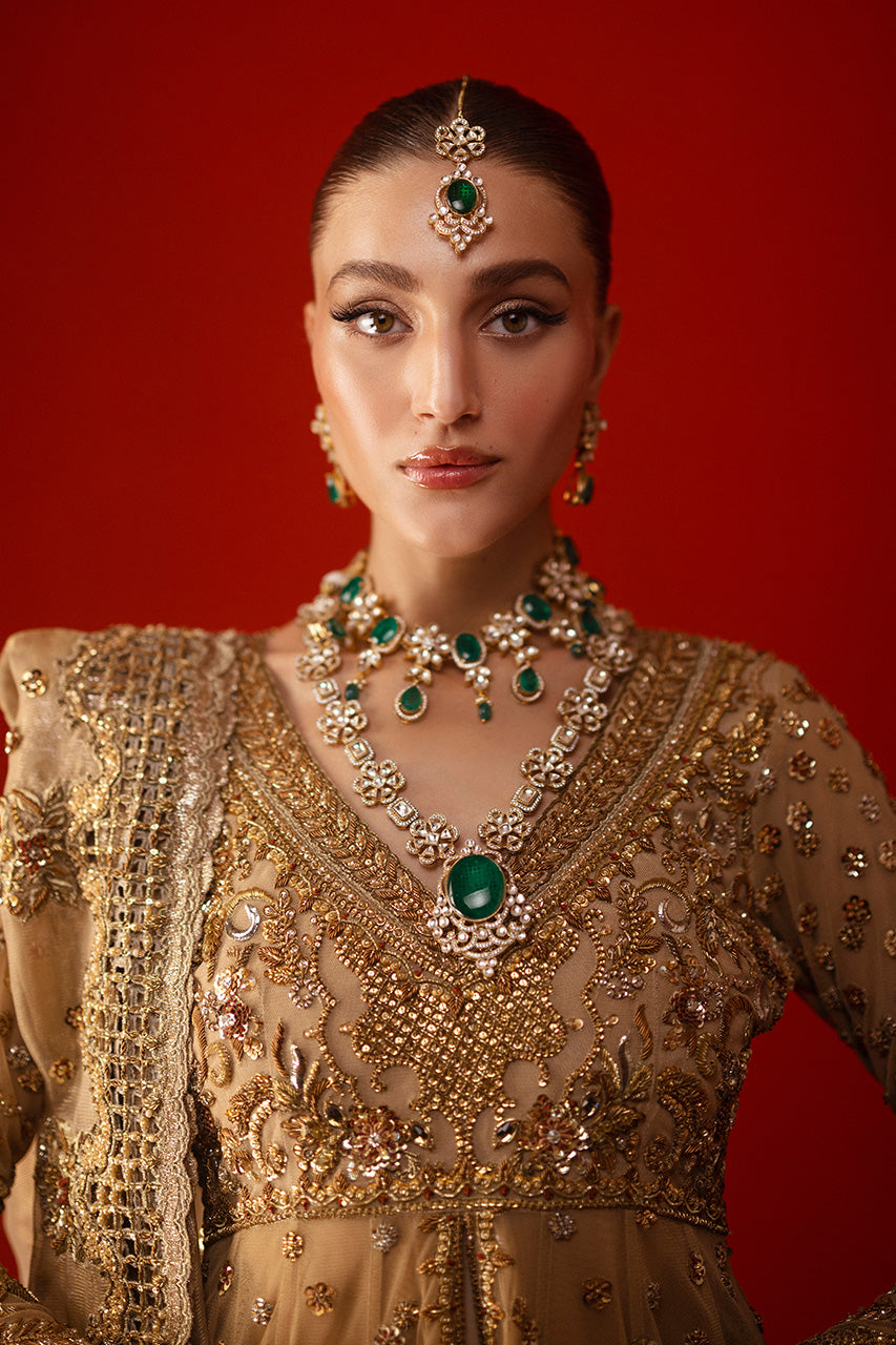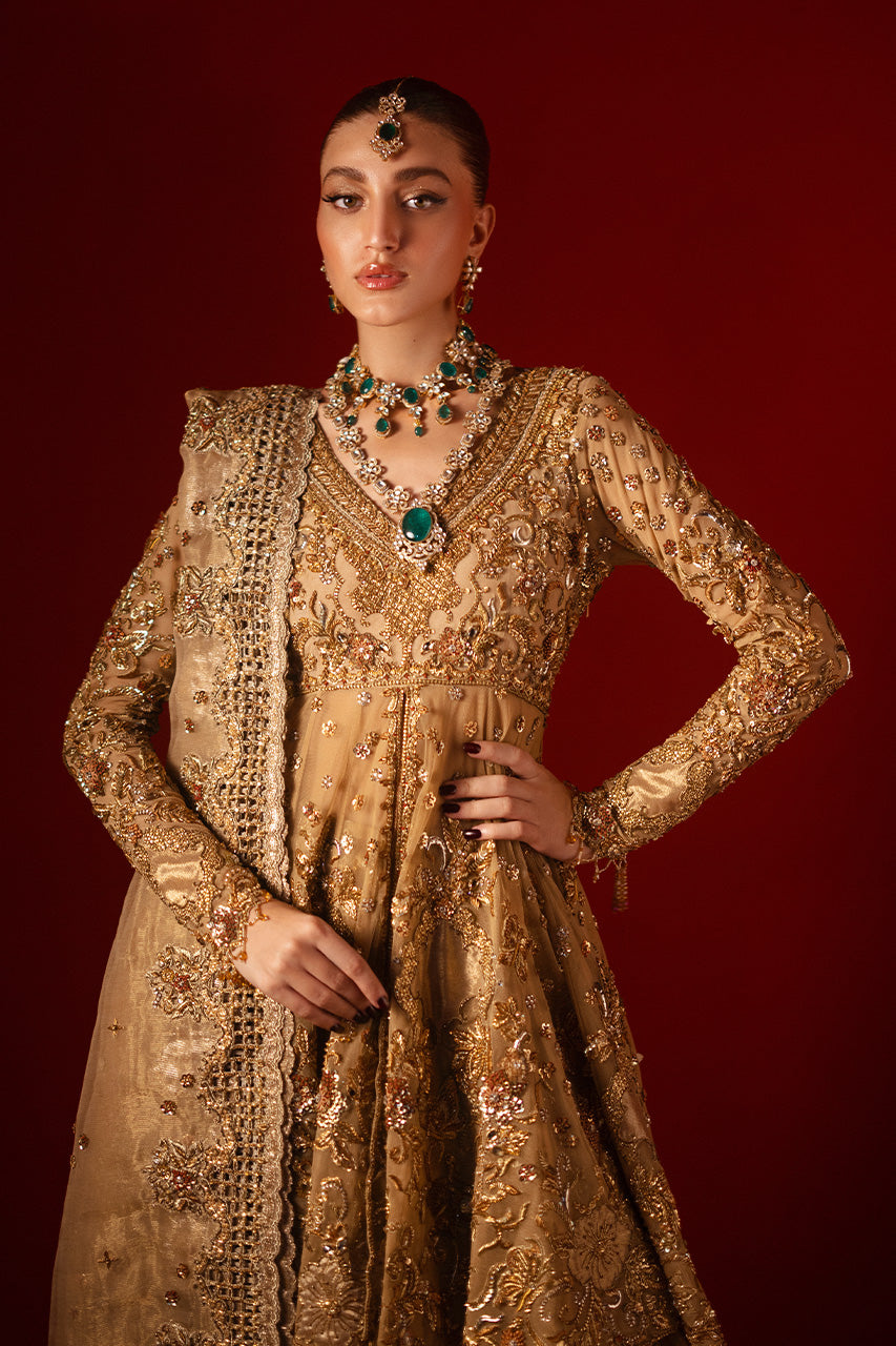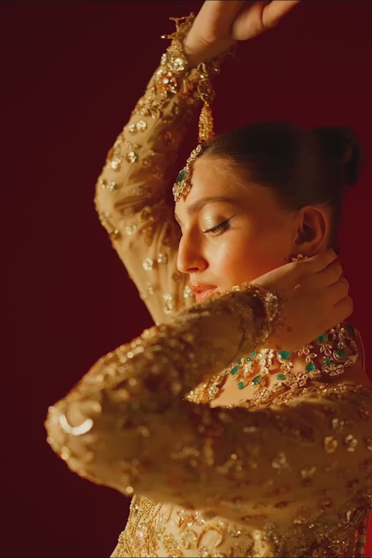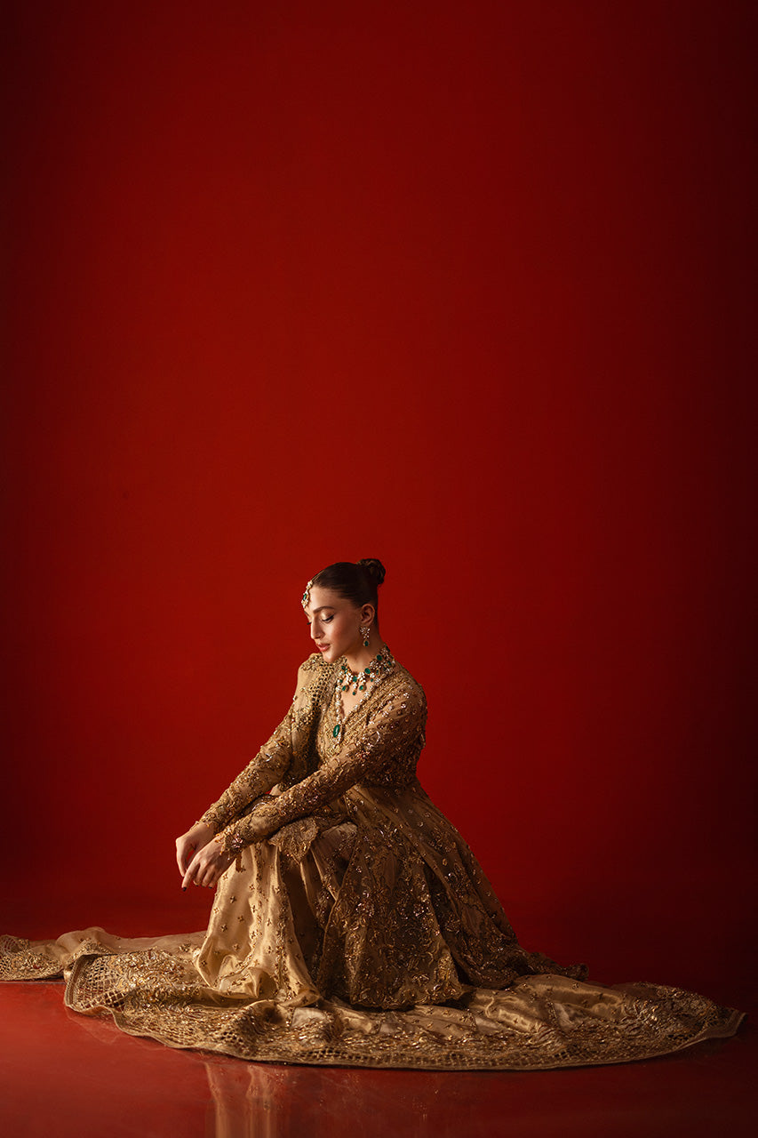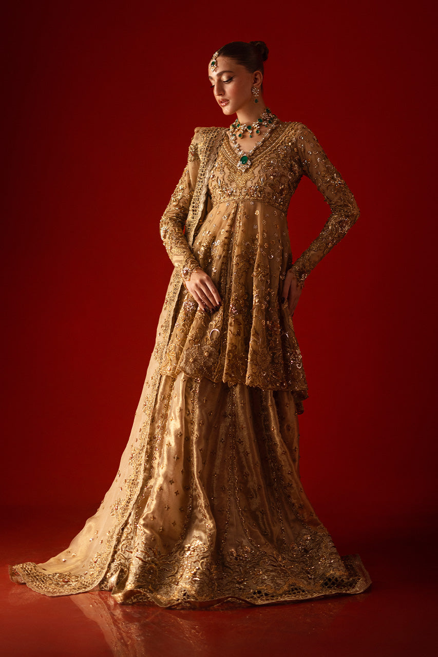Paired with this exquisite peplum is a gold lama lehenga and zari organza dupatta, both incorporating heavily worked all over borders, finished with a beautiful blend of scallops and cutwork on duppata and lehnga. All these intricate details are binding the whole look together effortlessly for the bride who wants a touch of glamour with tradition for her big day! This bridal dress is further elevated with the addition of a complimentary pouch