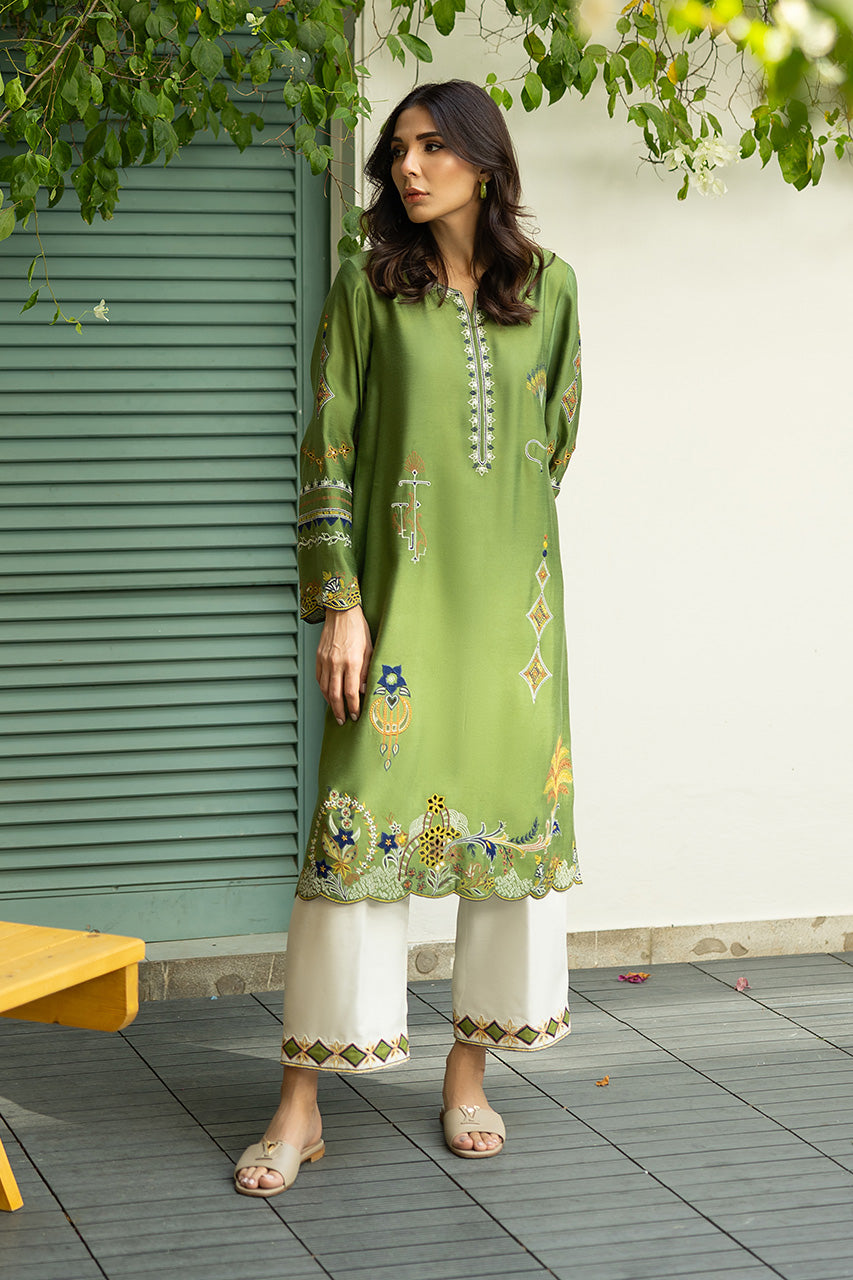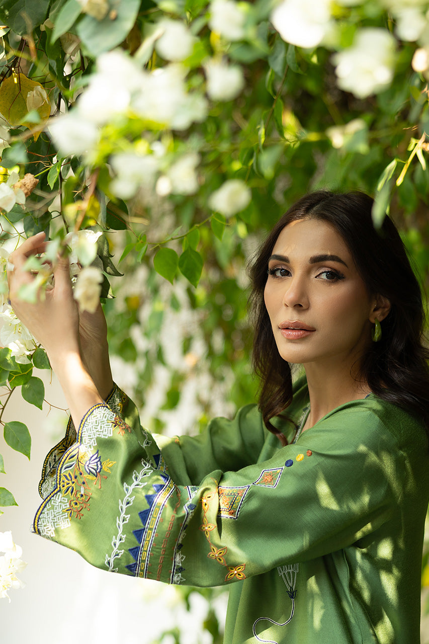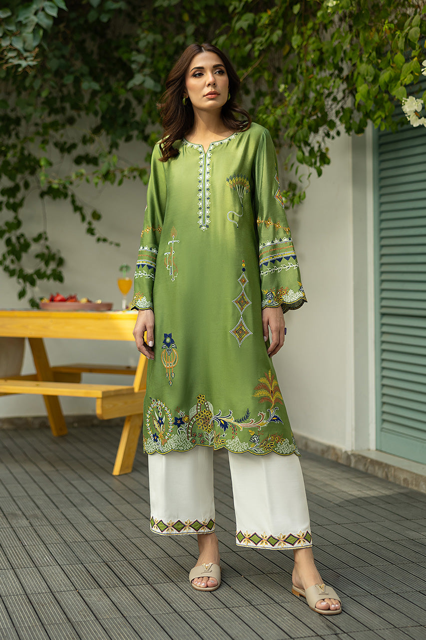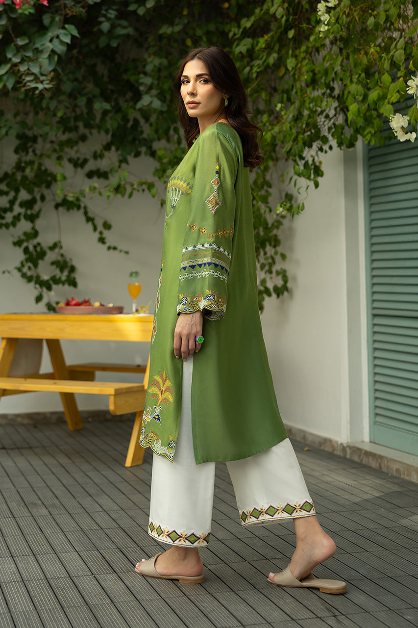 A moss green khaddi silk shirt with a luxurious sheen, featuring full-length sleeves adorned with scallop borders at the cuffs, and the same scallop detailing around the hemline, creating a delicate, feminine touch. The shirt is intricately designed with elegant patterns that merge various elemental motifs, perhaps a blend of floral, geometric patterns, creating an artistic yet cohesive look. The shirt is paired with white khaddi cotton pants, offering a crisp contrast to the green. The pants have neat, finishing borders along the bottom hem, complementing the scalloped design of the shirt.