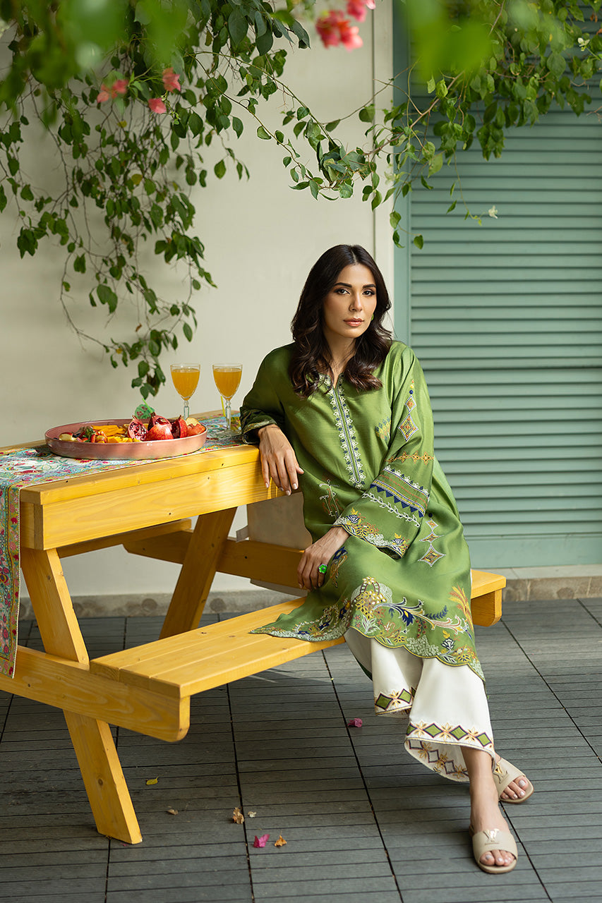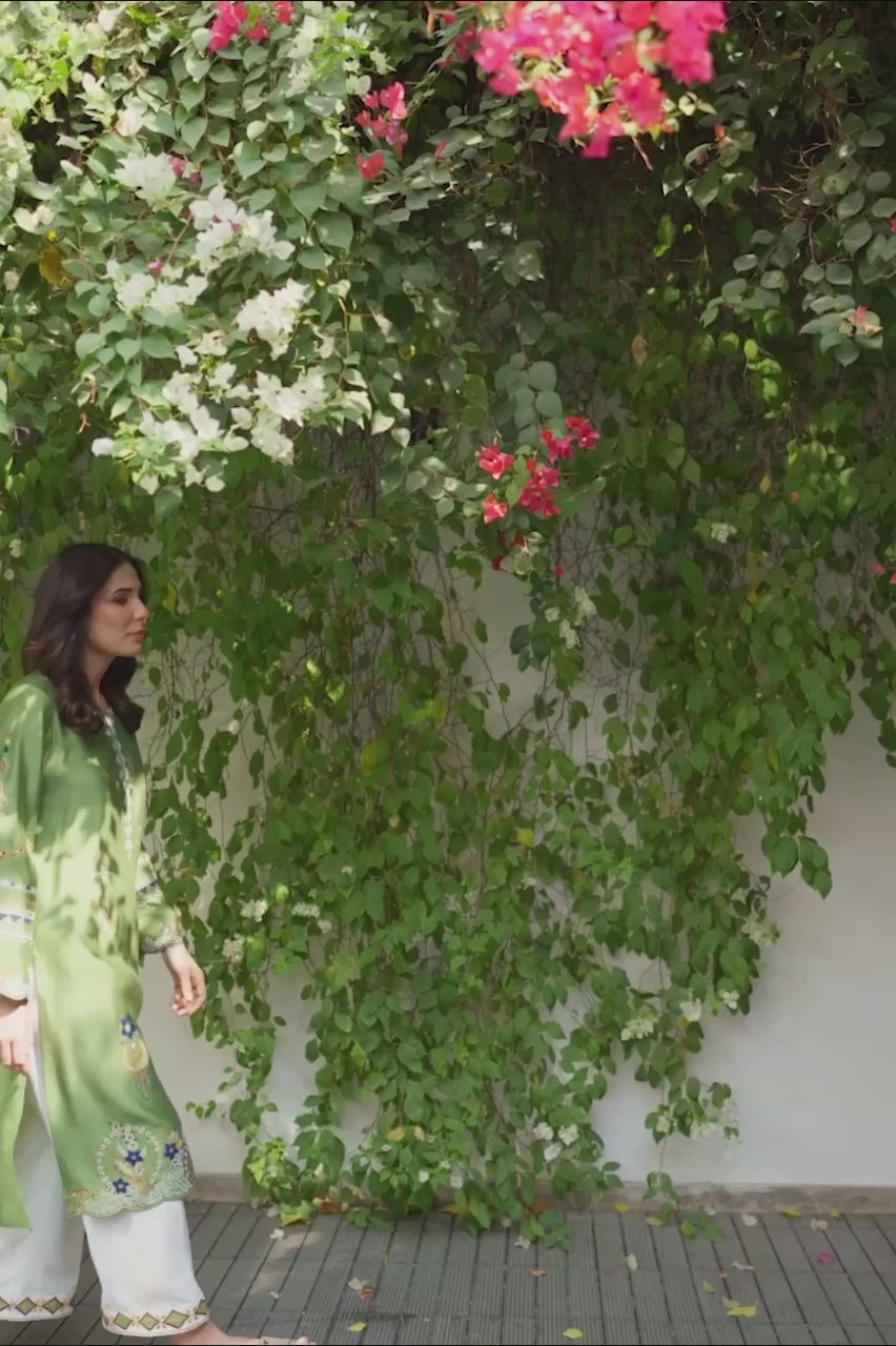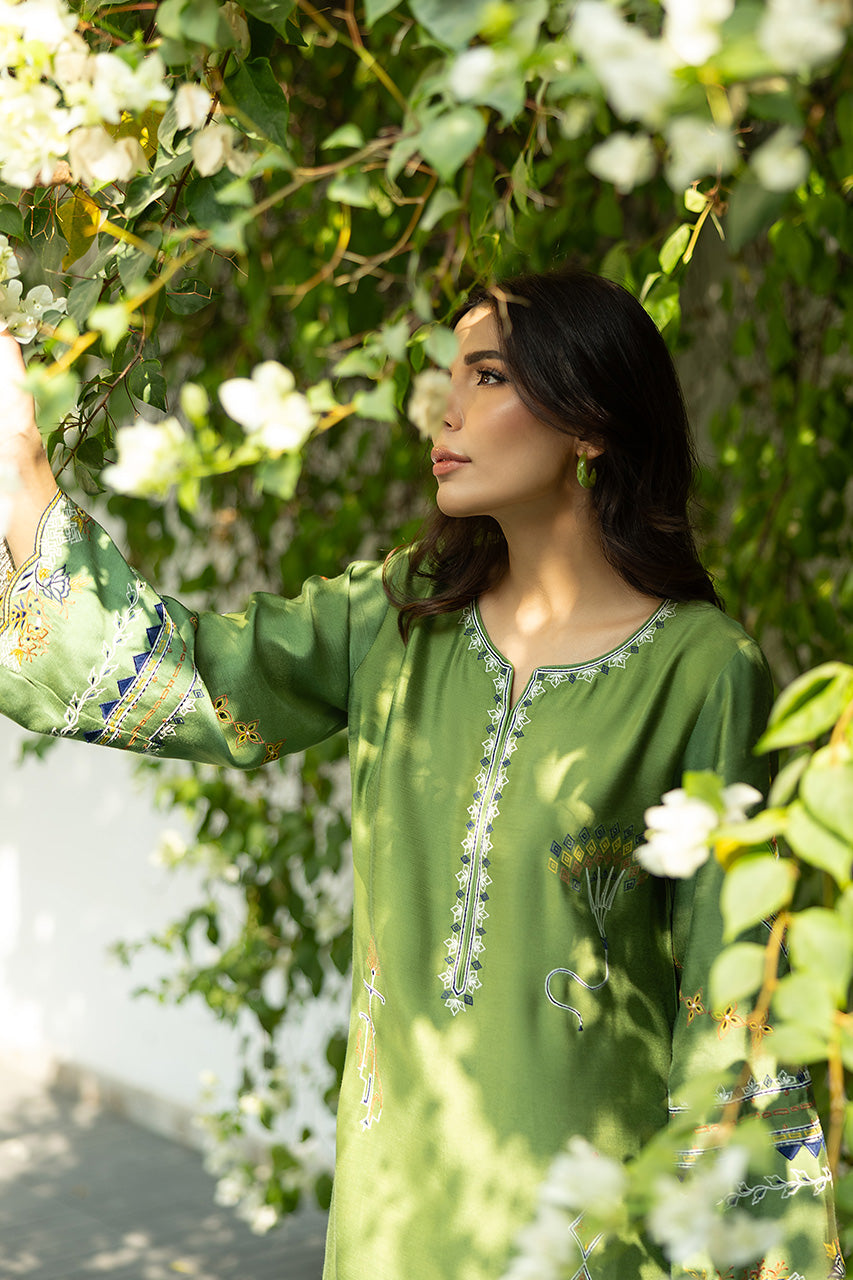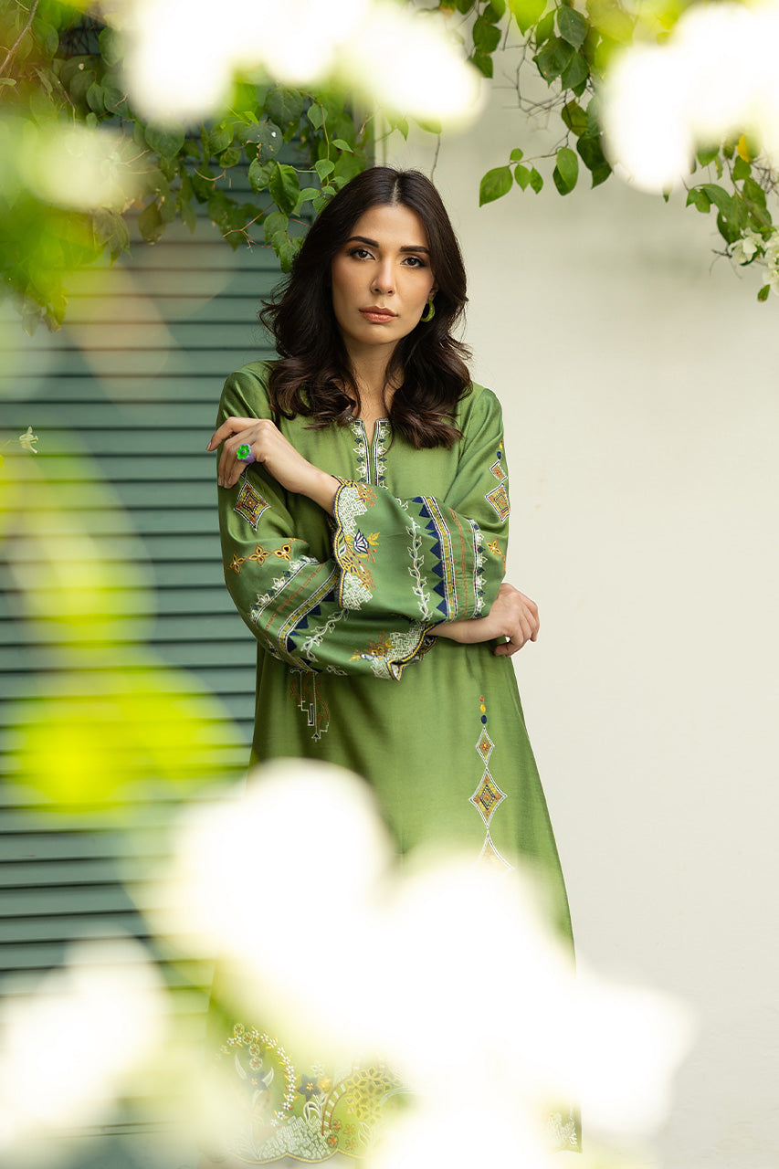 A moss green khaddi silk shirt with a luxurious sheen, featuring full-length sleeves adorned with scallop borders at the cuffs, and the same scallop detailing around the hemline, creating a delicate, feminine touch. The shirt is intricately designed with elegant patterns that merge various elemental motifs, perhaps a blend of floral, geometric patterns, creating an artistic yet cohesive look. The shirt is paired with white khaddi cotton pants, offering a crisp contrast to the green. The pants have neat, finishing borders along the bottom hem, complementing the scalloped design of the shirt.