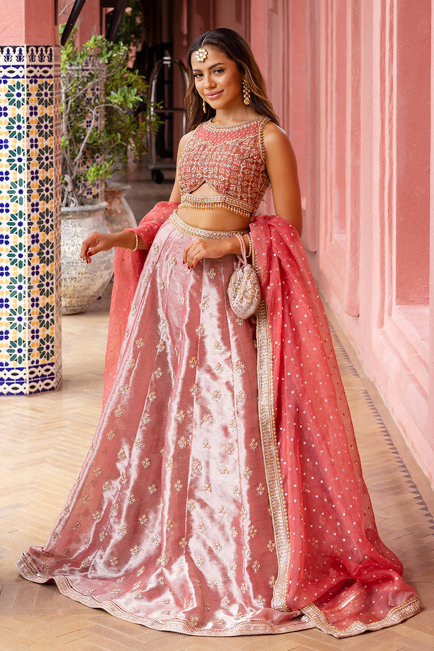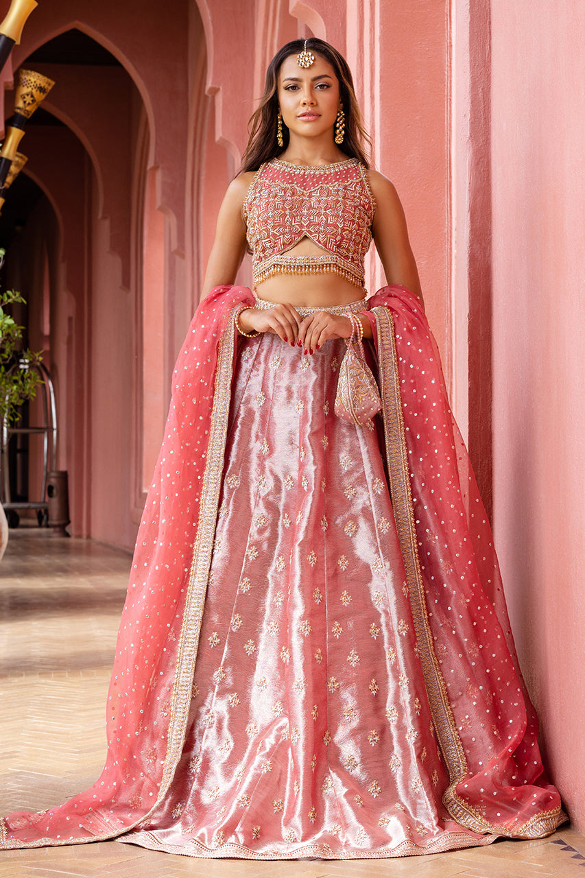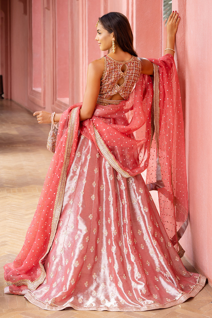 Unveil the allure of Flamingo Dream: A symphony where timeless tradition gracefully embraces modern charm. The delicate onion pink self lama lehenga complements...
