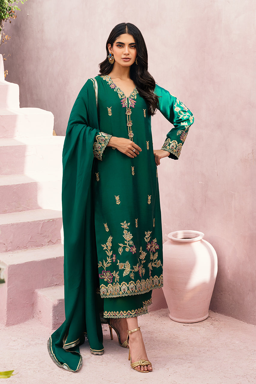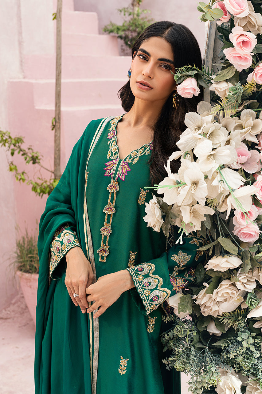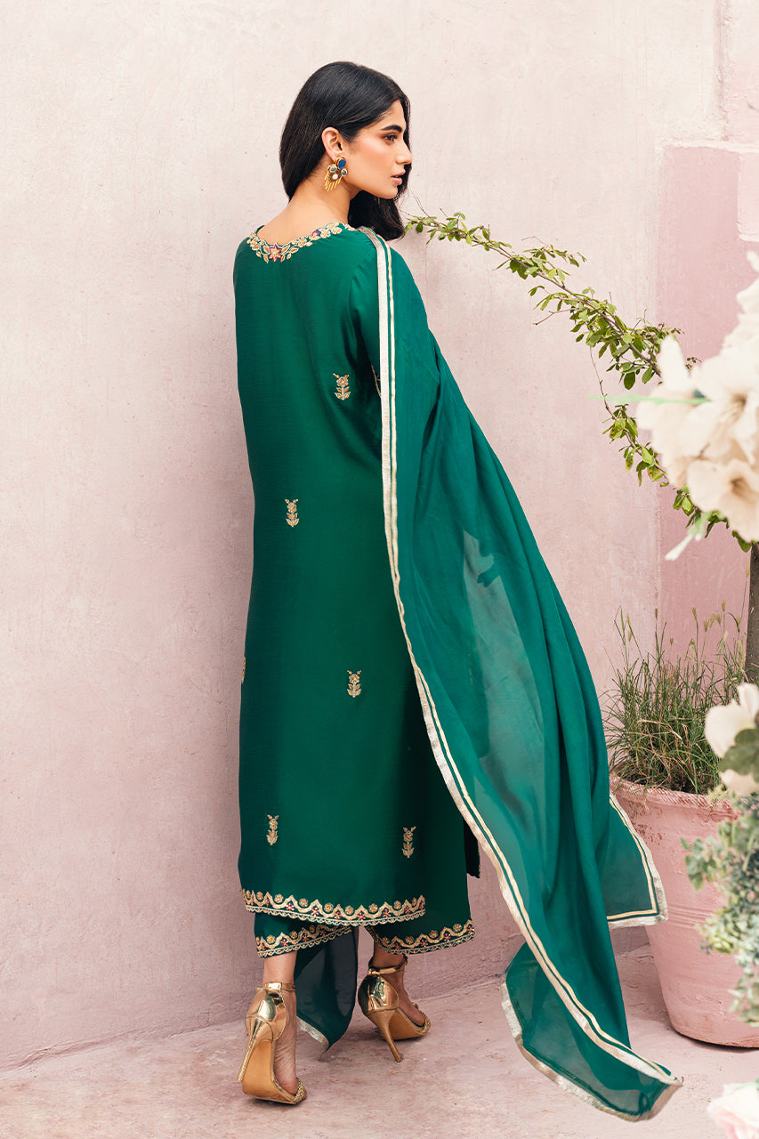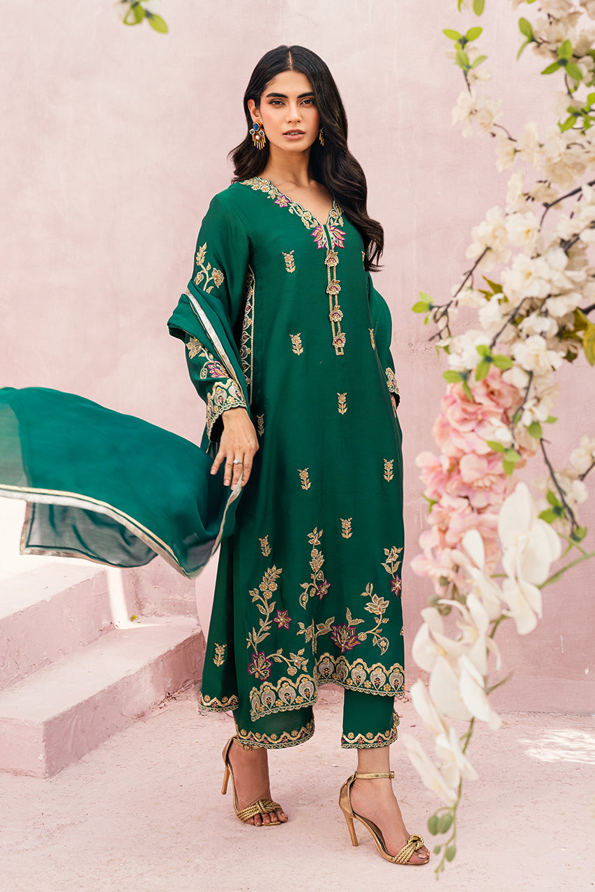 Embrace the allure of this Masoori Silk long shirt rendered in a forest green tone. The shirt boasts intricate hand and machine work on the neckline, sleeves, and daman, with motifs scattered throughout. To complement the silhouette, it is paired with masoori silk izaar pants with worked borders and a lace finished green dupatta, capturing a vibrant spirit that will stand out on any occasion