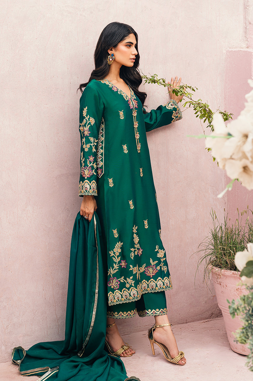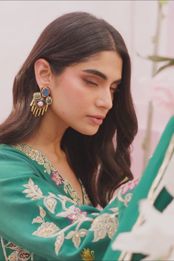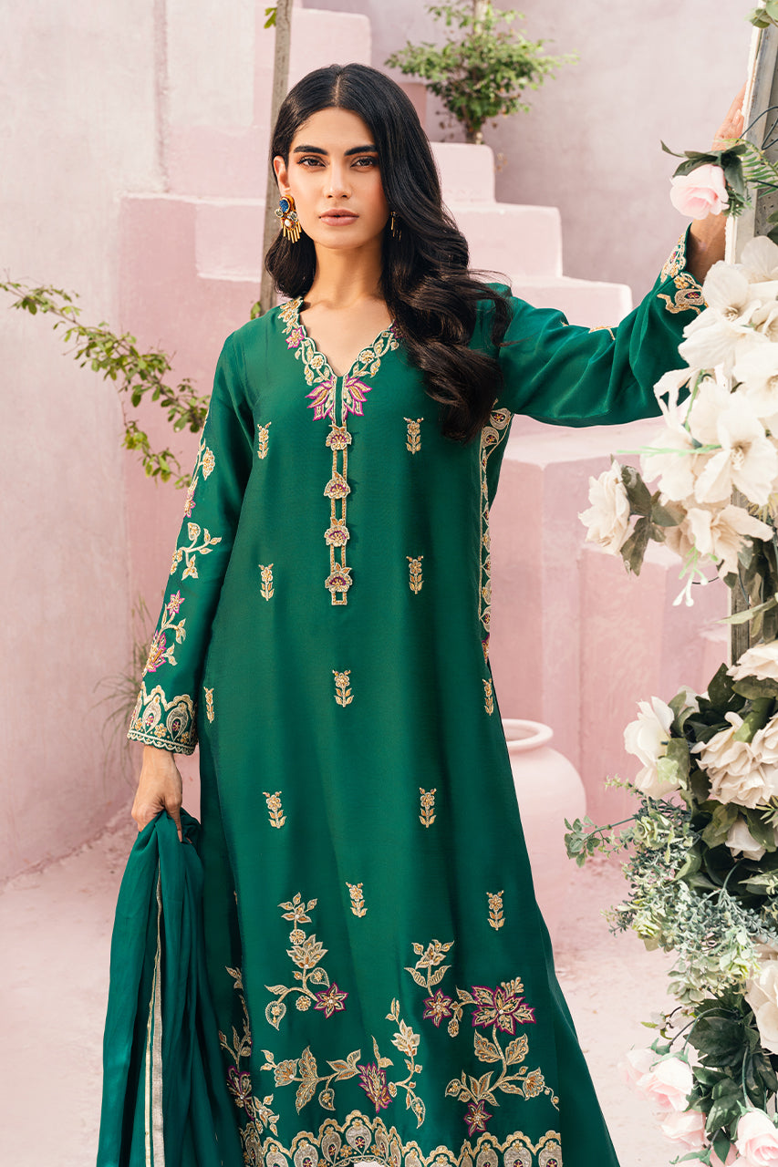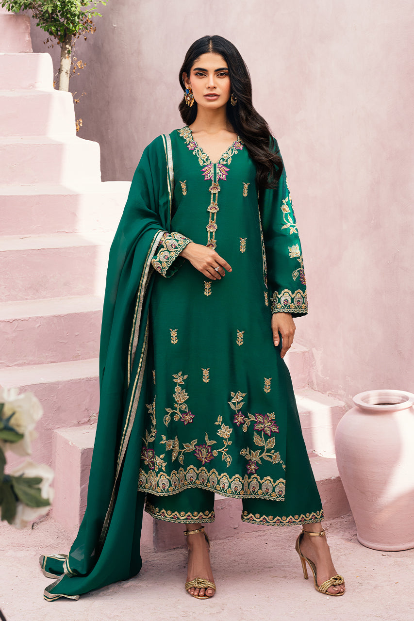 Embrace the allure of this Masoori Silk long shirt rendered in a forest green tone. The shirt boasts intricate hand and machine work on the neckline, sleeves, and daman, with motifs scattered throughout. To complement the silhouette, it is paired with masoori silk izaar pants with worked borders and a lace finished green dupatta, capturing a vibrant spirit that will stand out on any occasion