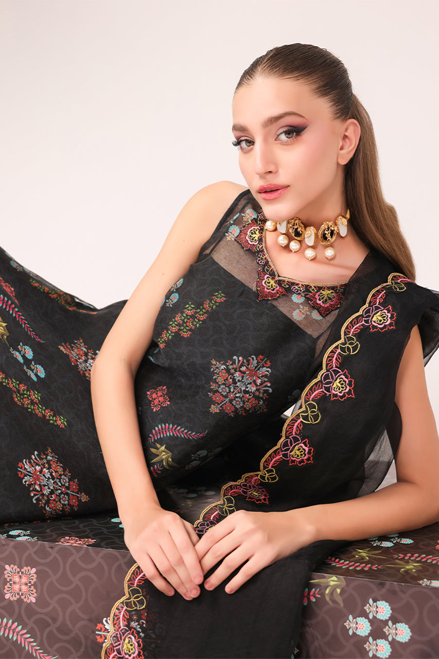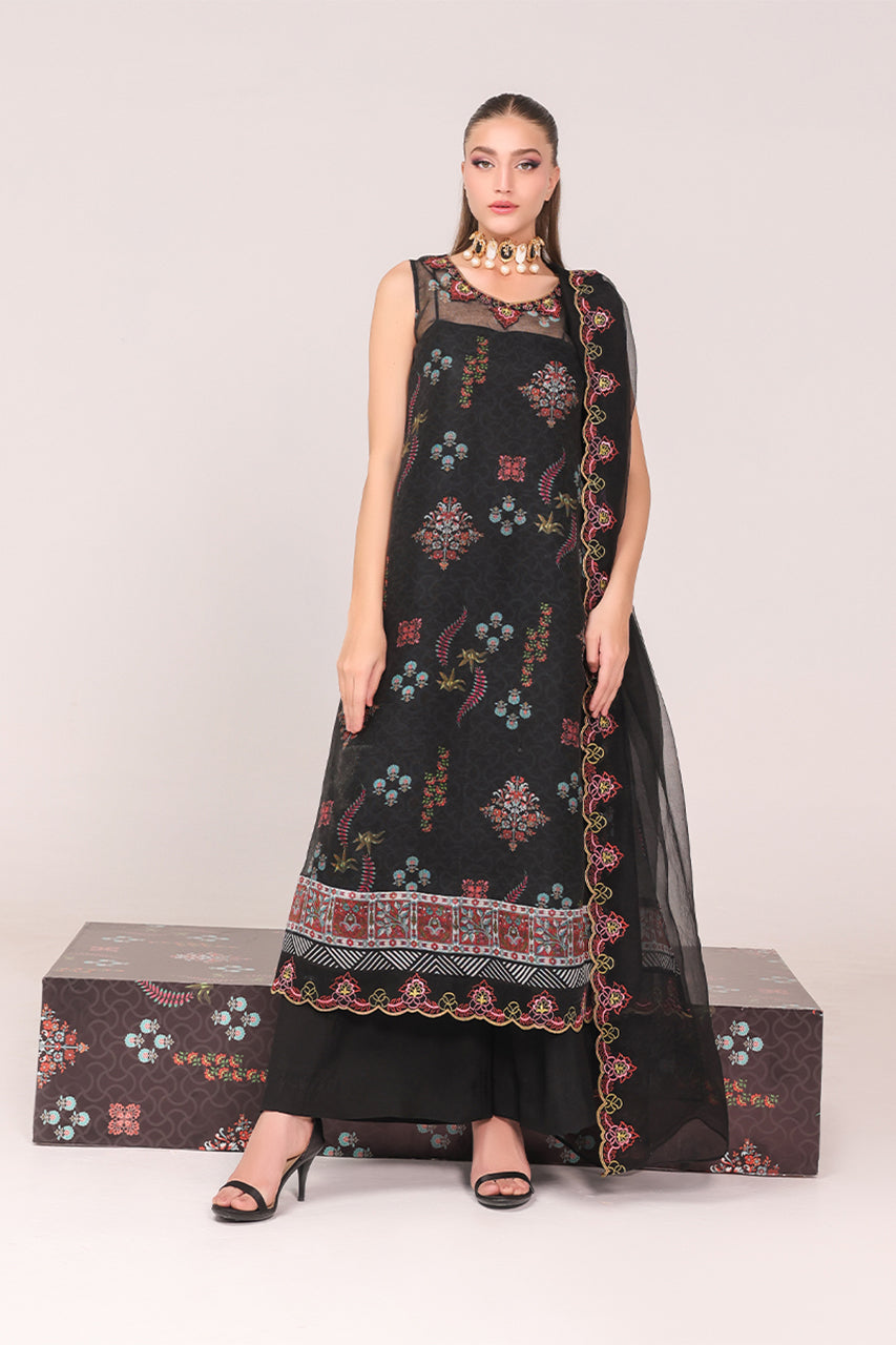 Indulge in the allure of this sleeveless digital black shirt, crafted from long cotton net, adorned with Ari work on the neckline and bottom. Accompanied by an ethereal organza dupatta, meticulously embellished with Ari work throughout. Paired effortlessly with flared pants to complete the aesthetic ensemble.