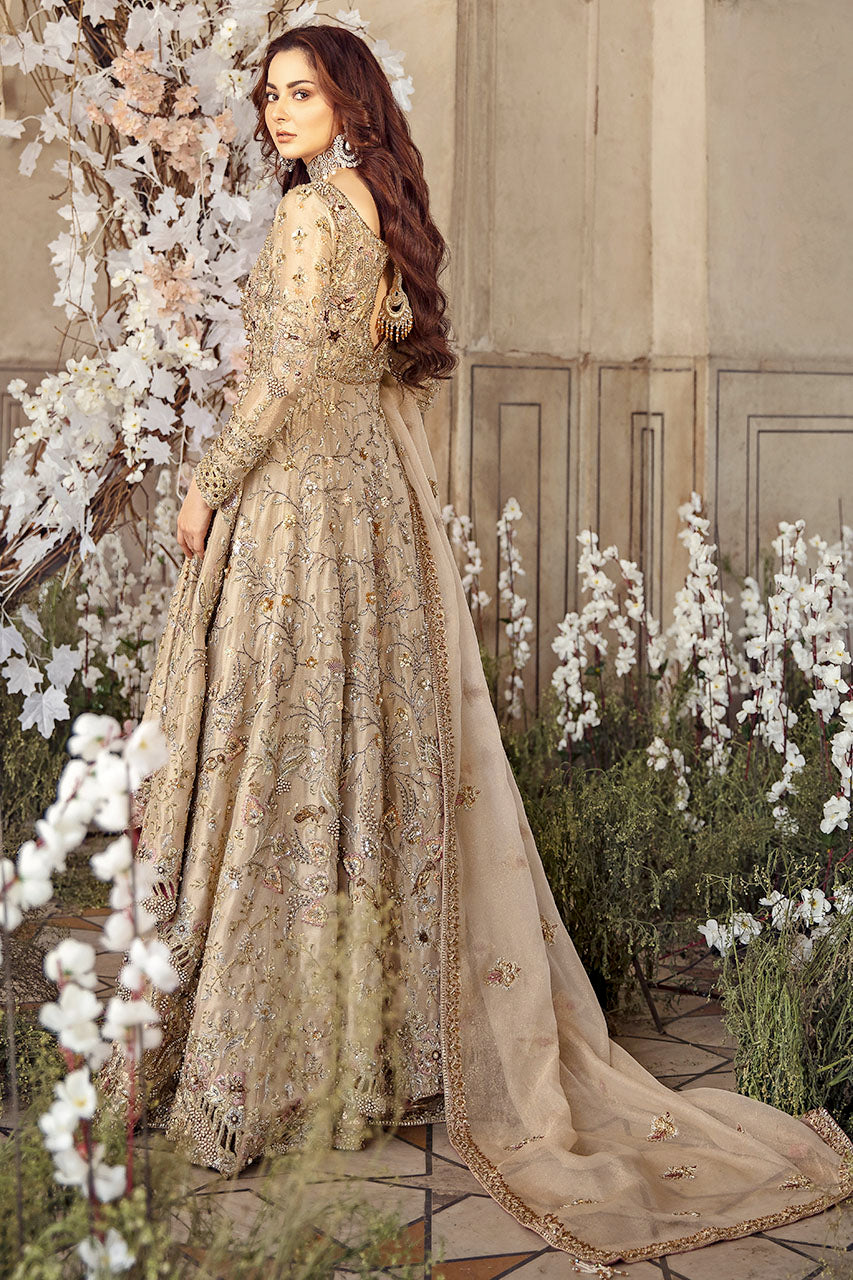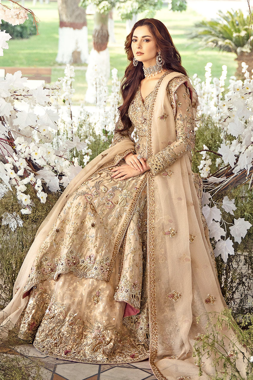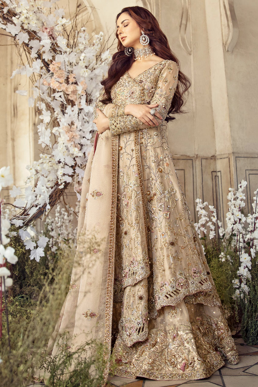 This dull pewter tissue cut in an angrakha pishwas style is adorned with detailed hand embroidery. Pair it with the same colored masuri khaddi net Lehnga that is heavily embroidered. Dupatta is enriched with embellished details that complete this bridal look.