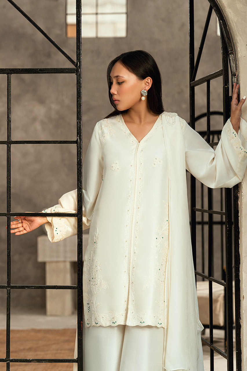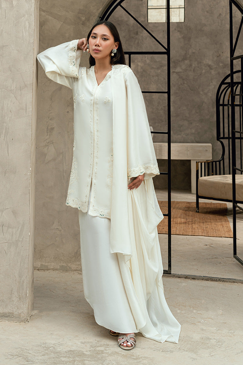 Elevate your style with this must-have ensemble featuring a pure white raw silk jacket that radiates understated elegance, with intricate Ari embroidery and hand work and finished with delicate scalloped edges along the hem and sleeves. The ensemble is paired with a draped silk dupatta, beautifully adorned with a central motif and graceful hand embroidered hangings along the top. Completing the look are tailored raw silk free flowing pants, offering a modern silhouette and comfortable fit. Designed for both grace and impact, it’s a flawless blend of tradition and contemporary style.