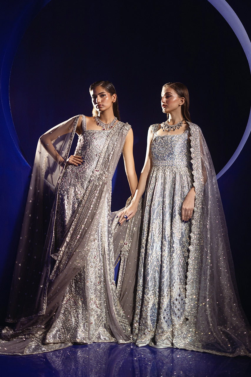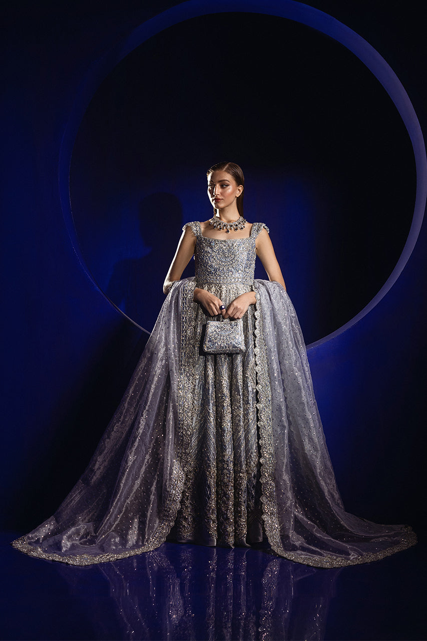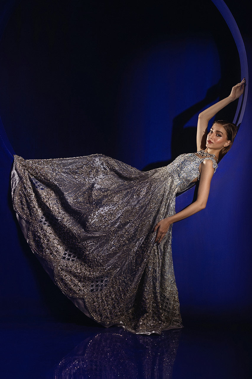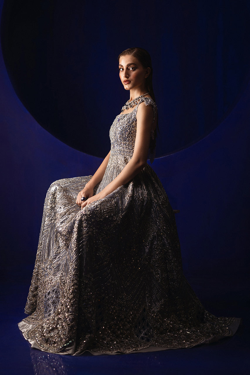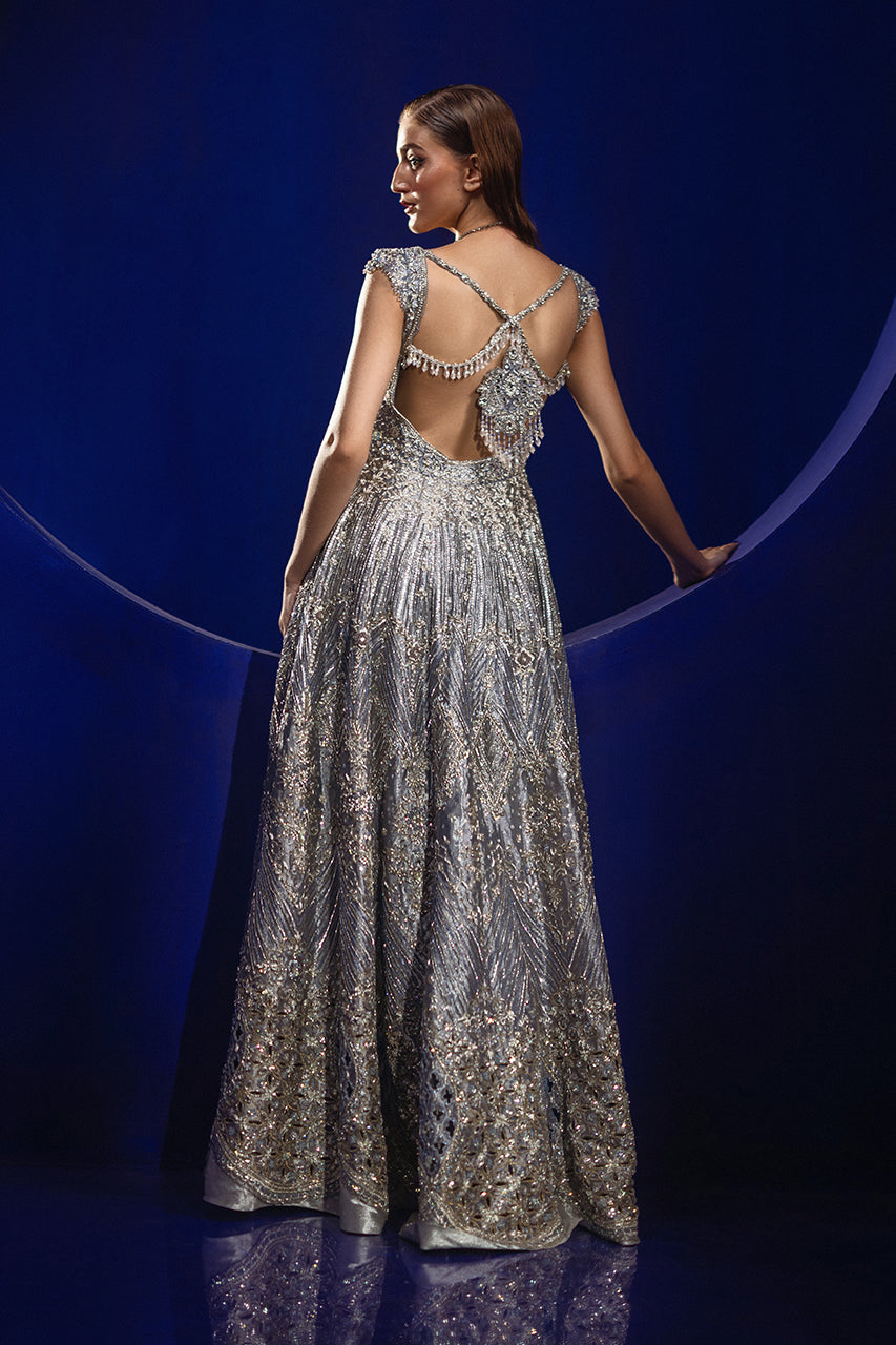 Step into the glow of this breathtaking moonlight bridal gown crafted from rich lame fabric. It is enhanced with unique cap styled sleeves finished with hanging crystals that shimmer like falling stars. Every inch of this outfit is a testament to masterful craftsmanship, with a harmonious blend of appliques, cutwork and hand embellishments featuring silver stones, pearls, and crystals that twinkle with every movement.
