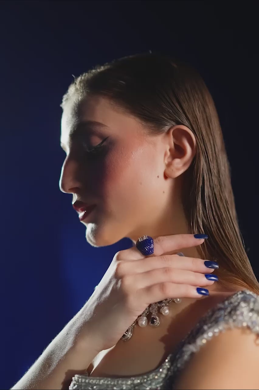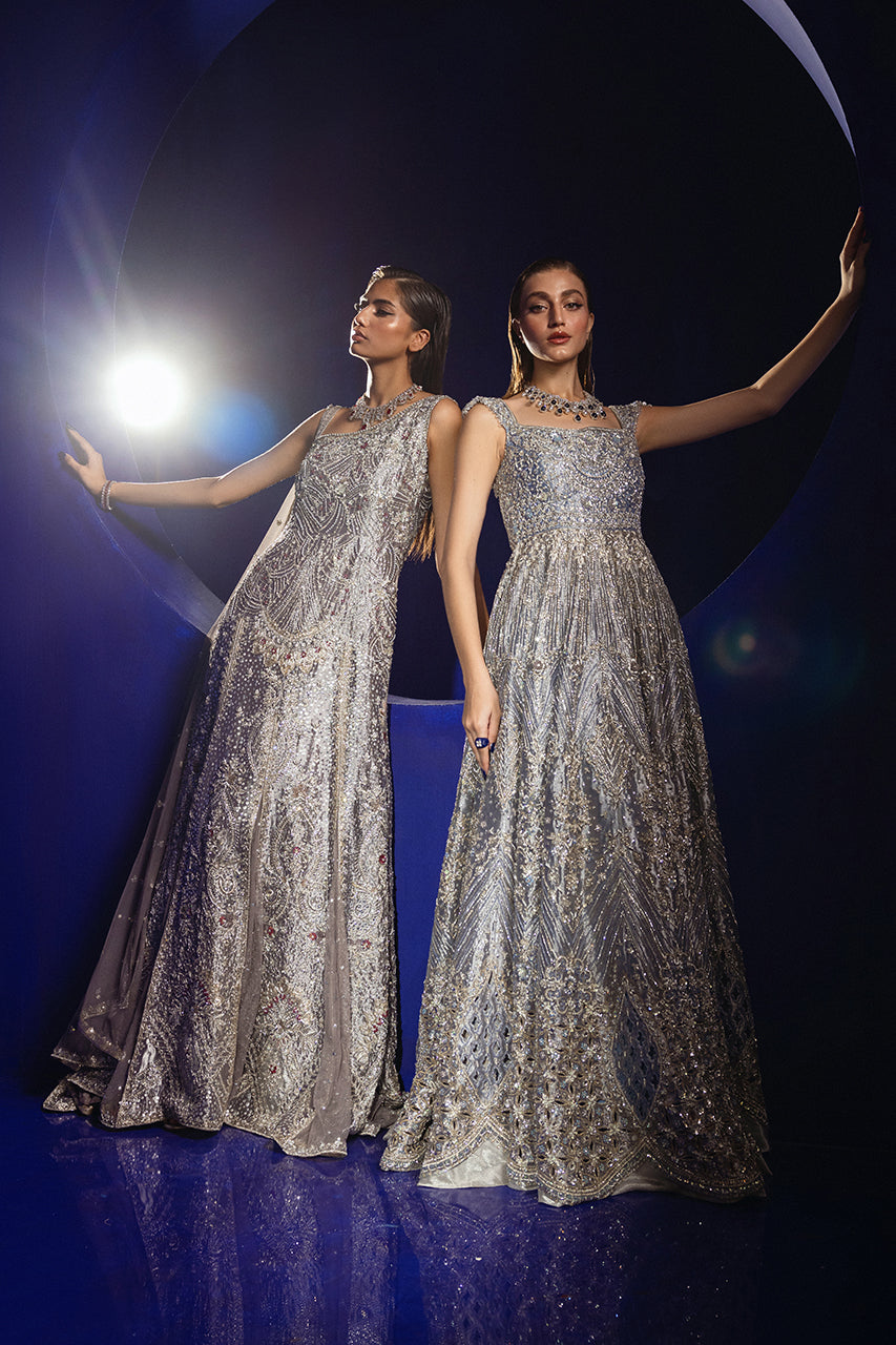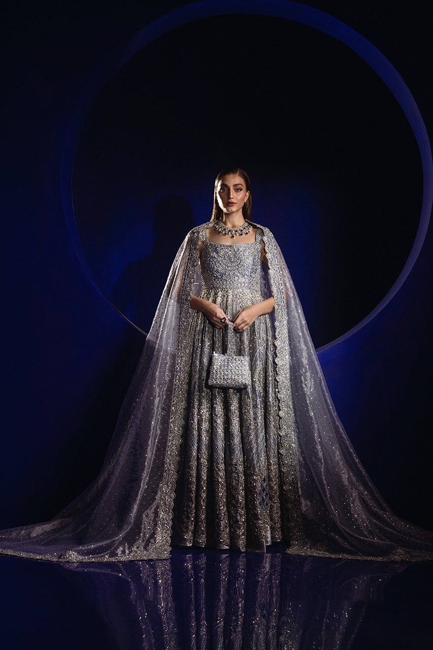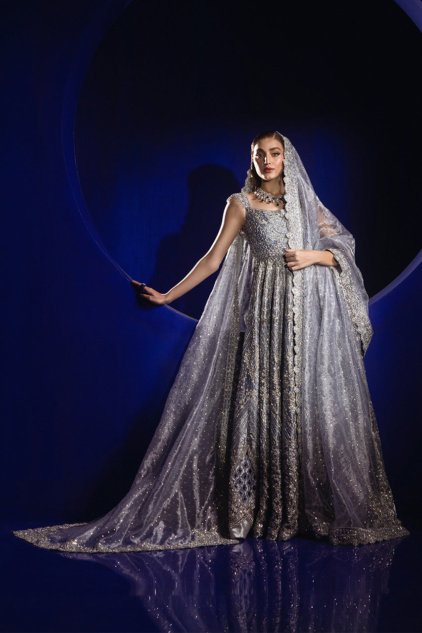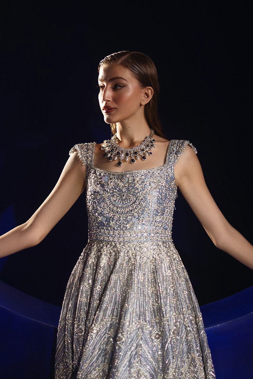 Step into the glow of this breathtaking moonlight bridal gown crafted from rich lame fabric. It is enhanced with unique cap styled sleeves finished with hanging crystals that shimmer like falling stars. Every inch of this outfit is a testament to masterful craftsmanship, with a harmonious blend of appliques, cutwork and hand embellishments featuring silver stones, pearls, and crystals that twinkle with every movement.