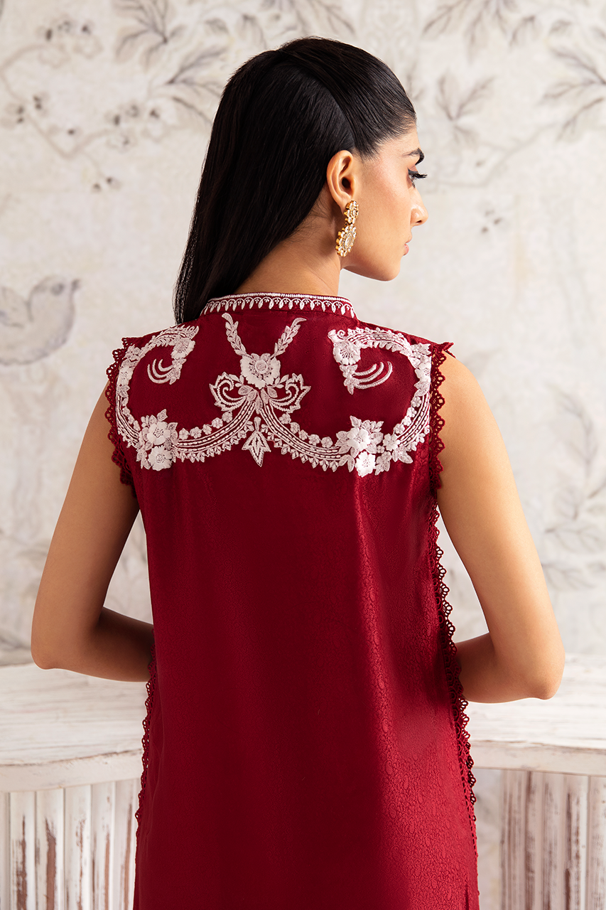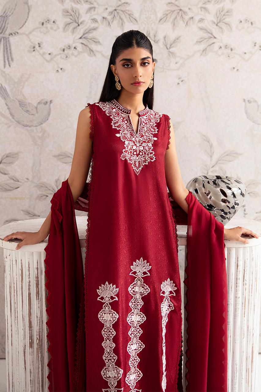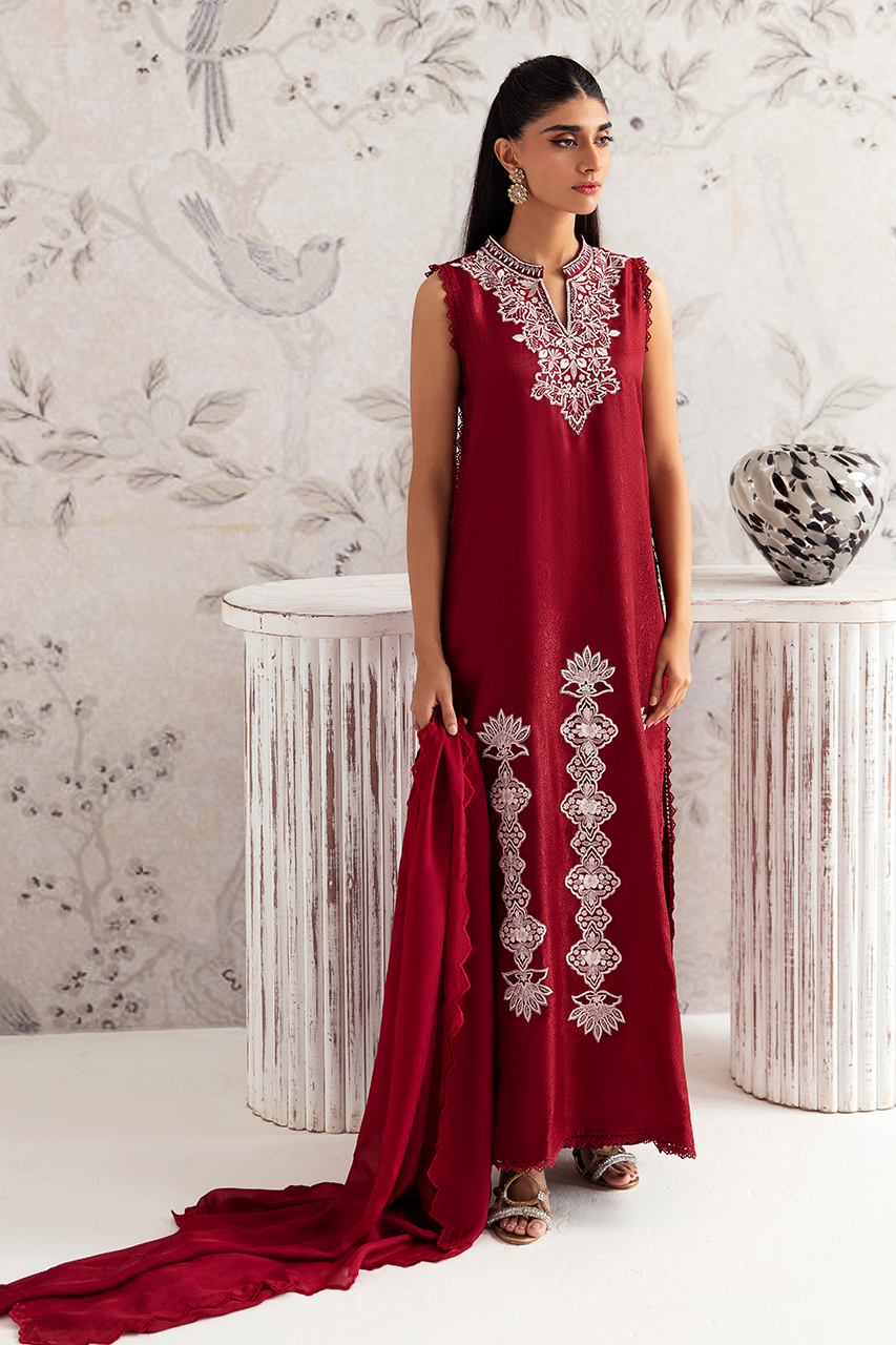 Isla is a rich maroon self-jamawar adorned with intricate thread embroidery. Accompanied by a silk dupatta adorned with delicate scallops and complemented by elegant pants, it's your moment to effortlessly steal the spotlight.
