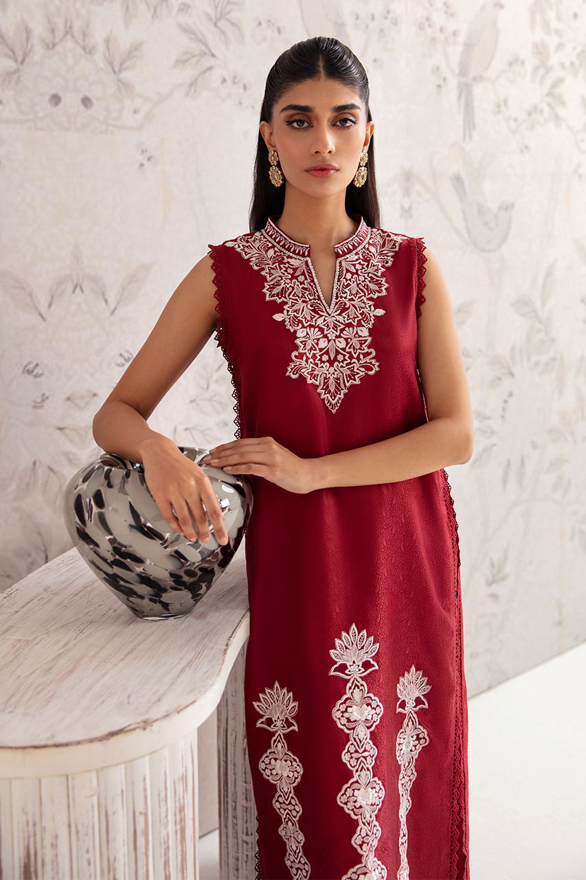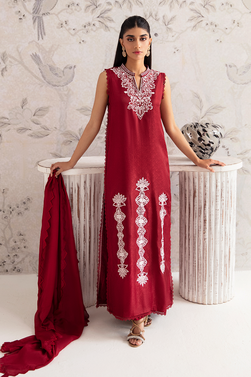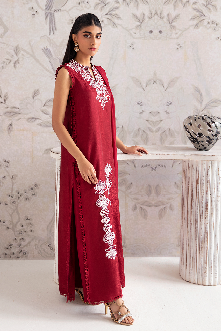 Isla is a rich maroon self-jamawar adorned with intricate thread embroidery. Accompanied by a silk dupatta adorned with delicate scallops and complemented by elegant pants, it's your moment to effortlessly steal the spotlight.