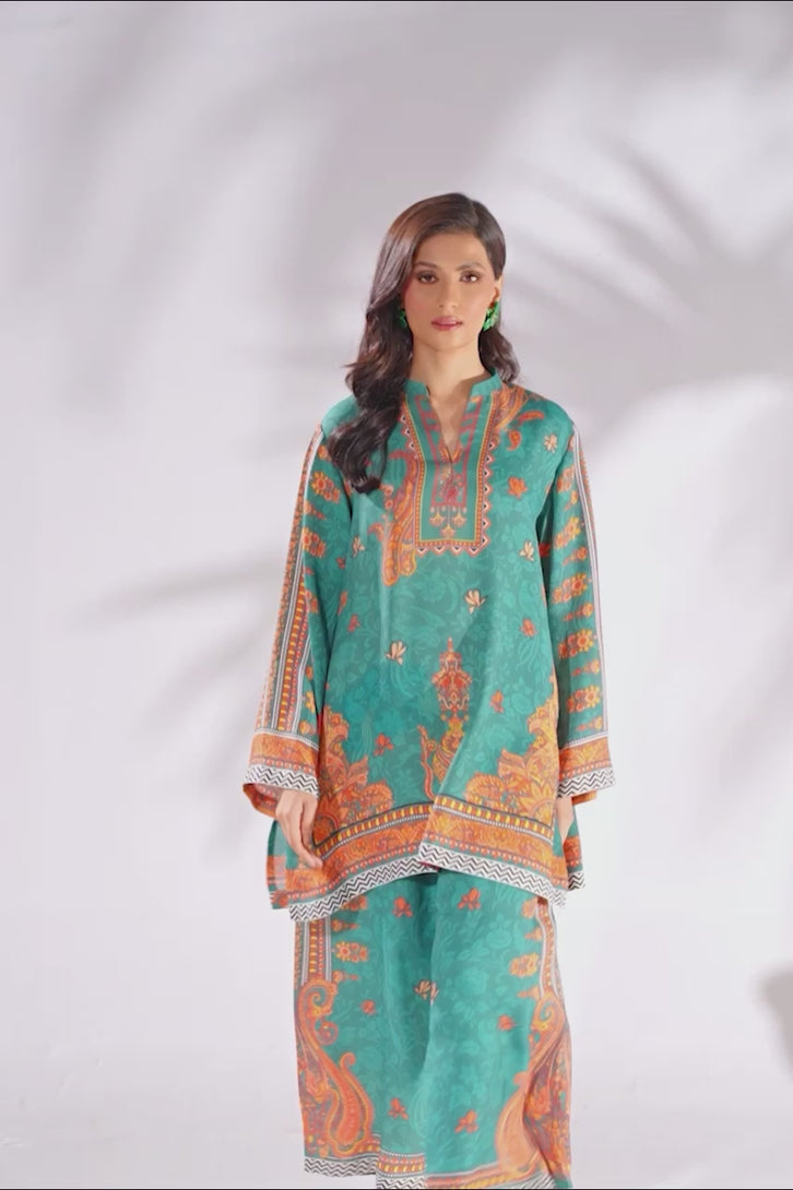 Discover our elegant greenish-grey crepe silk shirt, beautifully enhanced with intricate digital prints and vibrant orange accents. It pairs perfectly with a floral...