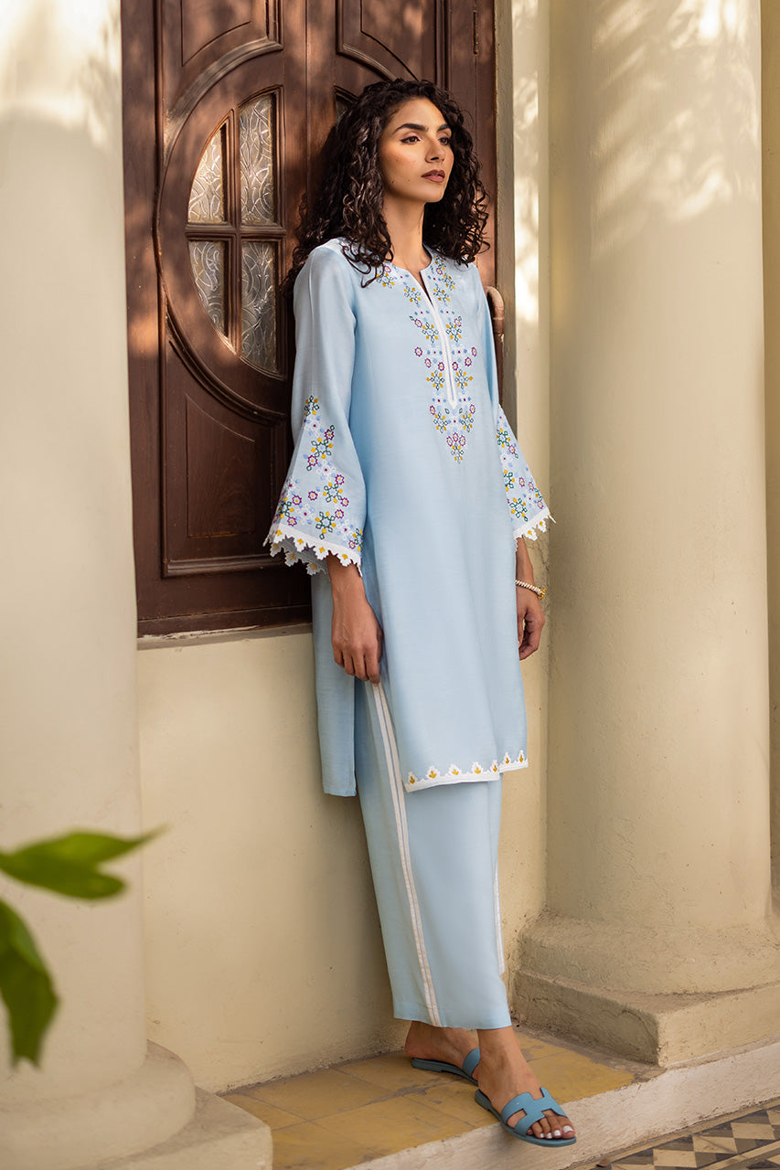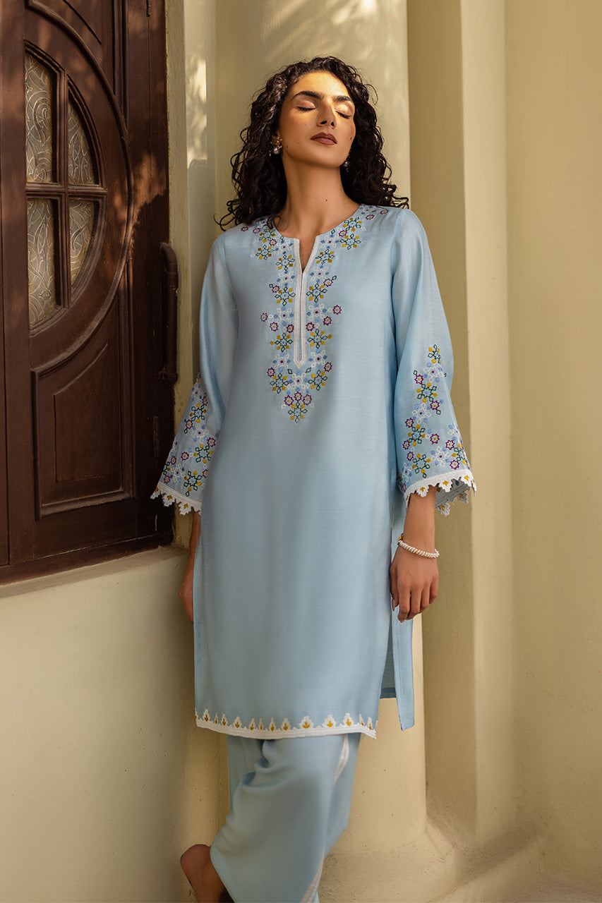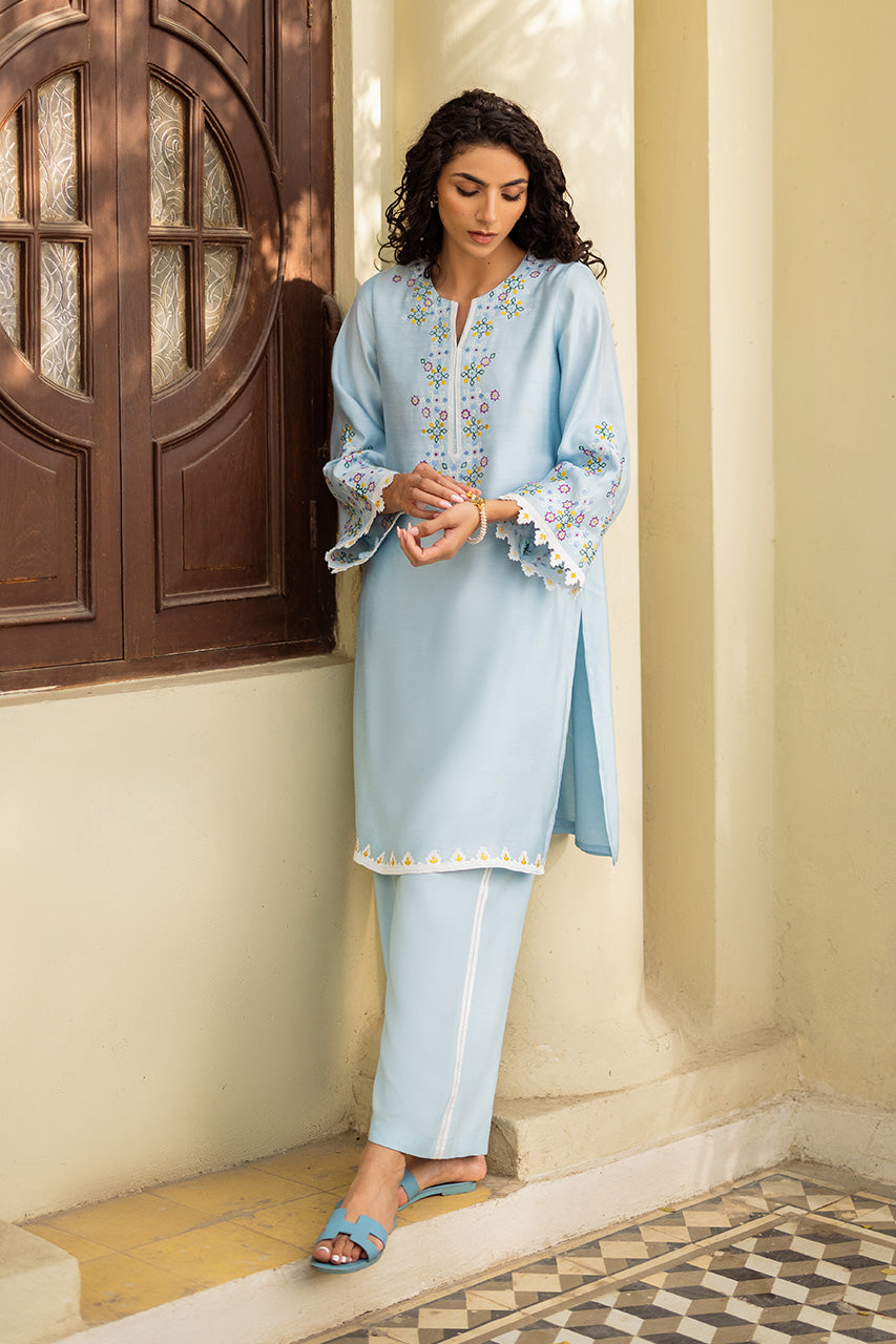 Live in a vivid floral dream with pastel accents of this beautiful outfit portrayed on a jade khadi silk canvas. The multi-hued intricate hand-worked embroidery is a treat to witness while the look is completed with khadi silk pants enhanced perfectly with laces.