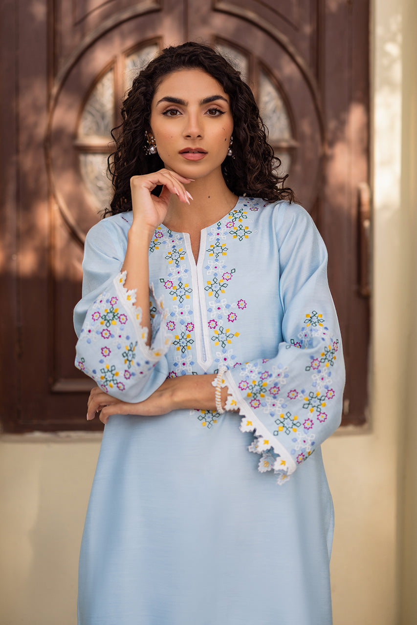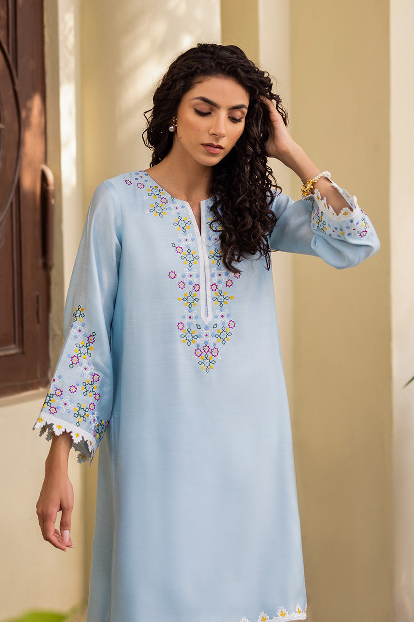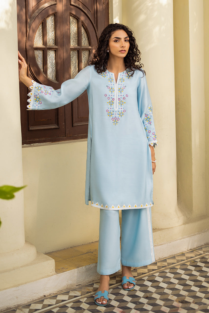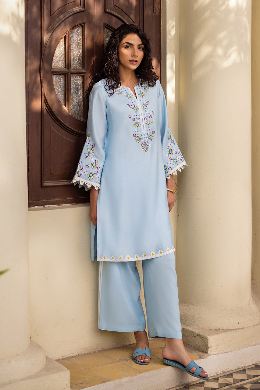 Live in a vivid floral dream with pastel accents of this beautiful outfit portrayed on a jade khadi silk canvas. The multi-hued intricate hand-worked embroidery is a treat to witness while the look is completed with khadi silk pants enhanced perfectly with laces.