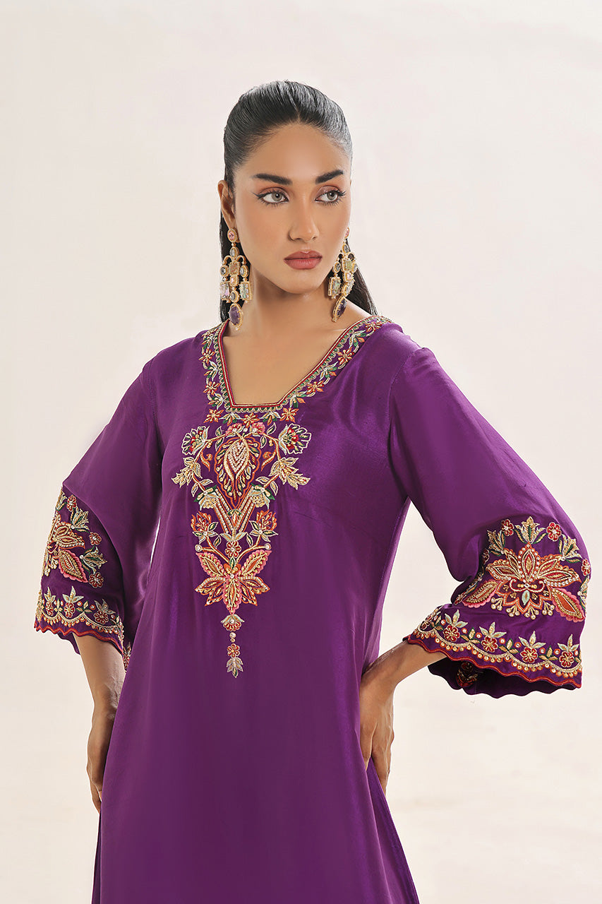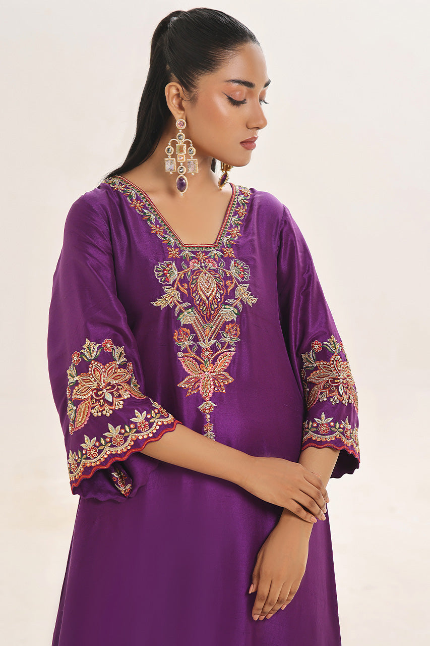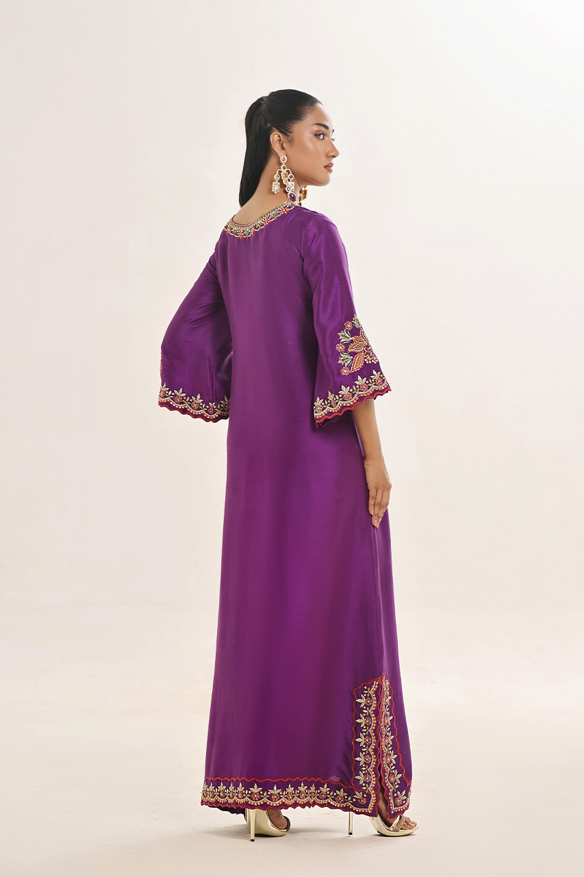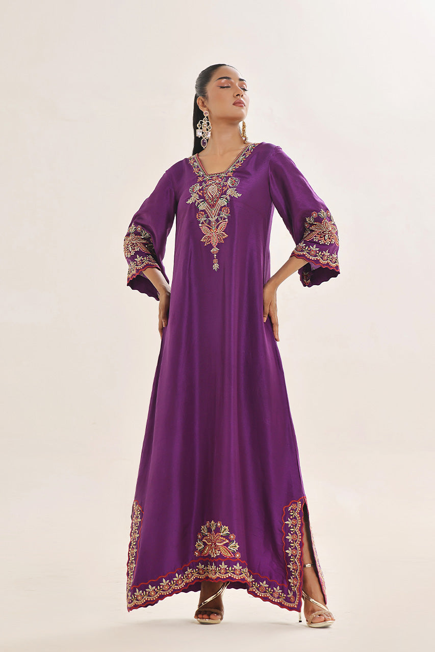 Turn heads at every event with this plum Raw Silk, three-quarter sleeve kaftan. The neckline, sleeves and bottom are richly decorated with colorful silk thread and zari work, alongwith hand embellishments with pearls and sequins. Style it with statement stilettoes for a stunning look; day or night.