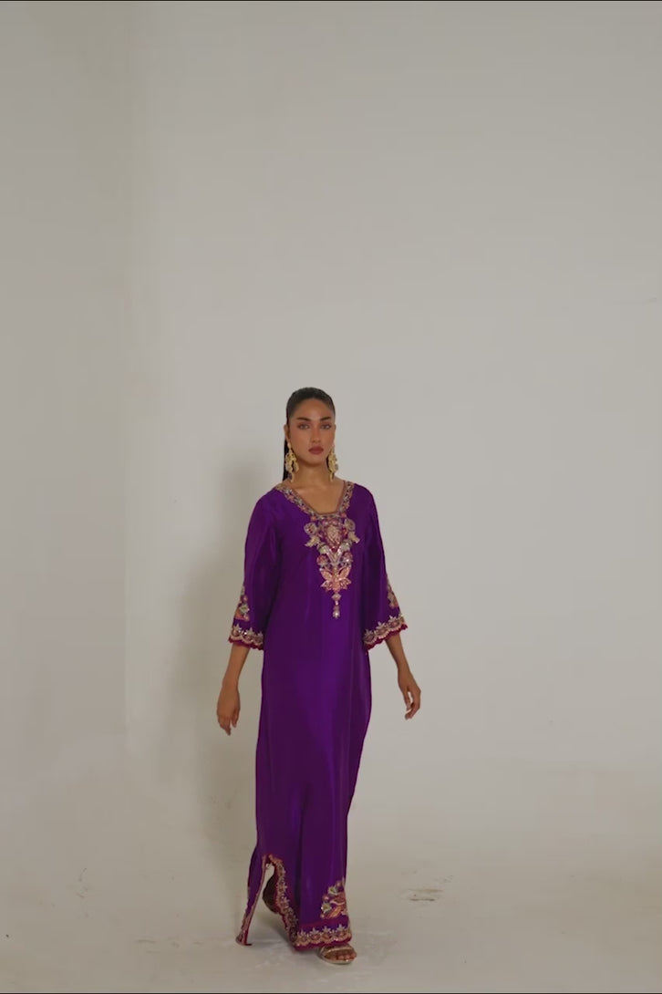 Turn heads at every event with this plum Raw Silk, three-quarter sleeve kaftan. The neckline, sleeves and bottom are richly decorated with colorful...