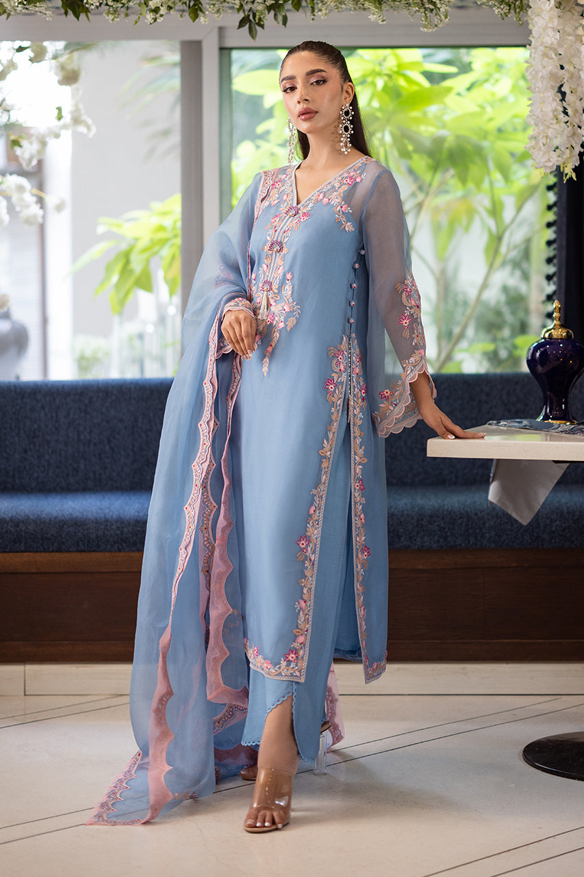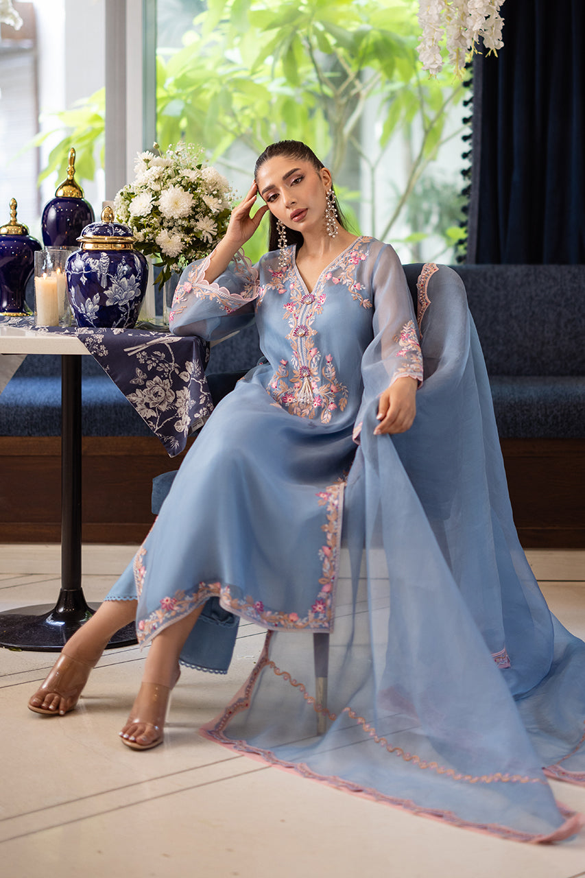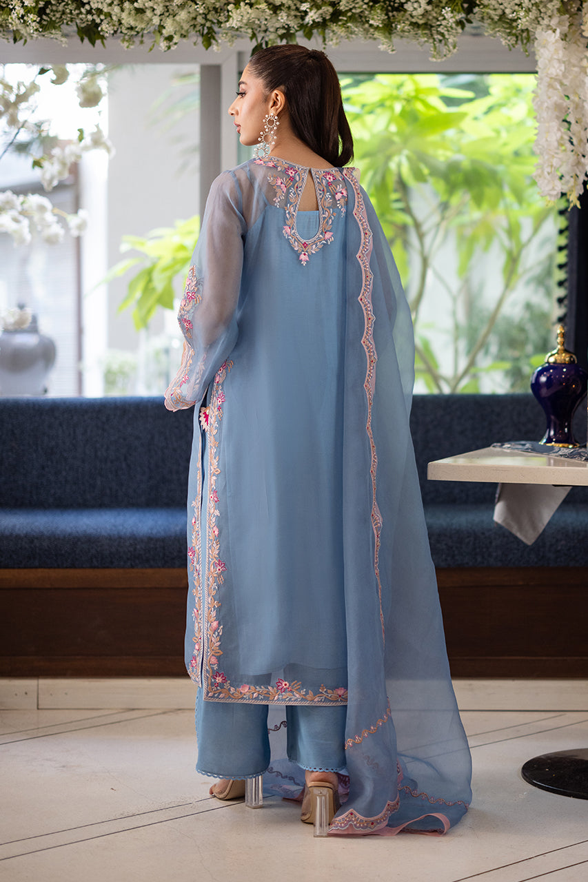 This soulful outfit Kanya features a gorgeous katan organza long shirt with heavy embellishments in a beautiful tone of blue. The keyhole neckline at the back and hanging tassels on the shirt are lifting the look ethereally. Paired with culottes pants and a pure organza dupatta accentuated with floral embroidery all over, this masterpiece is a true depiction of art for this Eid.