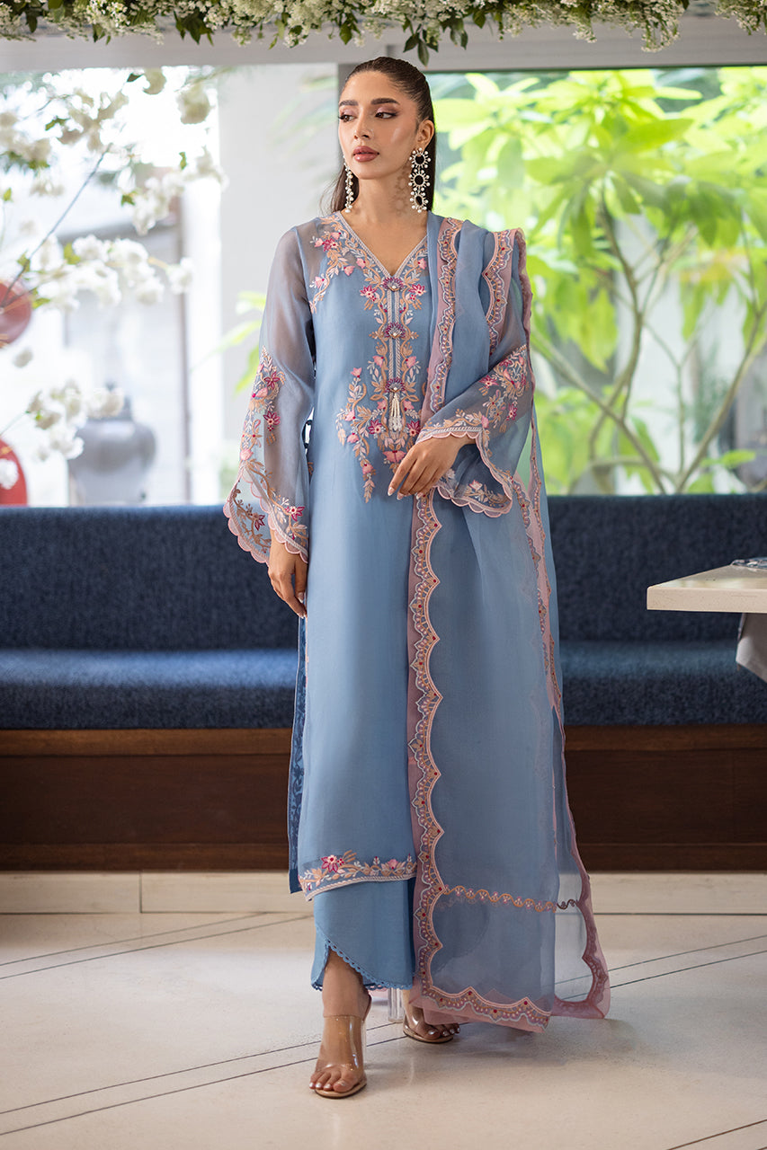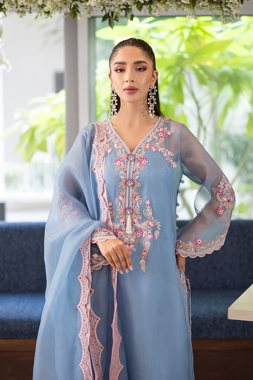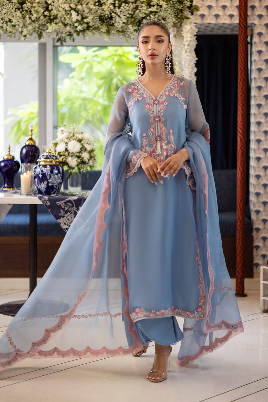 This soulful outfit Kanya features a gorgeous katan organza long shirt with heavy embellishments in a beautiful tone of blue. The keyhole neckline at the back and hanging tassels on the shirt are lifting the look ethereally. Paired with culottes pants and a pure organza dupatta accentuated with floral embroidery all over, this masterpiece is a true depiction of art for this Eid.