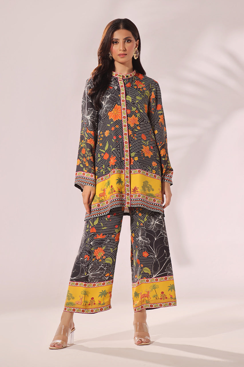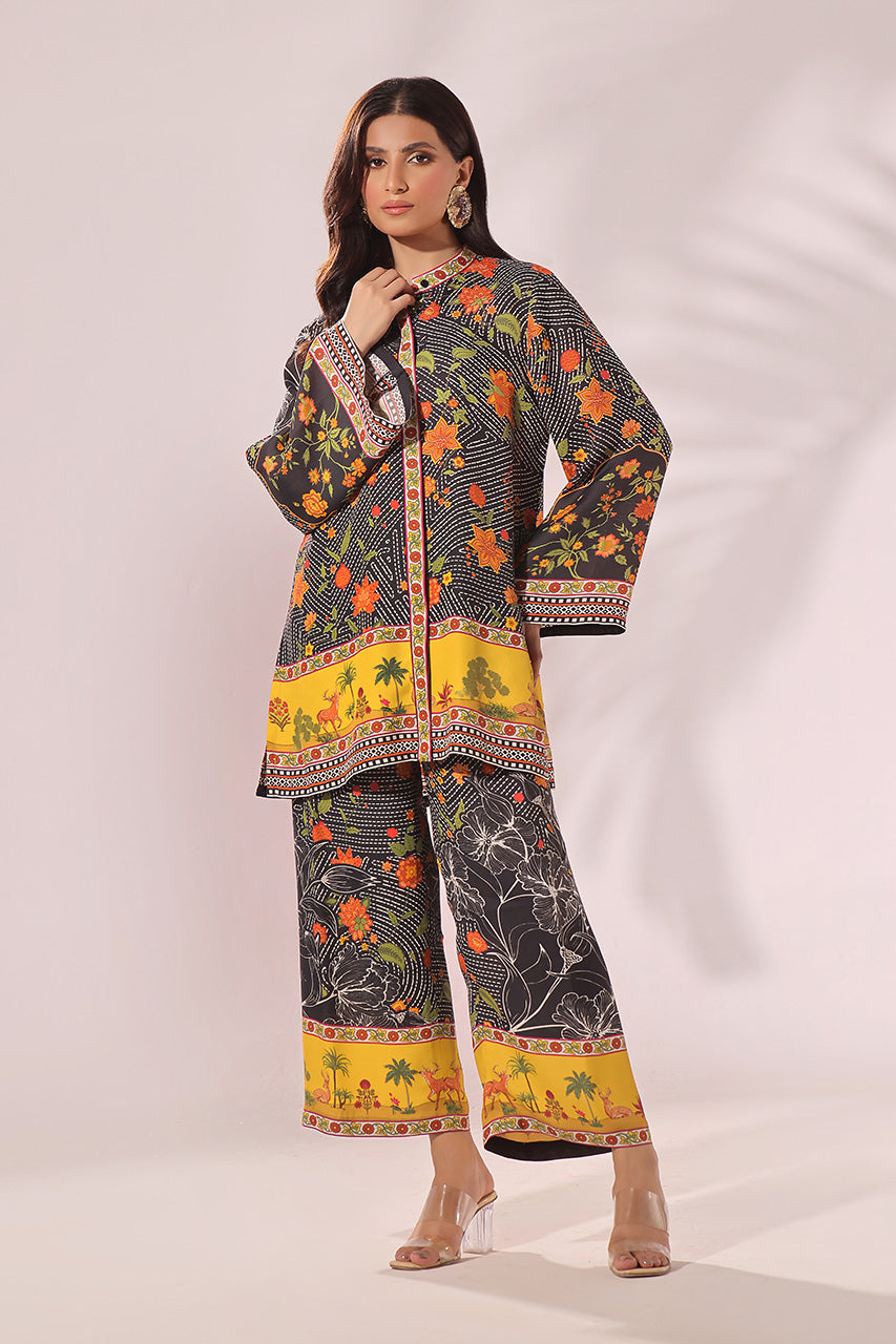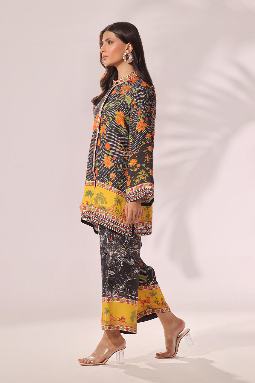 Discover a sophisticated and charming ensemble featuring a stunning black crepe silk shirt with delicate yellow accents and captivating digital prints that blend...