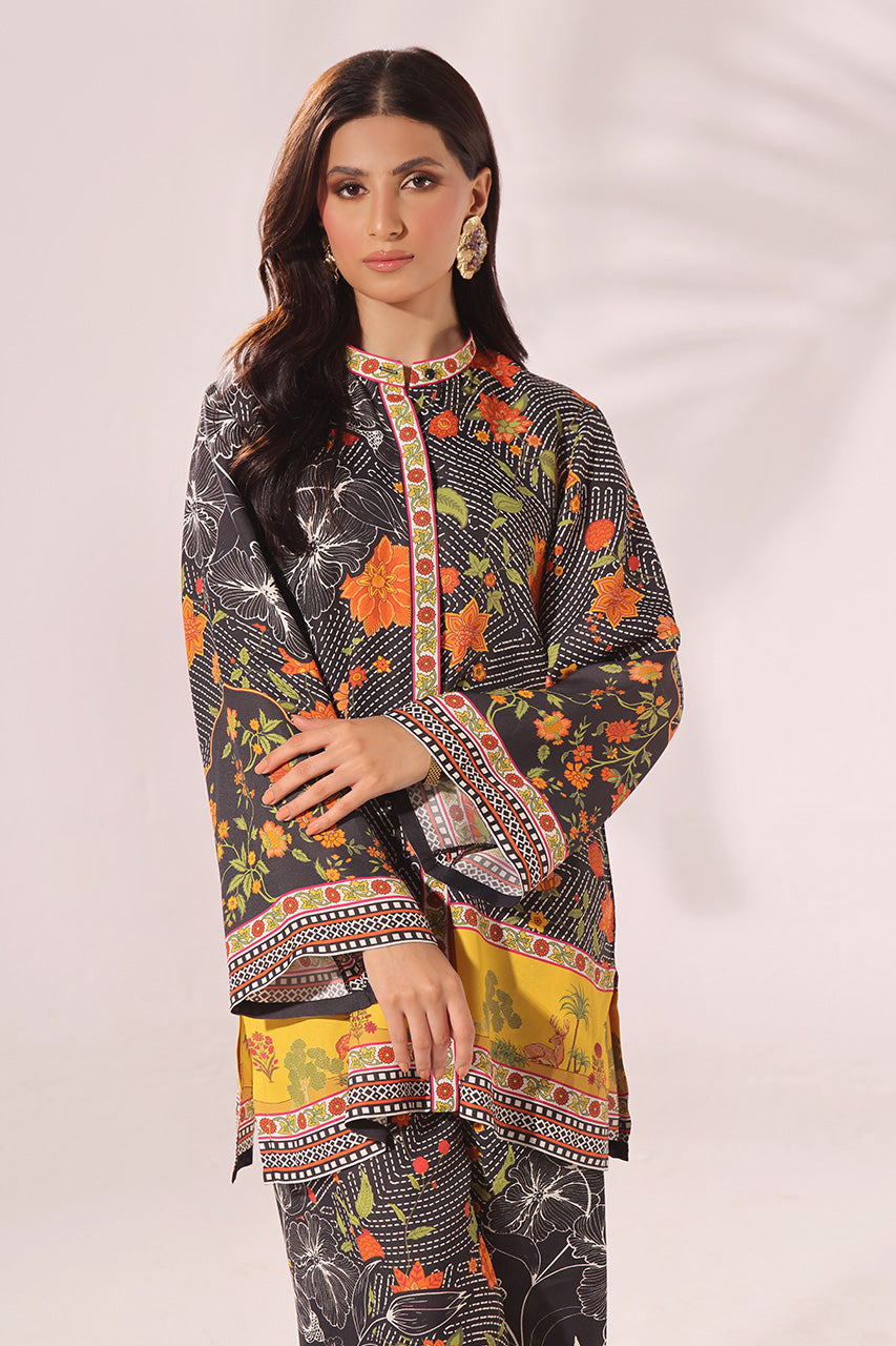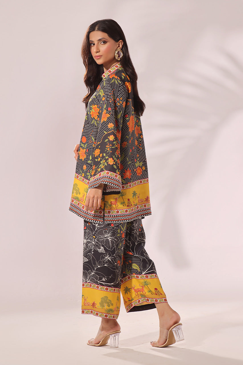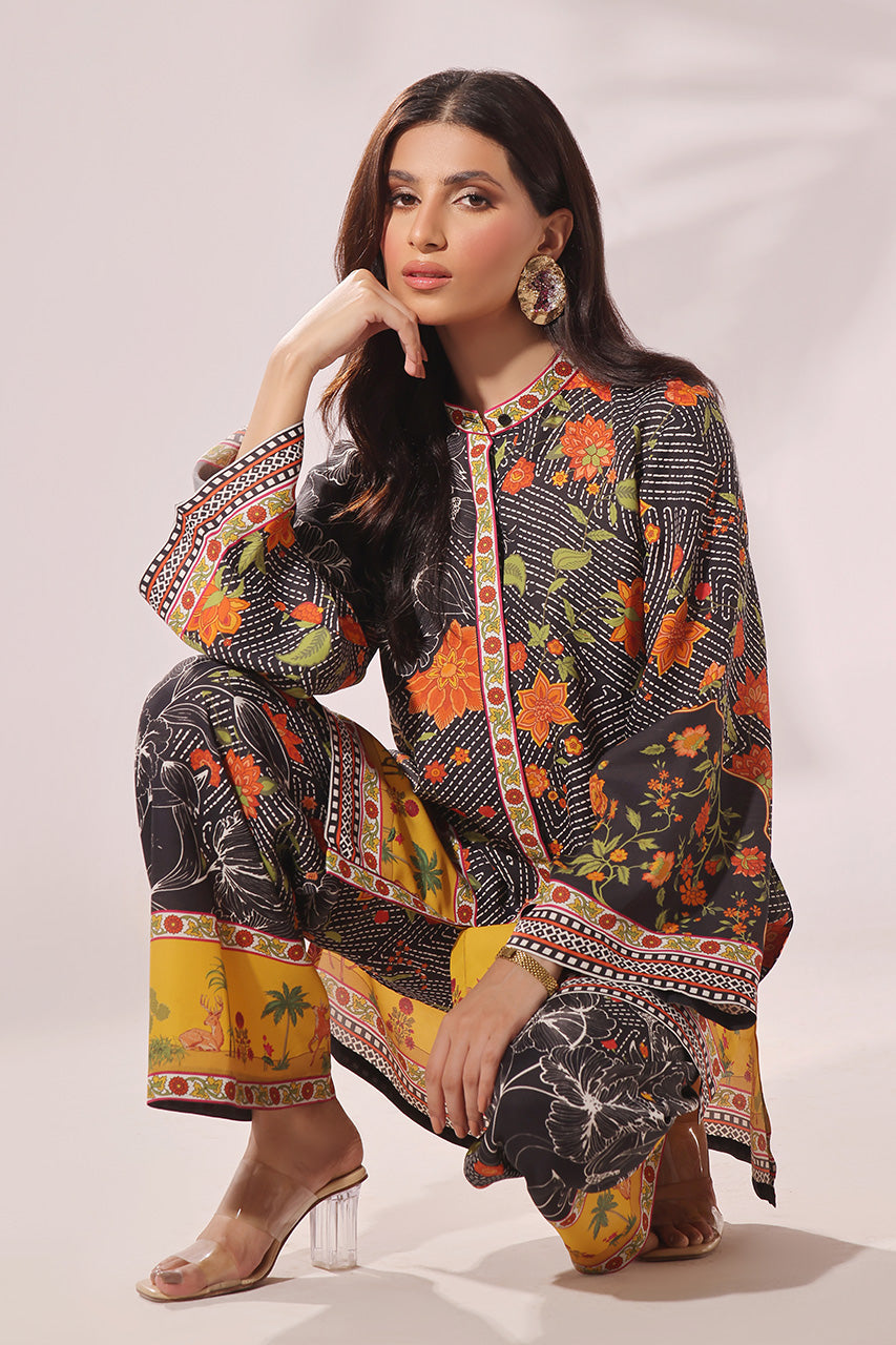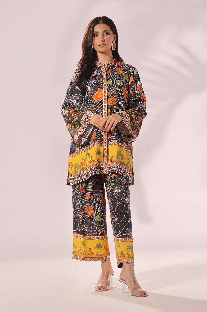 Discover a sophisticated and charming ensemble featuring a stunning black crepe silk shirt with delicate yellow accents and captivating digital prints that blend...