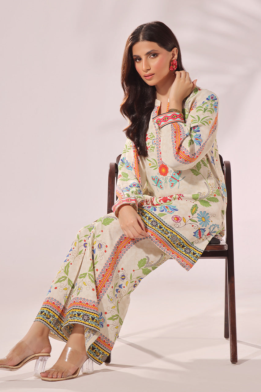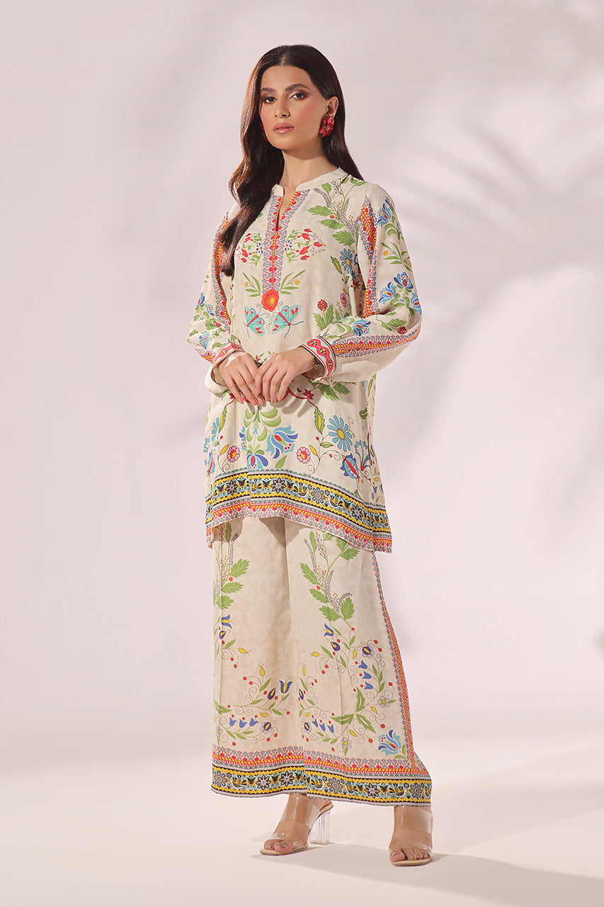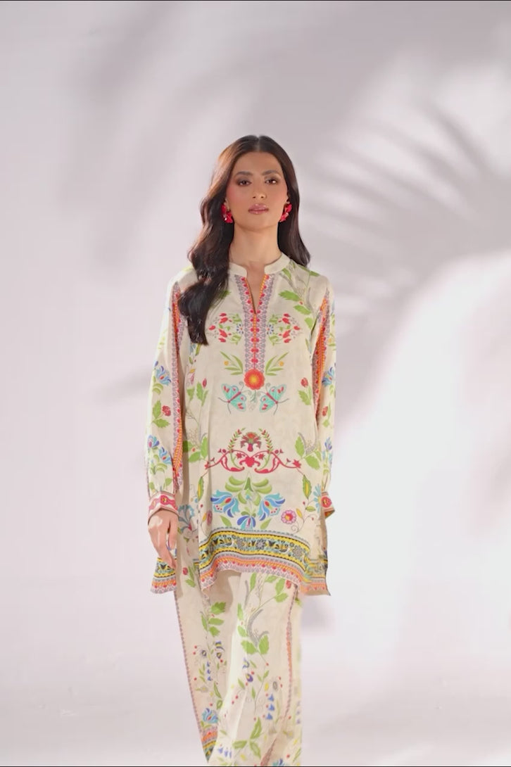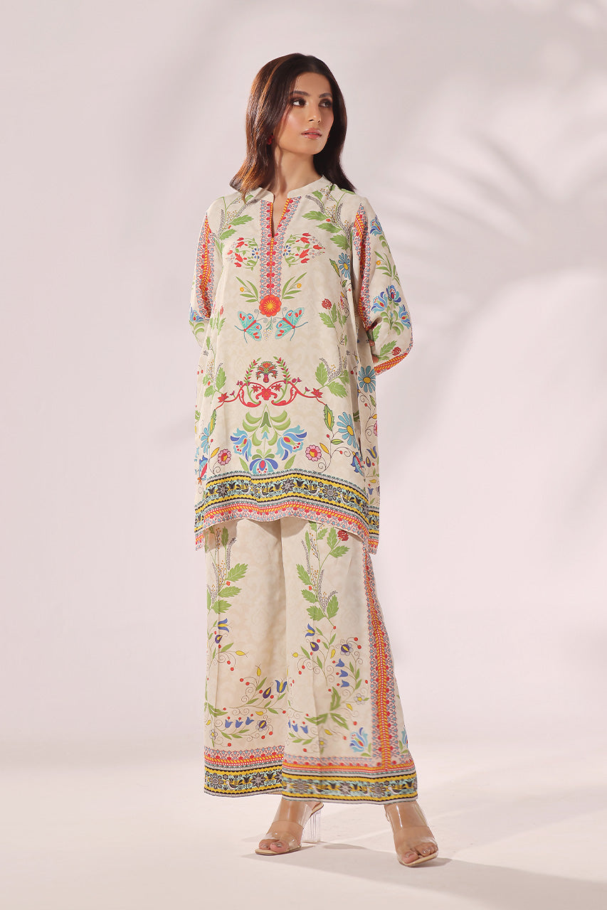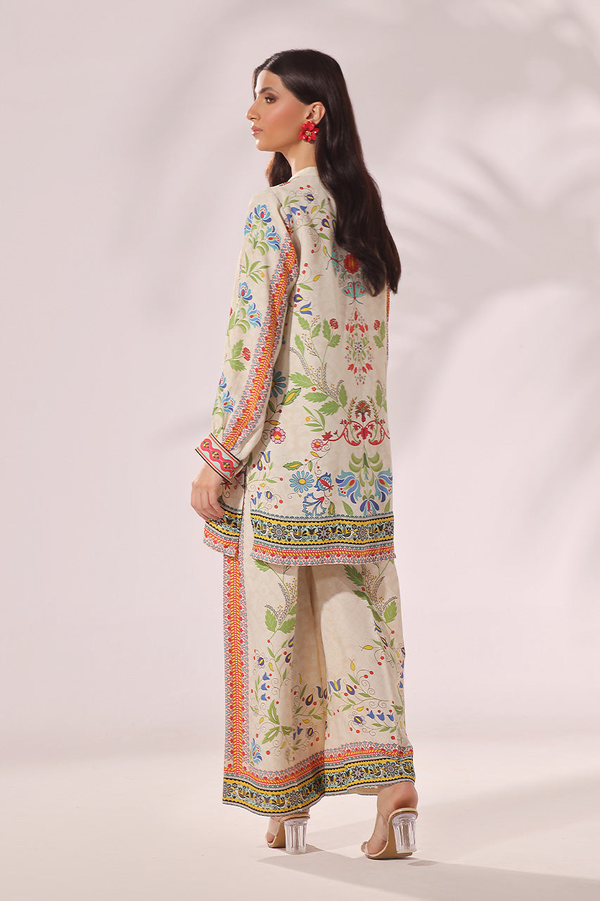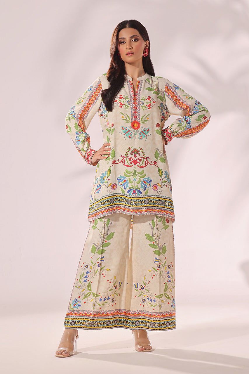 Embody cheeky sophistication in this exquisite off-white co-ord set crafted in luxurious crepe silk. This effortless silhouette features a colorful floral and botanical print, adding a playful yet sophisticated vibe. Pair it with complimenting off-white crepe silk pants, making it the perfect choice for any occasion.