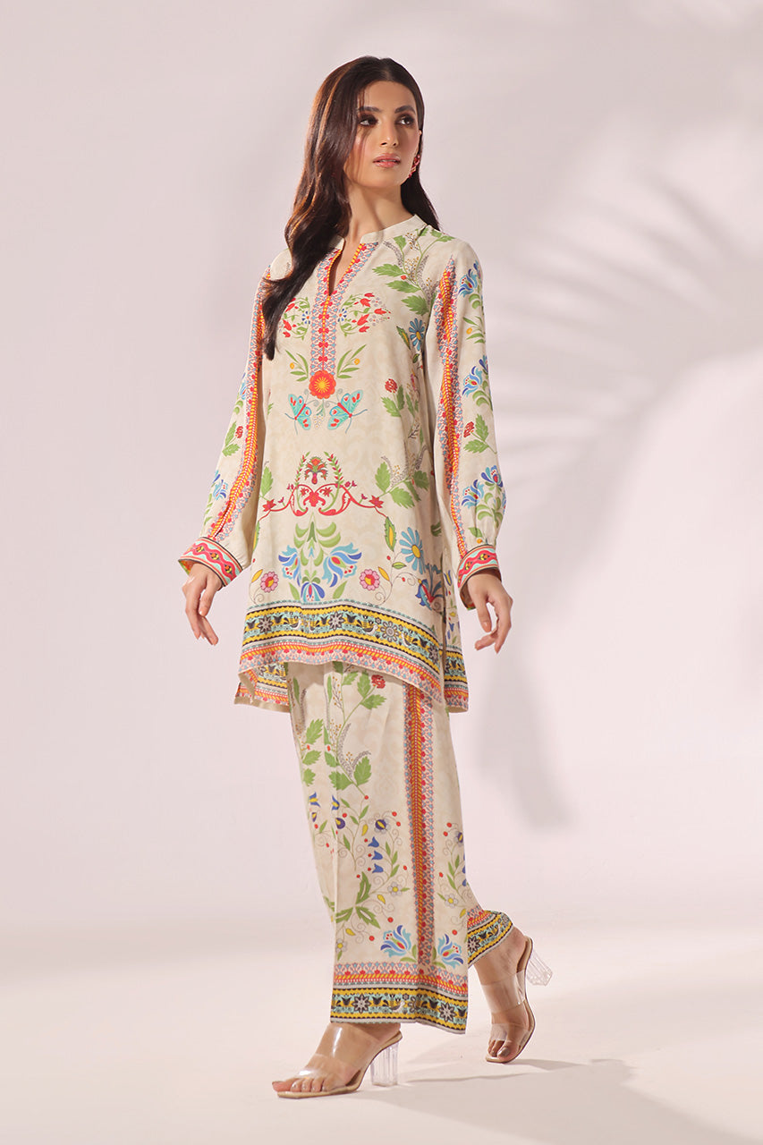 Embody cheeky sophistication in this exquisite off-white co-ord set crafted in luxurious crepe silk. This effortless silhouette features a colorful floral and botanical...