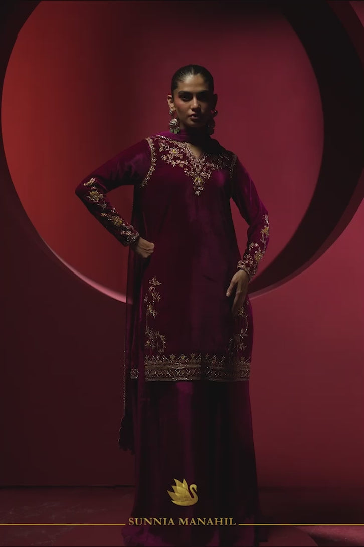 This exquisite ensemble features a knee-length velvet shirt, beautifully embellished with shimmering gold hand work and intricate floral patterns all over the neckline, sleeves and daman. The back neckline showcases a sophisticated mix of floral and geometric designs. Pair it up with complementing Silk Izar pants, which enhance the outfit's overall elegance. A medium silk dupatta, adorned with floral patterns on the corners, completes this regal look. Perfect for any occasion, this attire promises to make a stunning statement and leave a lasting impression.