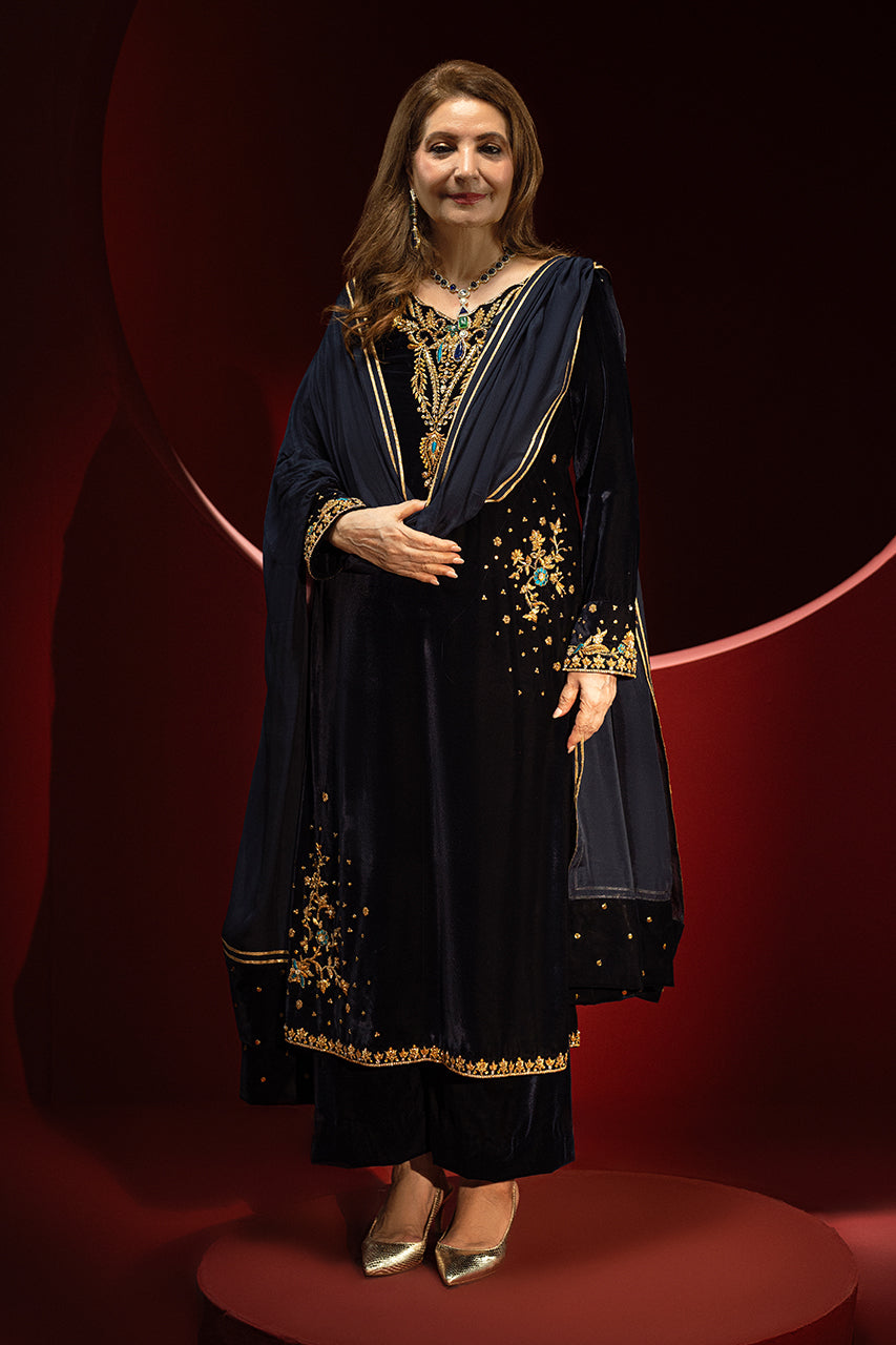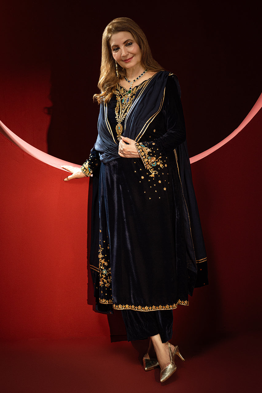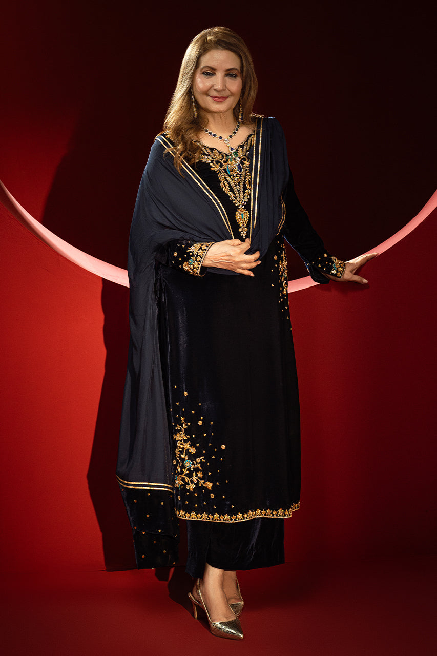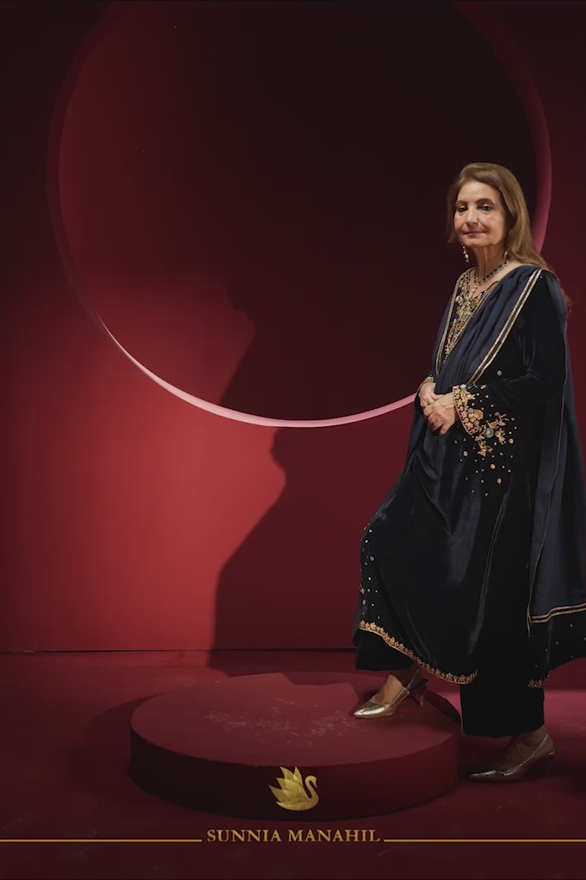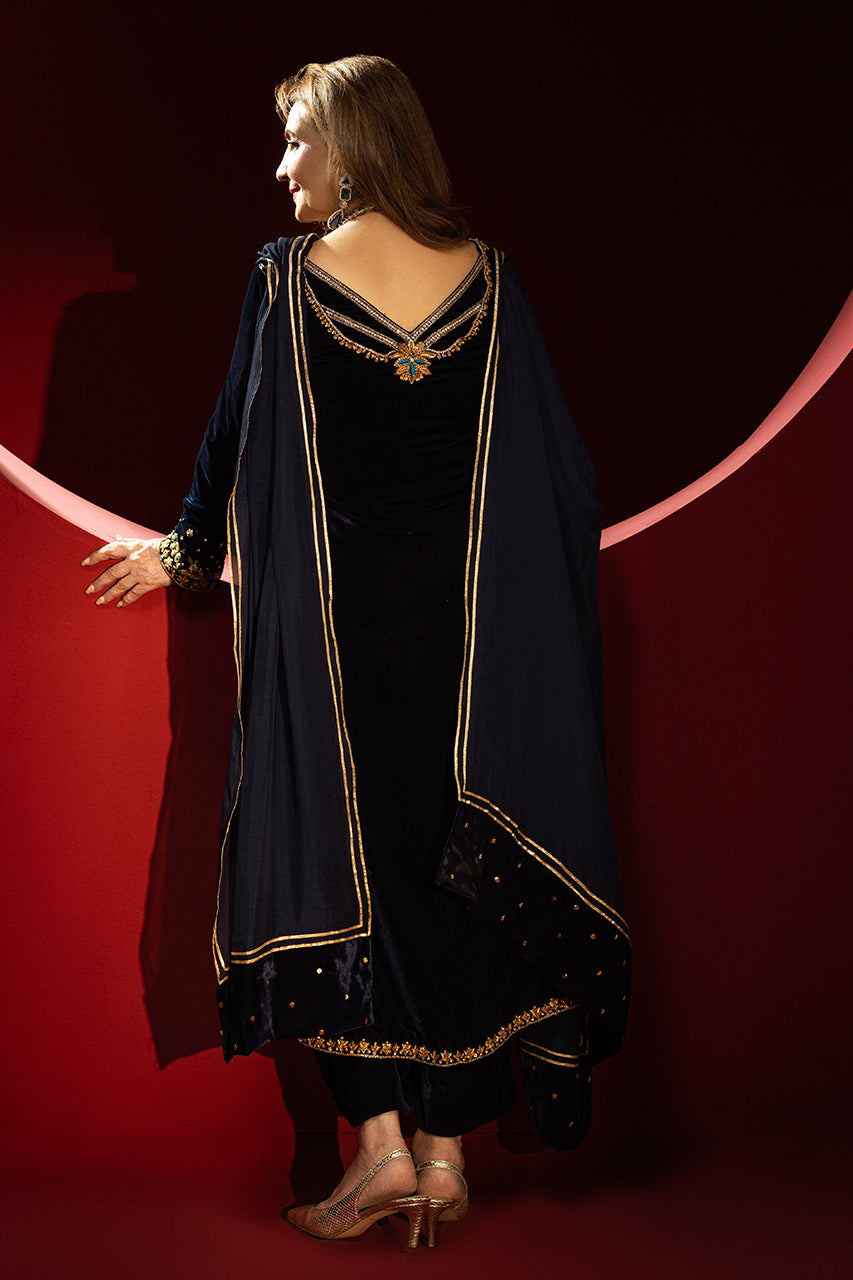 Introducing our stunning navy blue velvet long shirt, designed for elegance and sophistication. The full sleeves shirt features an intricately embellished neckline, daman, and sleeves with dabka and naqshi handwork in floral patterns, while the sparkling sequin work on the shirt enhances the design. The v-neck back neckline also boasts complimenting handwork giving a chic finish. Pair it with tailored velvet pants and a complimenting medium silk dupatta, with velvet finishing boasting sequin work, and delicate lace detailing along the border. Elevate your wardrobe with this exceptional outfit.
