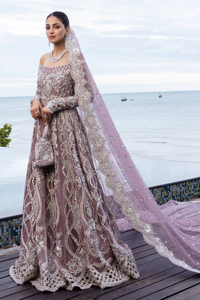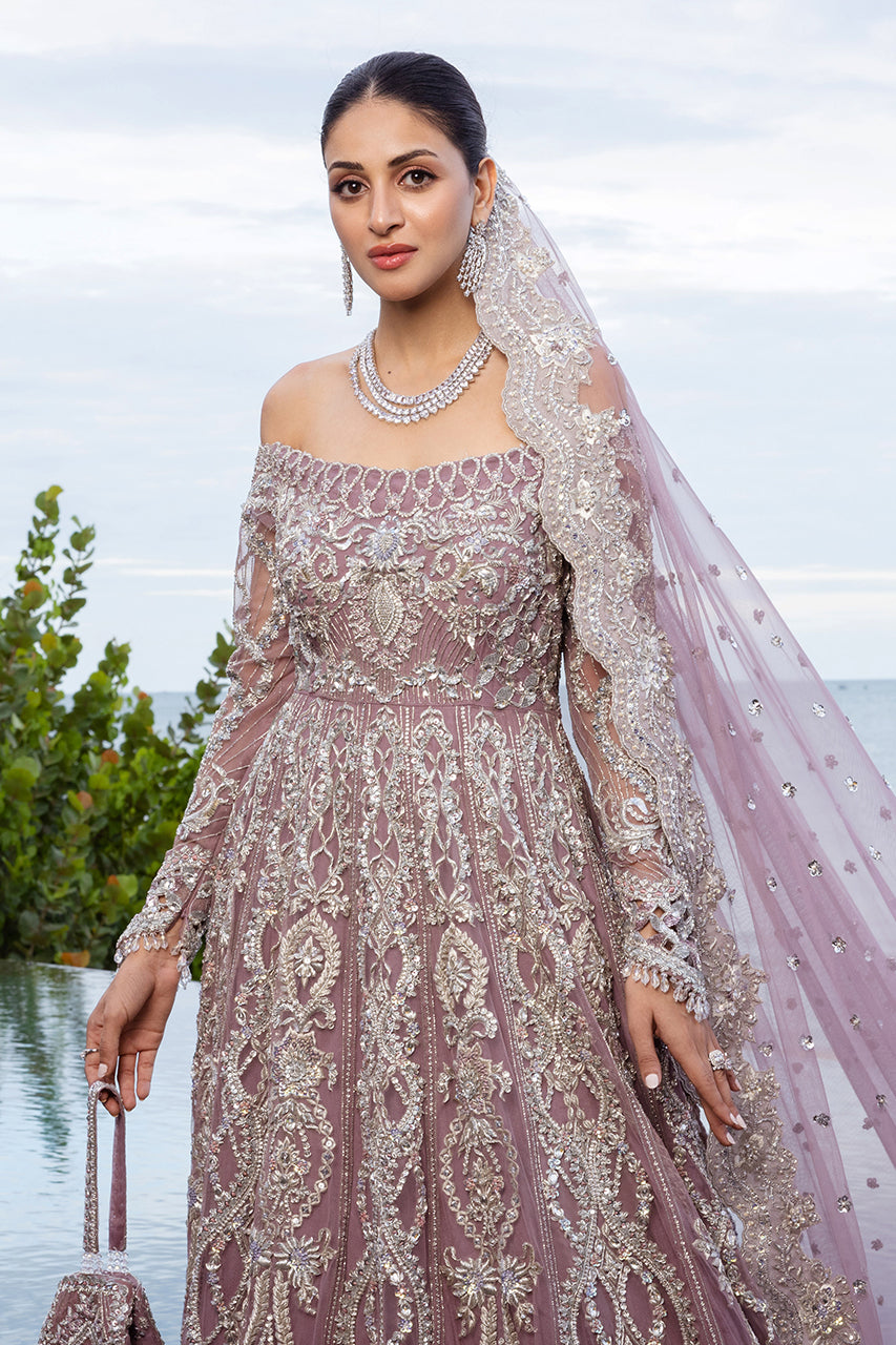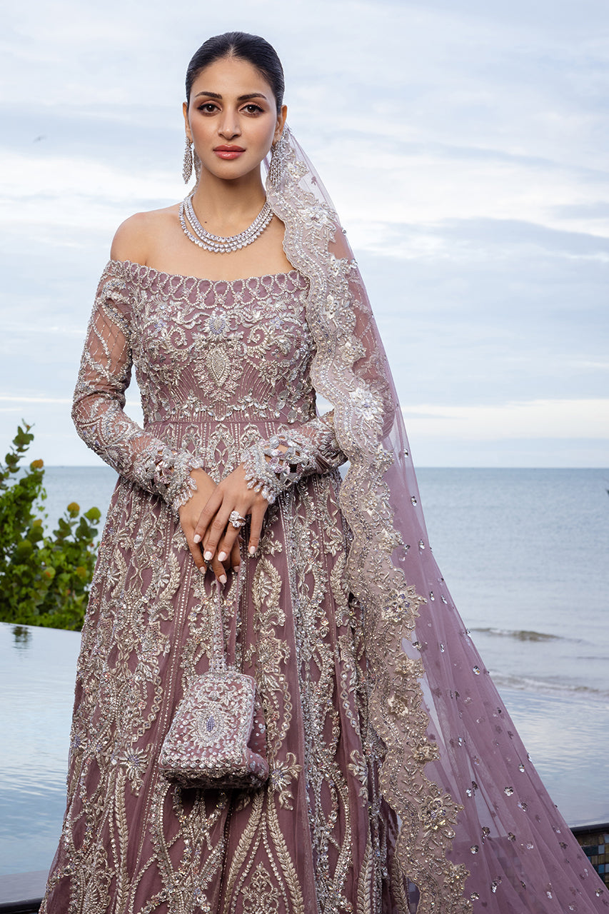 An embroidered net gown with off-shoulder straps and intricate pointed sleeves exudes sophistication. The delicate cutwork on the open back adds allure, while the trailing net dupatta, adorned with sequins, completes this masterpiece in subtle style.