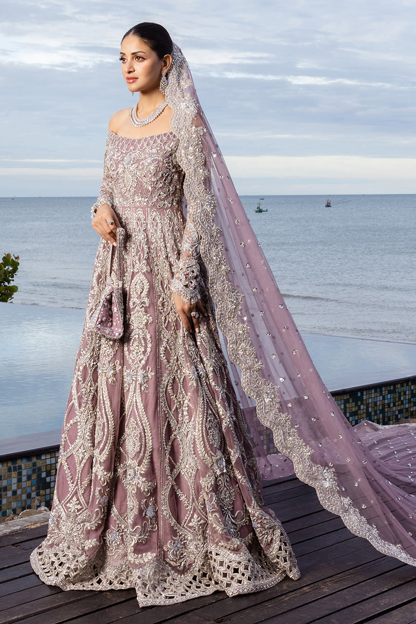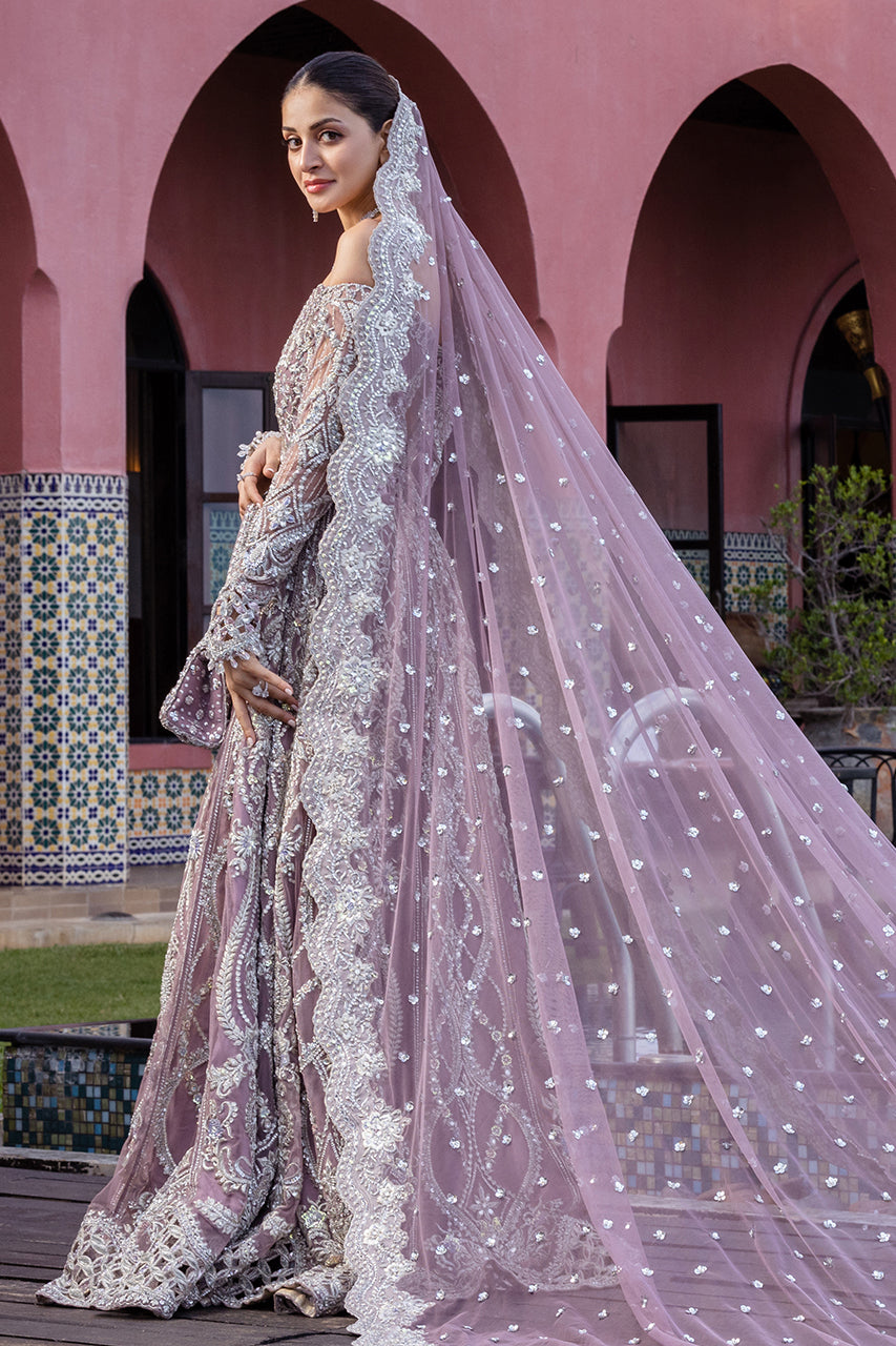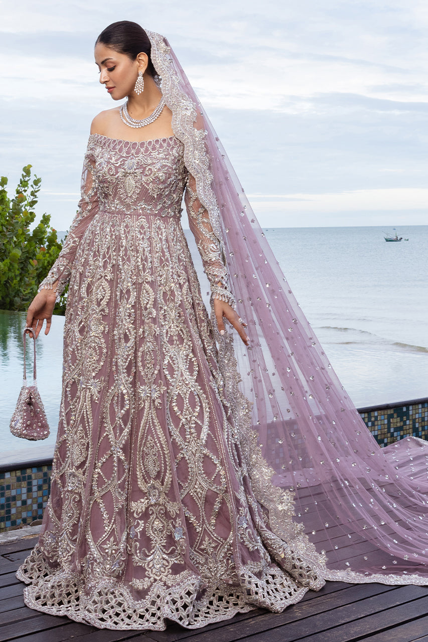 An embroidered net gown with off-shoulder straps and intricate pointed sleeves exudes sophistication. The delicate cutwork on the open back adds allure, while the trailing net dupatta, adorned with sequins, completes this masterpiece in subtle style.