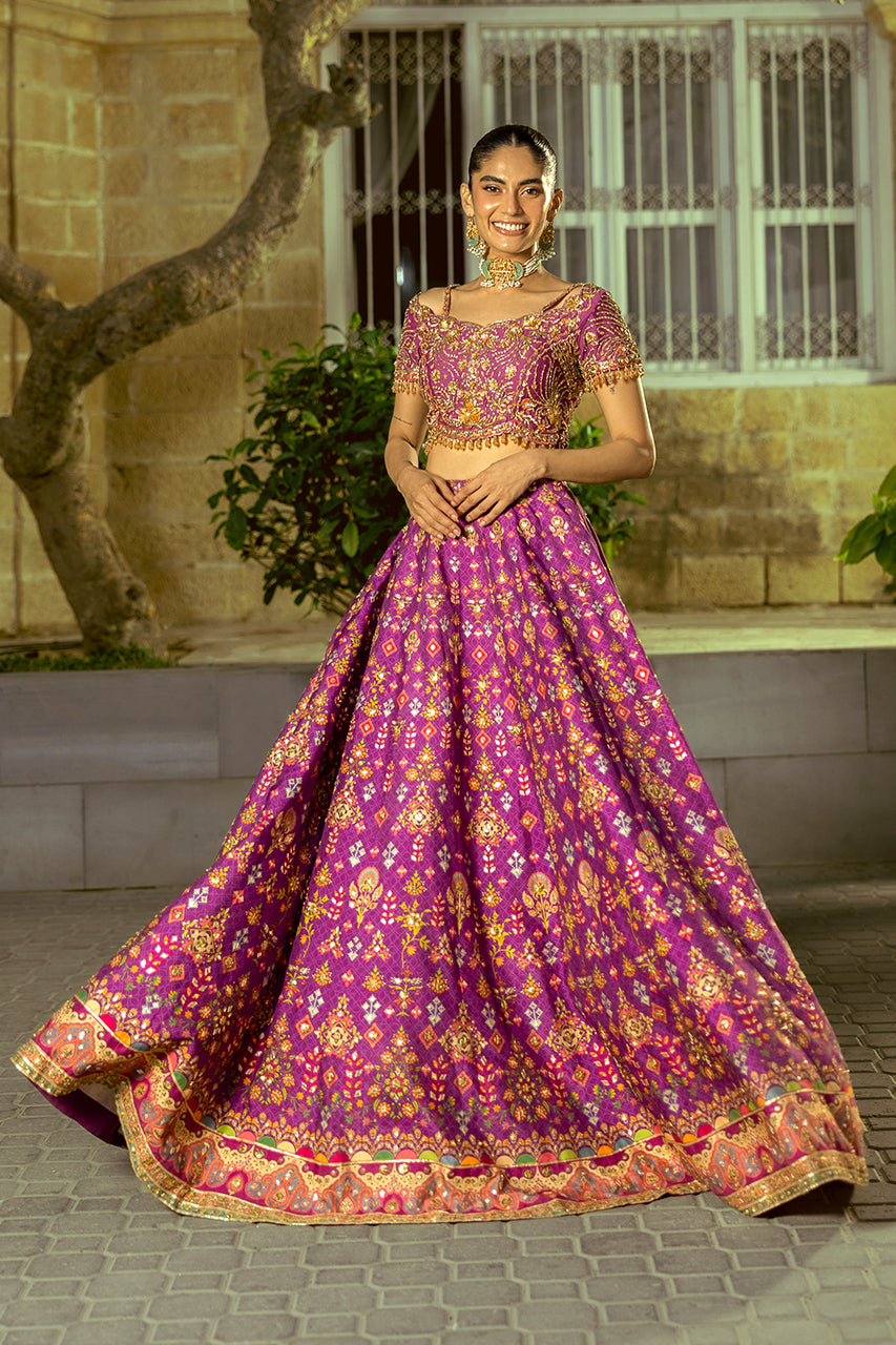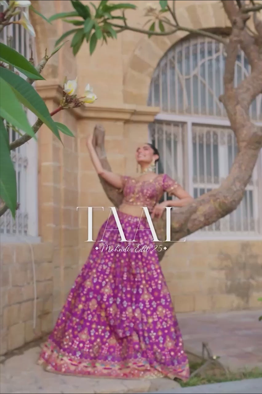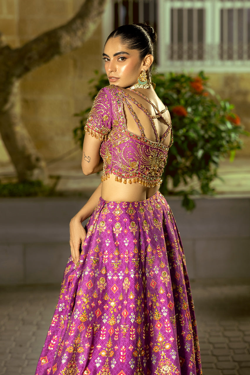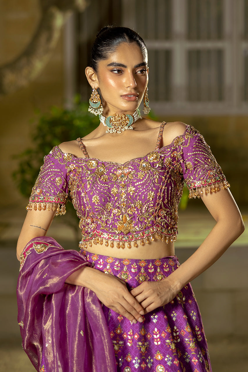 Majestic and refined, this purple Katan silk bodice is a true statement piece, featuring full embroidery throughout, enriched with tassel hangings that flow elegantly across the front and back. The back is further accentuated with delicate cutwork, adding depth and a hint of allure to the structured silhouette. It is paired with a silk digital lehenga, adorned with sequin work and designed in a vibrant interplay of colors, bringing a modern vibrancy to the traditional ensemble. A zari organza dupatta, subtly shimmering with scattered sequin detailing, completes the look with a soft, regal glow.