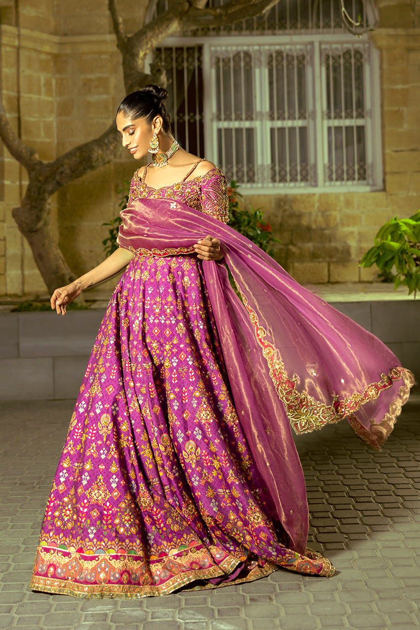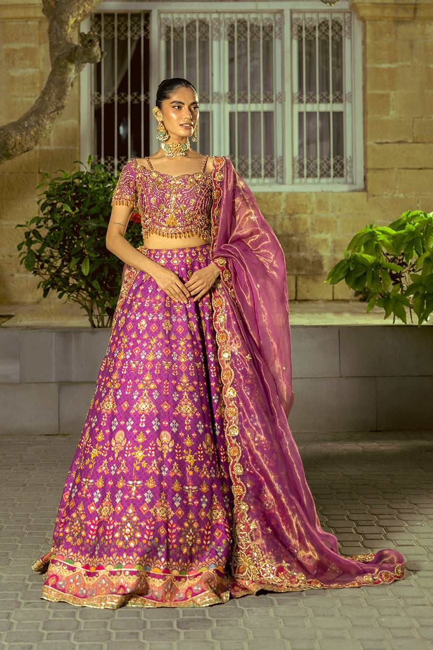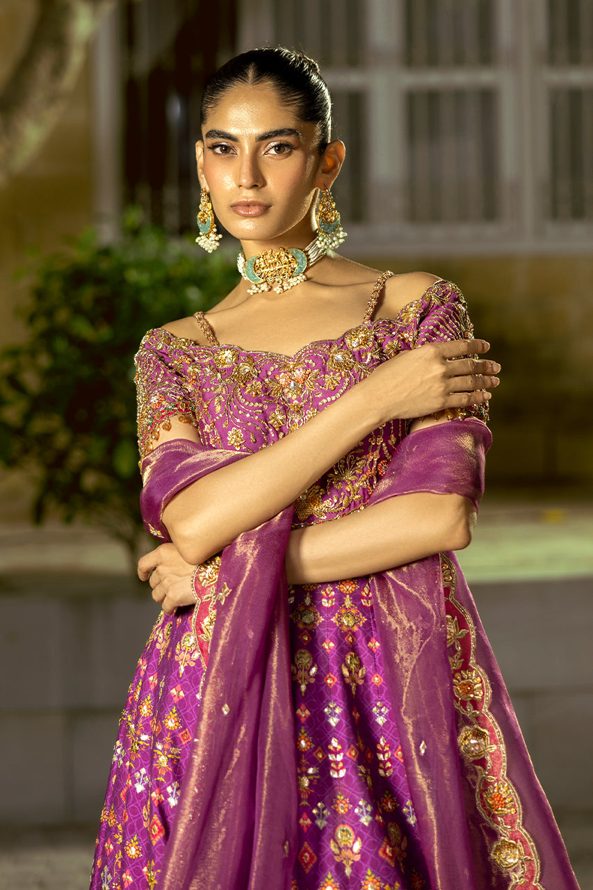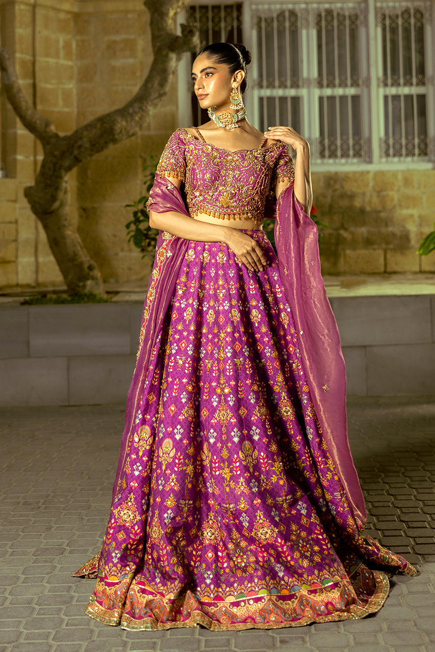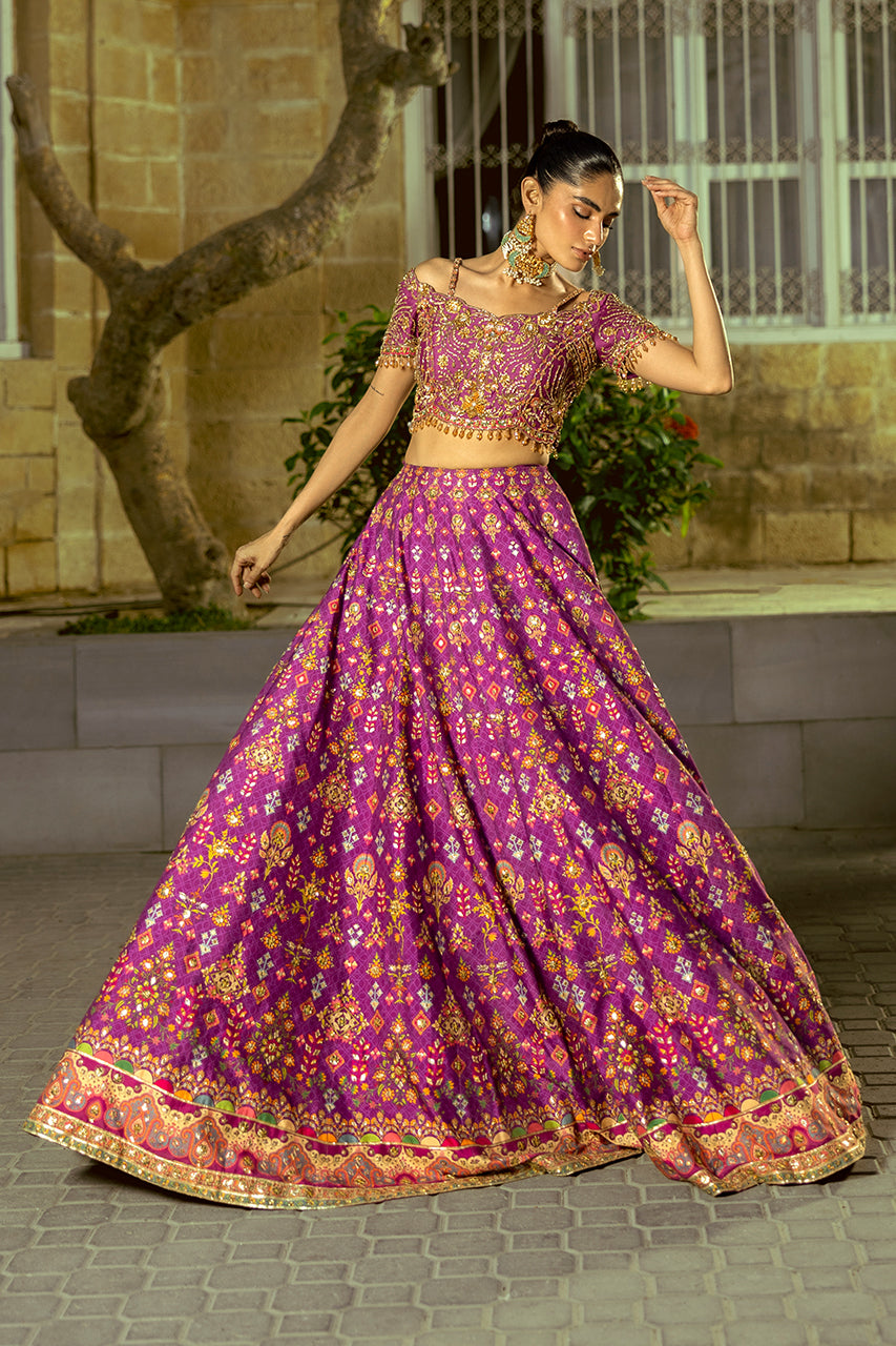 Majestic and refined, this purple Katan silk bodice is a true statement piece, featuring full embroidery throughout, enriched with tassel hangings that flow elegantly across the front and back. The back is further accentuated with delicate cutwork, adding depth and a hint of allure to the structured silhouette. It is paired with a silk digital lehenga, adorned with sequin work and designed in a vibrant interplay of colors, bringing a modern vibrancy to the traditional ensemble. A zari organza dupatta, subtly shimmering with scattered sequin detailing, completes the look with a soft, regal glow.