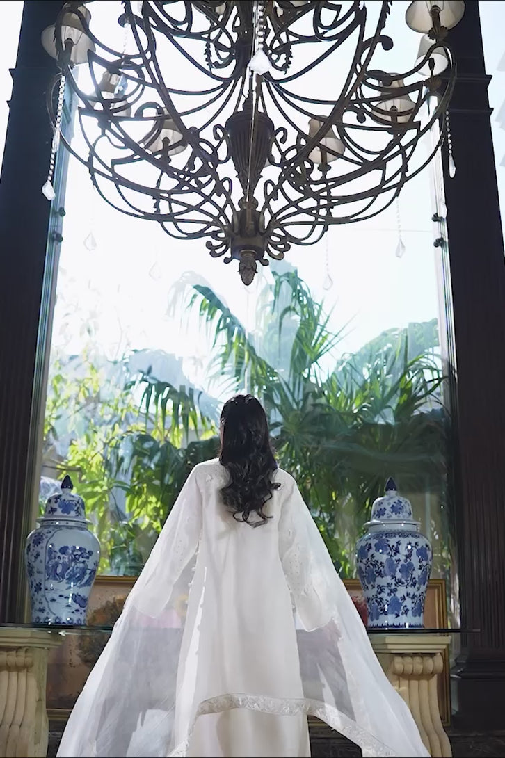 An elegant ensemble crafted from pure raw silk, embodying understated luxury in cloud dancer ivory shade. The detailed neckline and embroidered borders with 3D bunches and cut work enhance the couture appeal, while crushed silk pants bring texture and contemporary flair. Finished with uniquely designed sleeves and tailored cuffs, this look is modern, polished, and effortlessly luxe. The silhouette is complimented with a sheer pure organza dupatta embroidered on all four sides to complete the look.