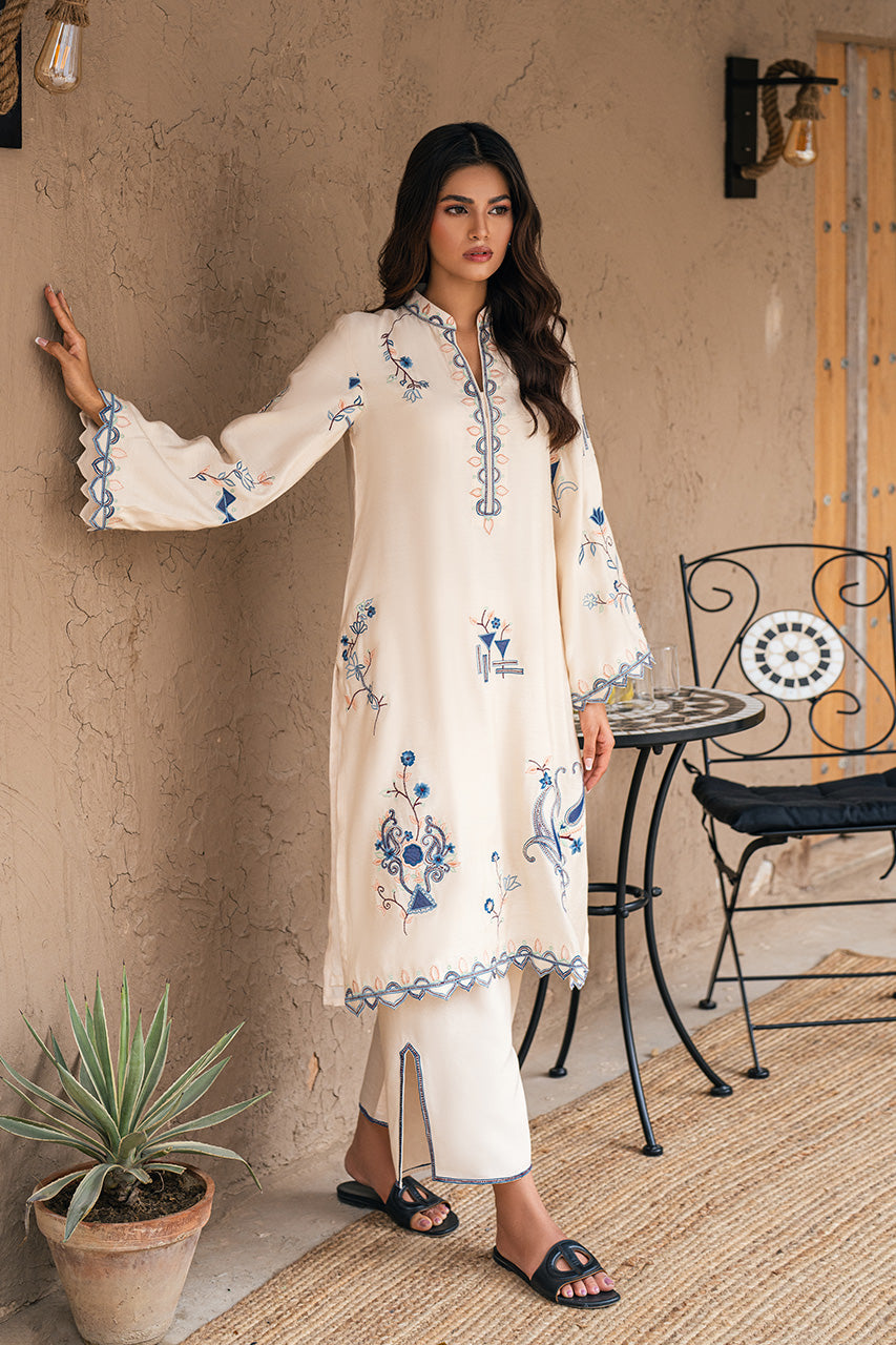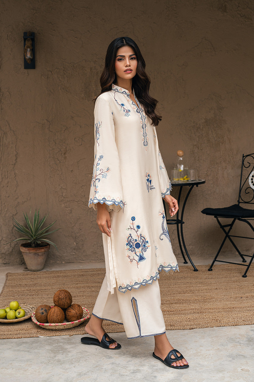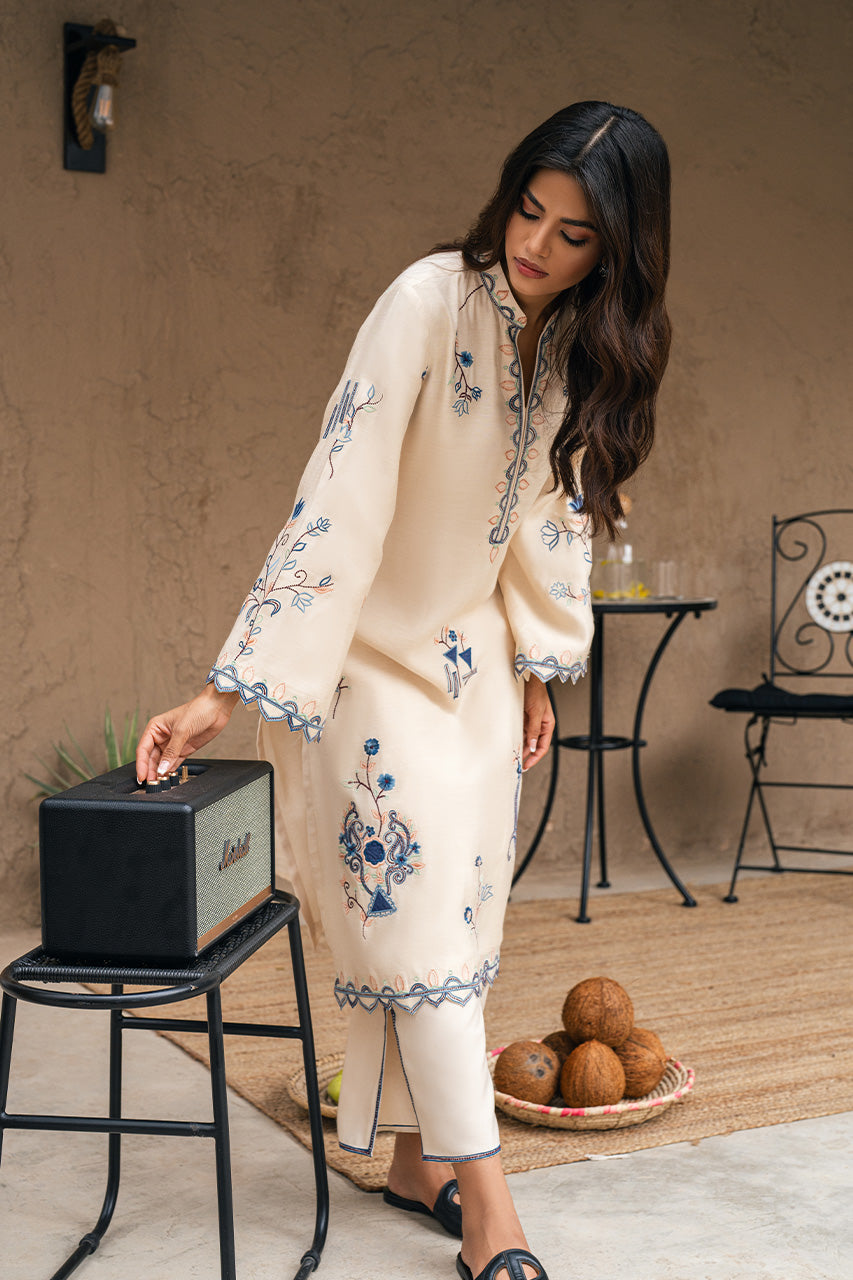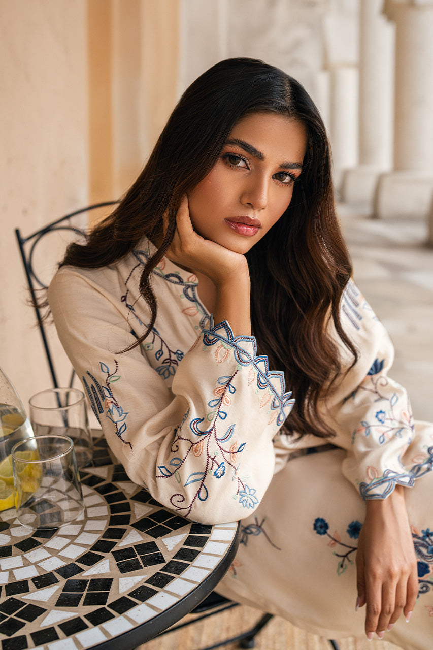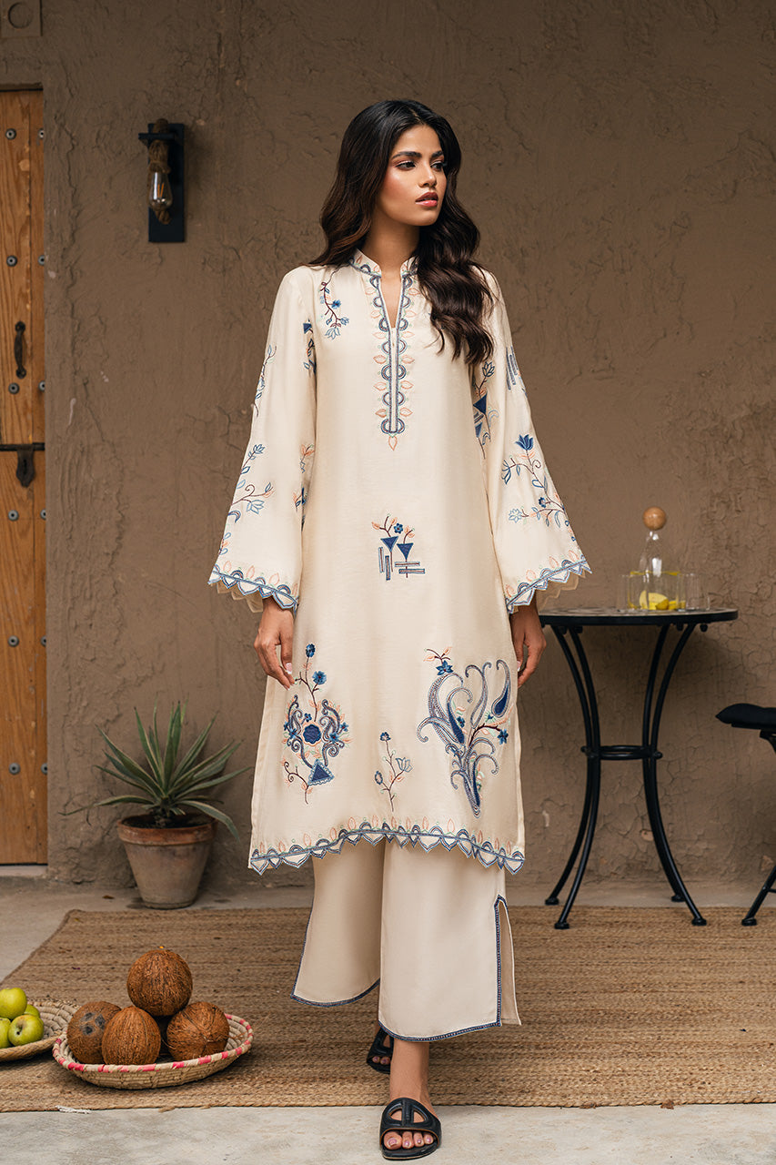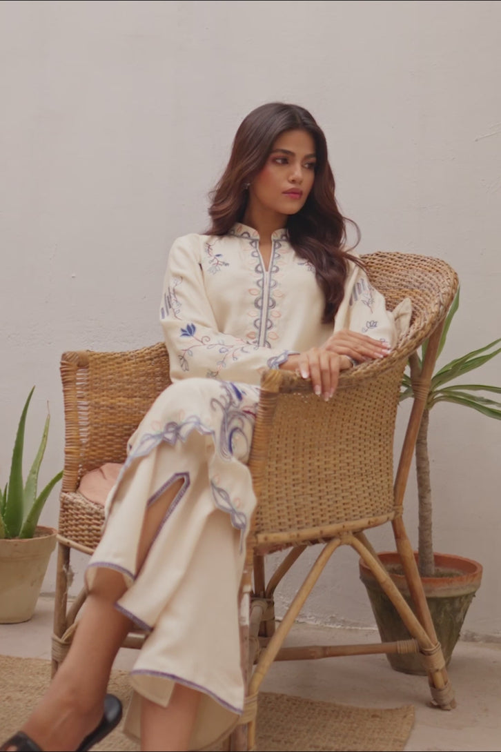 Set a graceful style statement this Eid with this stunning Cream khadi silk shirt beautifully hand worked with intricate embroidery and scalloped finishing. Paired with slit open Cream pants, this look is heavenly for a minimal yet festive attire!