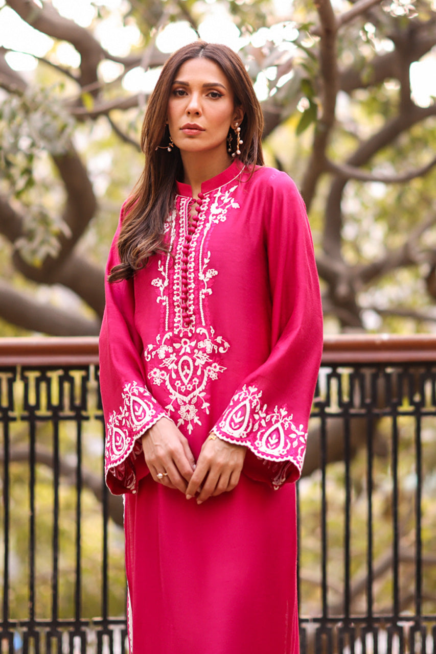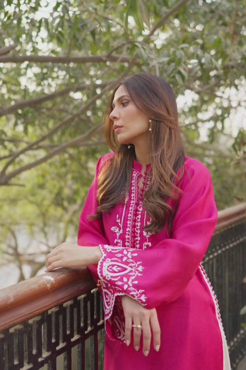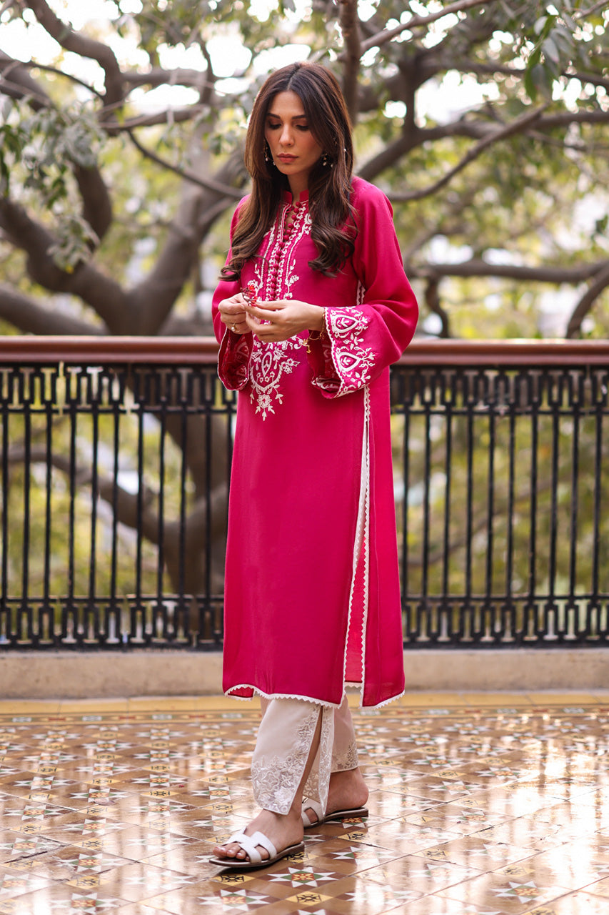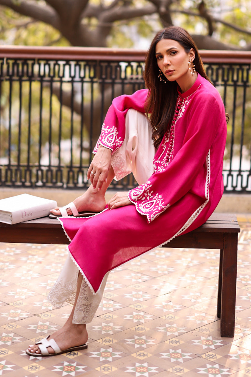 Feel the allure of pink accent with this flamboyant khaddi silk knee length shirt decorated with Ari worked geometric and floral motifs on the neckline and sleeves. Paired along are white khaddi cotton pants finished with mesmeriing embroidery to enchant the whole look!