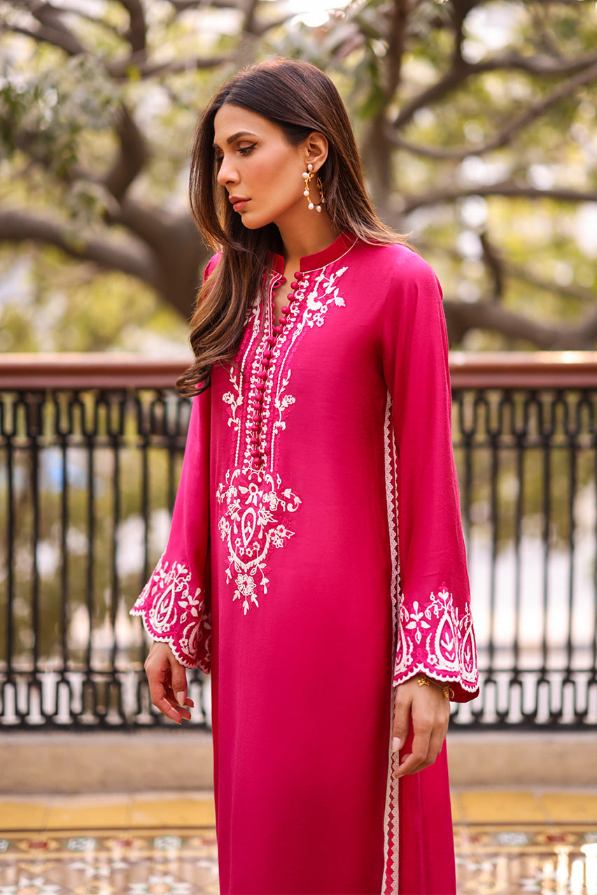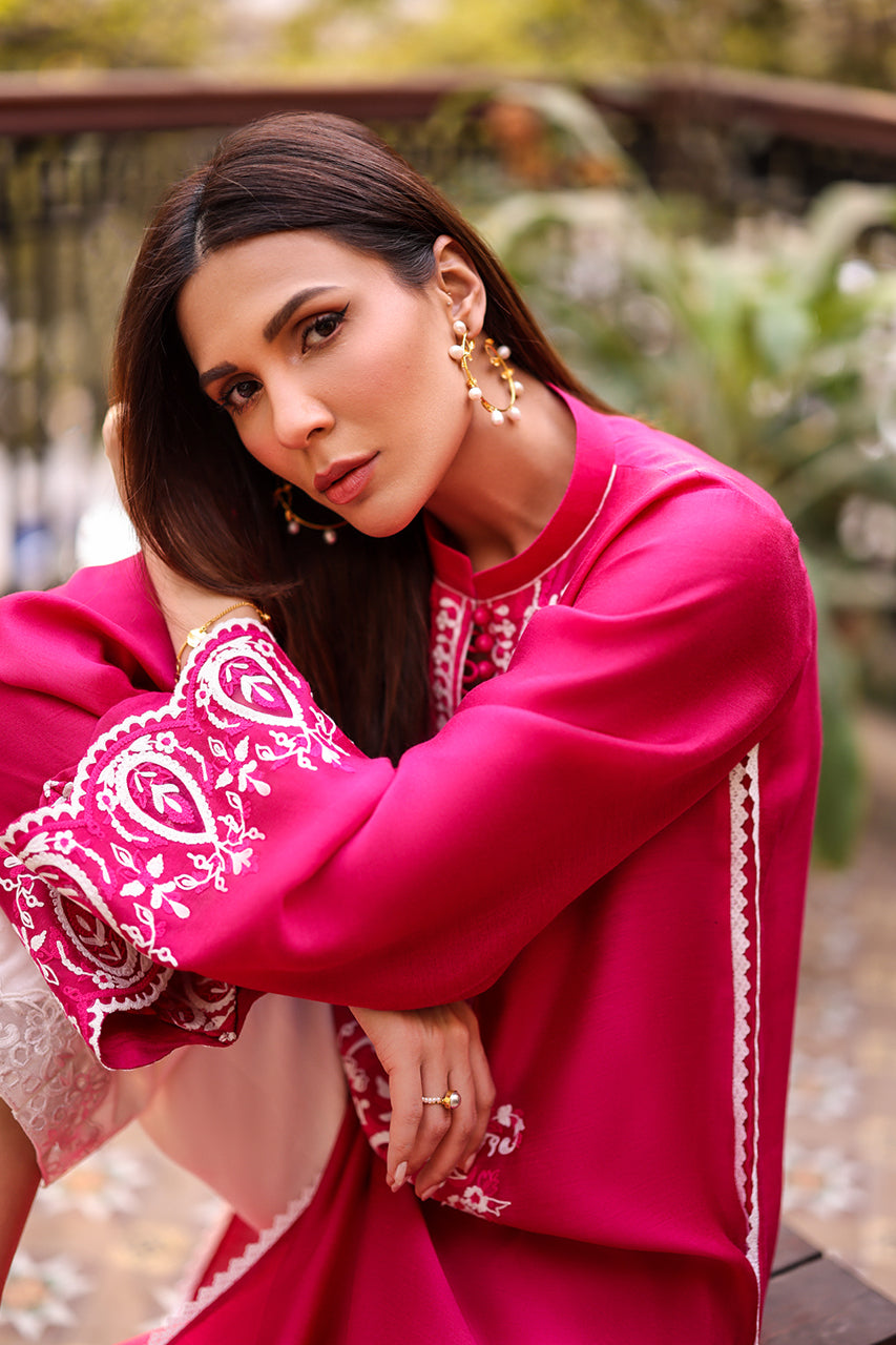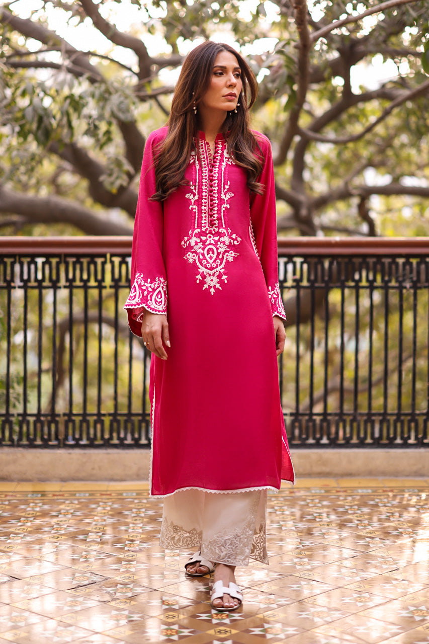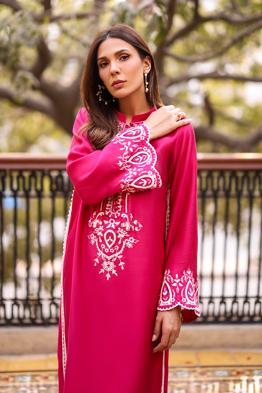 Feel the allure of pink accent with this flamboyant khaddi silk knee length shirt decorated with Ari worked geometric and floral motifs on the neckline and sleeves. Paired along are white khaddi cotton pants finished with mesmeriing embroidery to enchant the whole look!